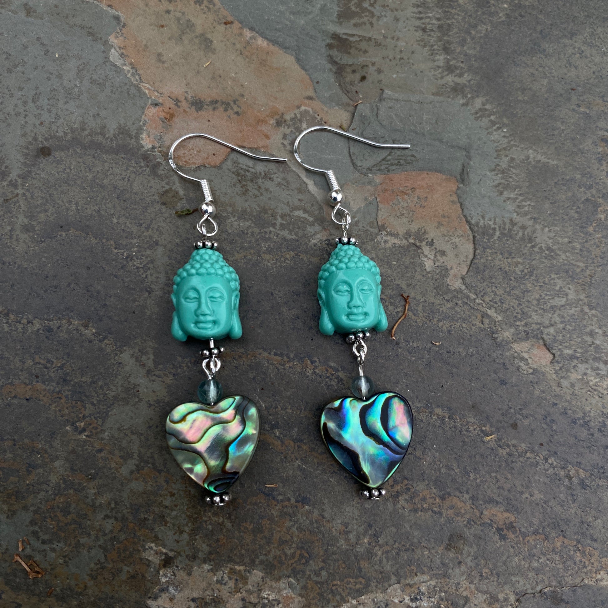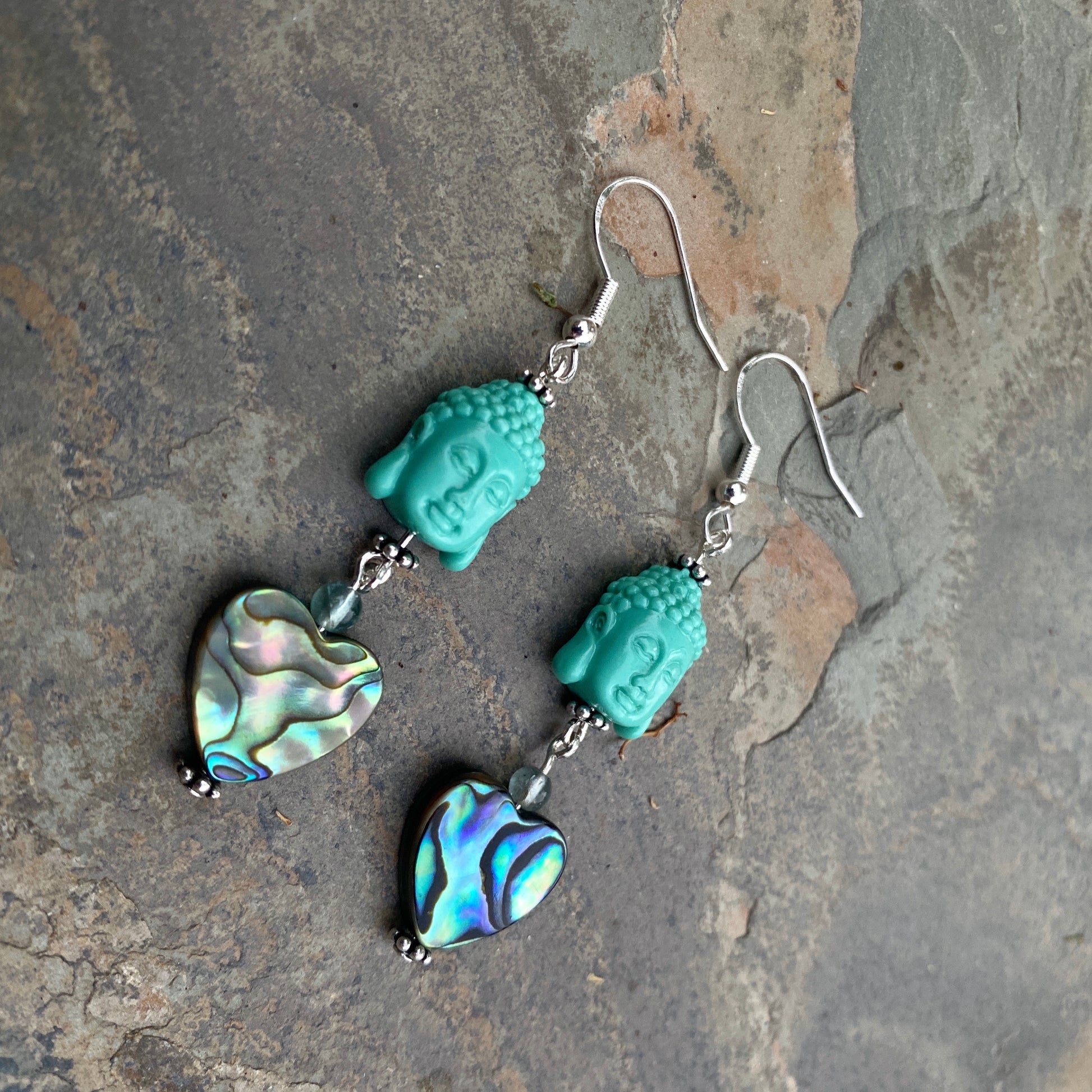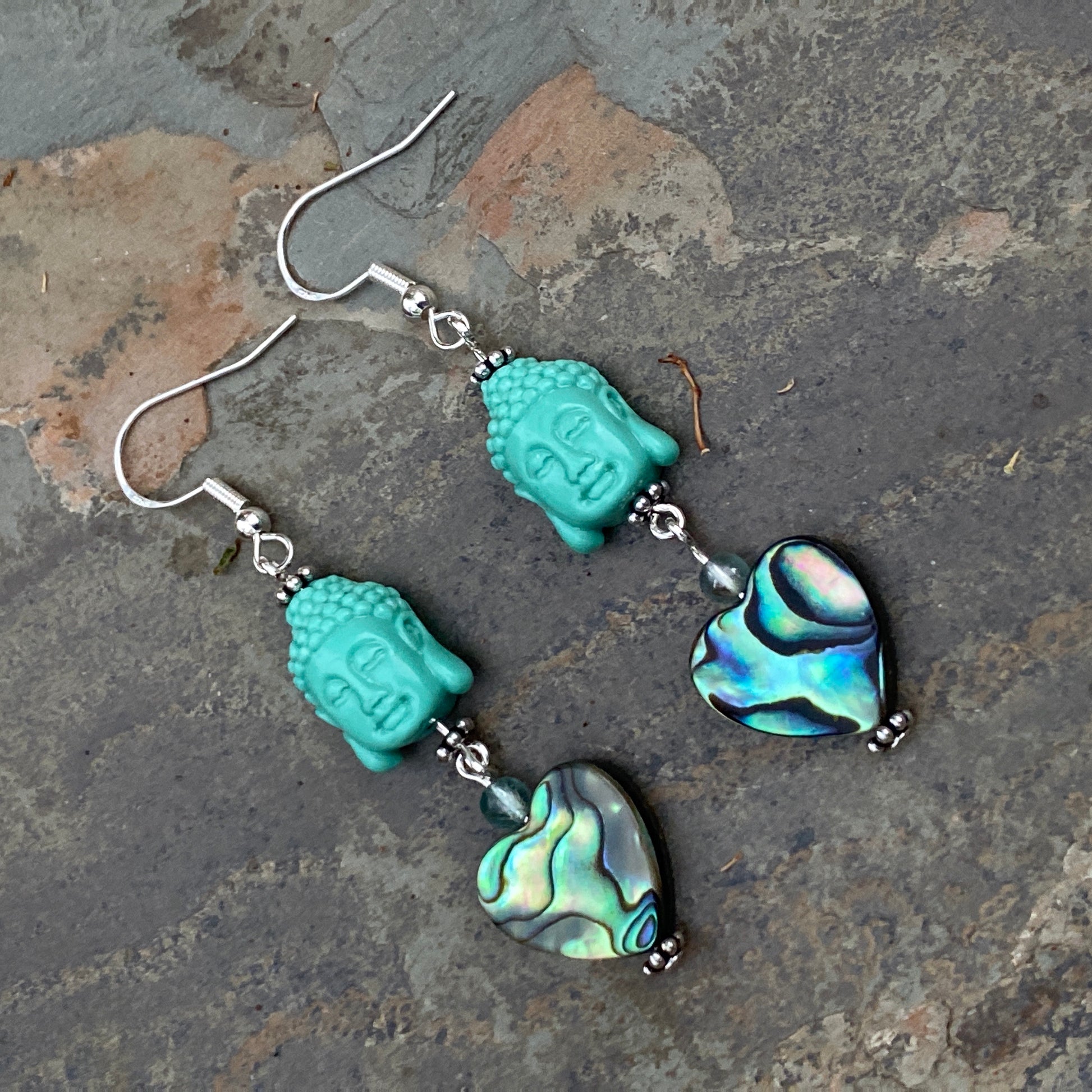 Coral Buddha Heads Abalone Heart sterling silver earrings