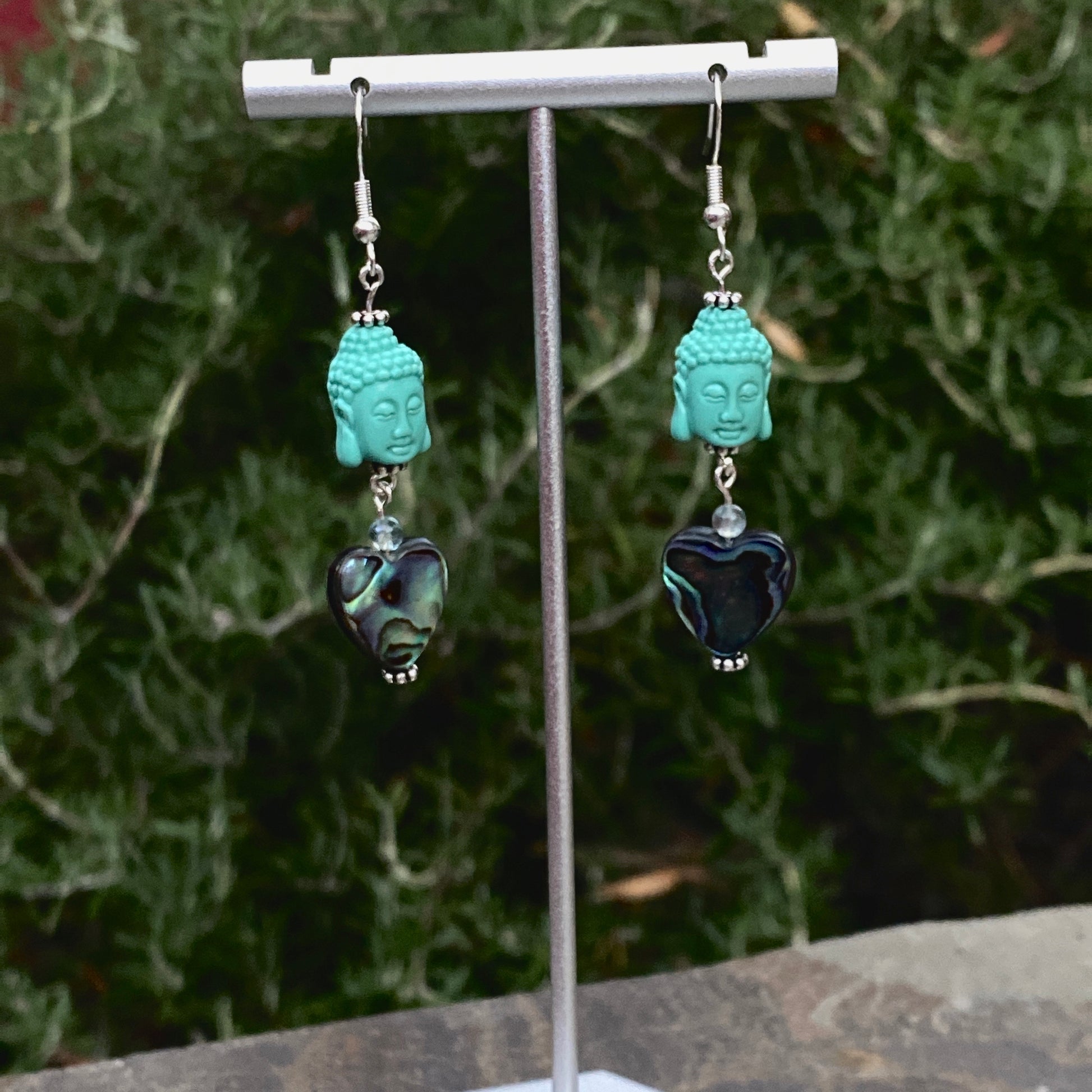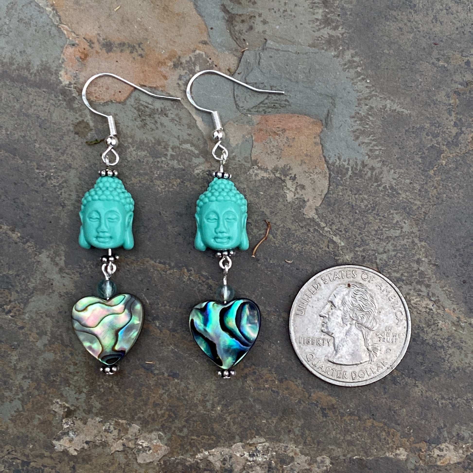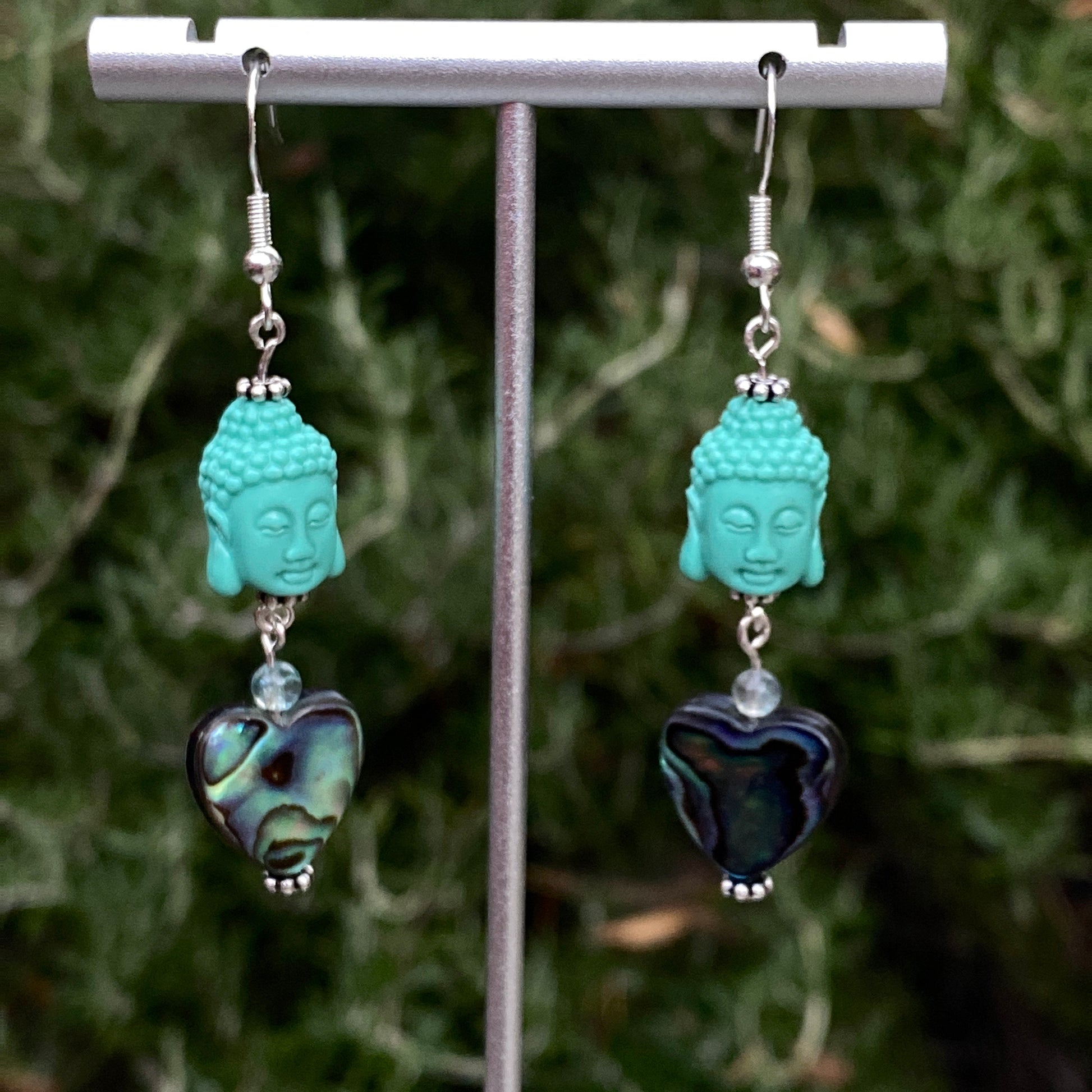 Coral Buddha Heads Abalone Heart sterling silver earrings