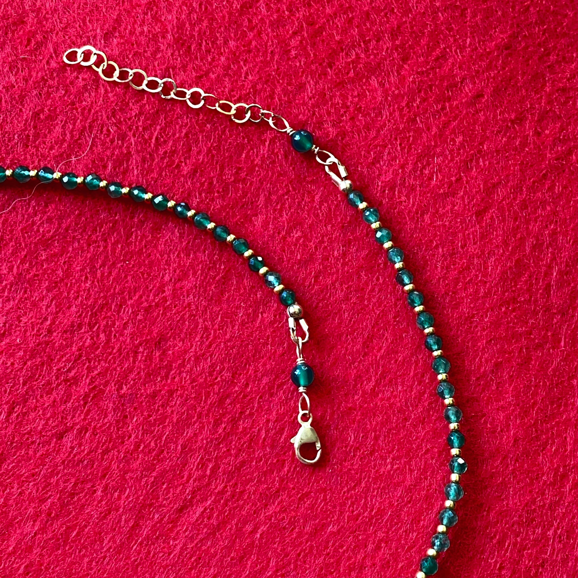 This fun necklace features a genuine green agate slice with matching green agate beads, all strung on a chain that’s 16" long plus an extra 2" extender for a total of 18". The gold beads are 24 kt gold-plated glass, so they shine bright without tarnishing—just keep them away from water to keep the sparkle alive. Made with real green agate and gold-filled metal, it’s a playful pop of nature’s beauty you can wear every day!