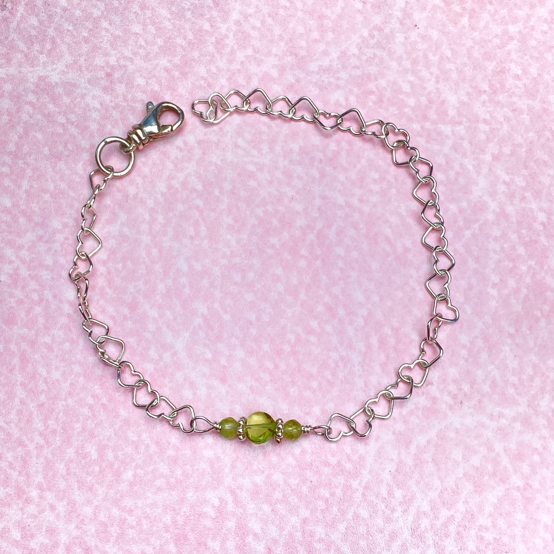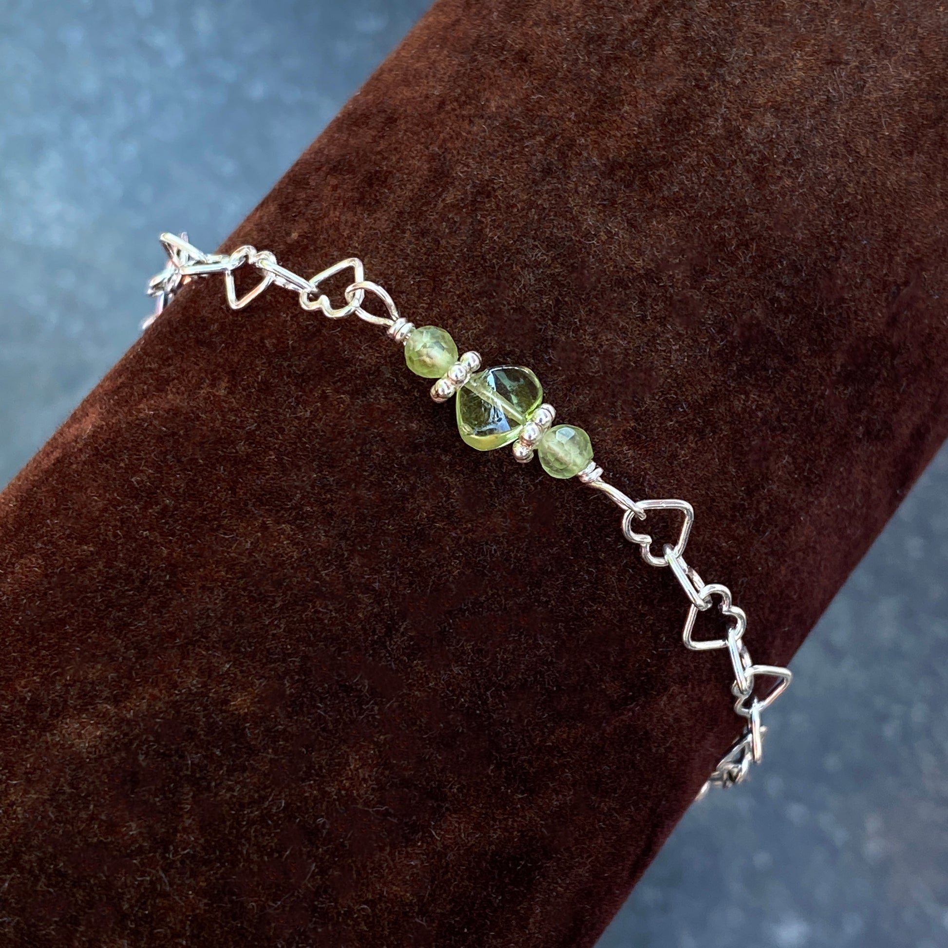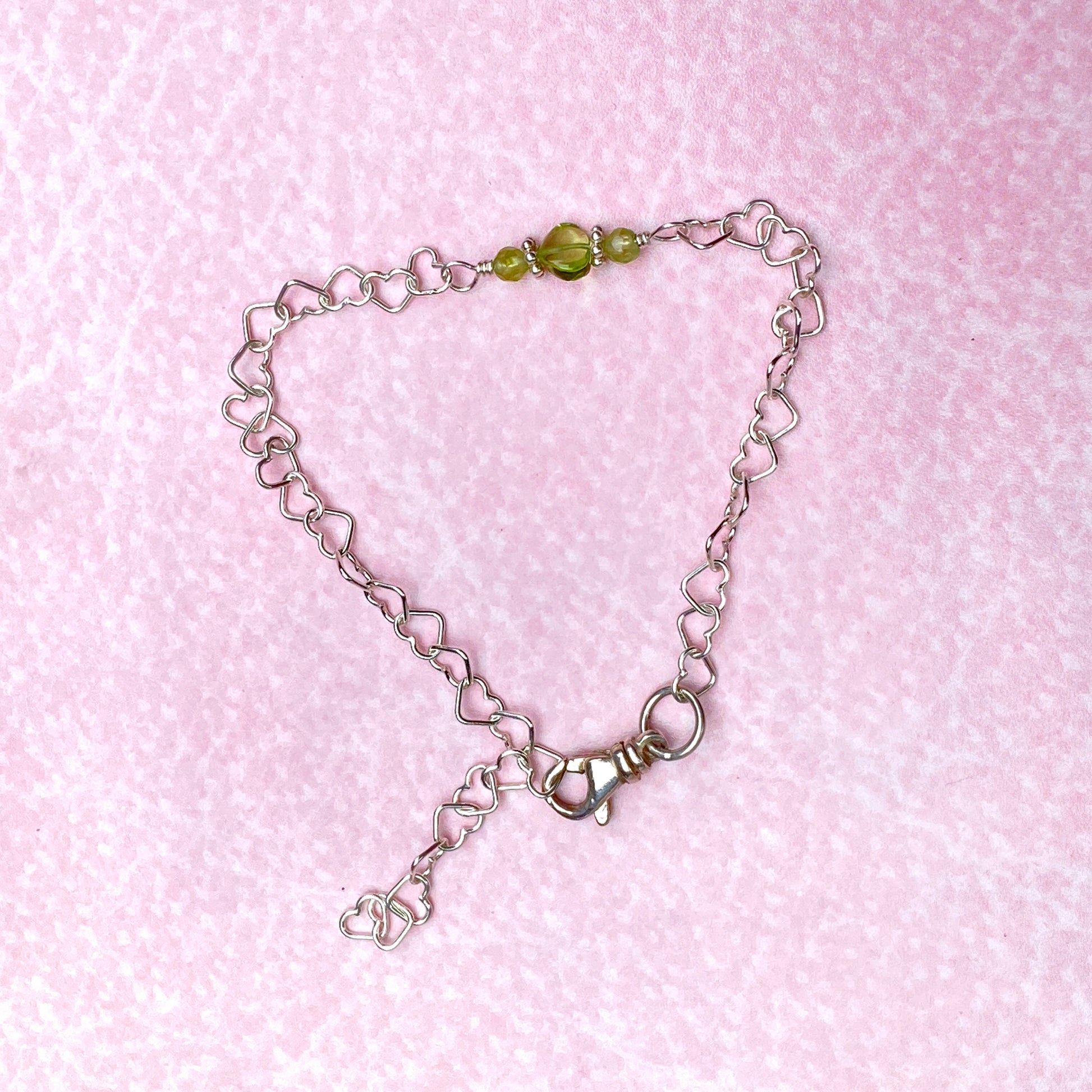Peridot gemstone heart and silver heart chain bracelet with clasp