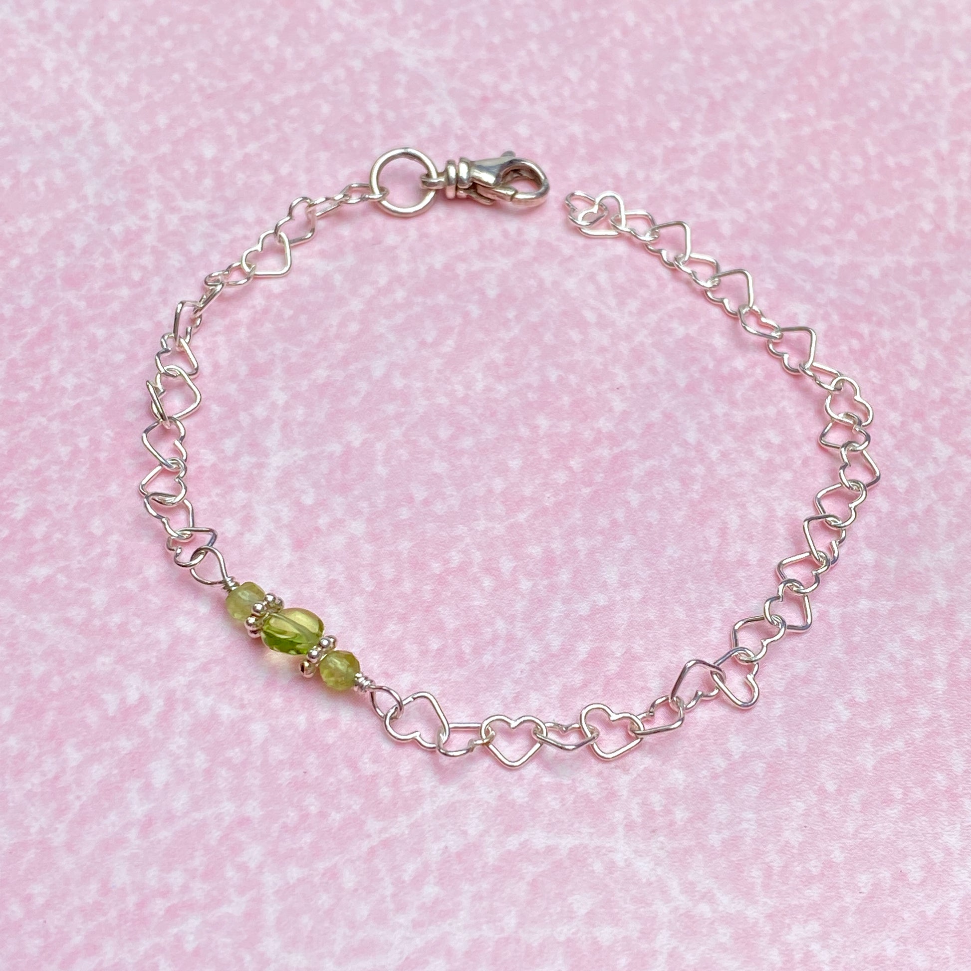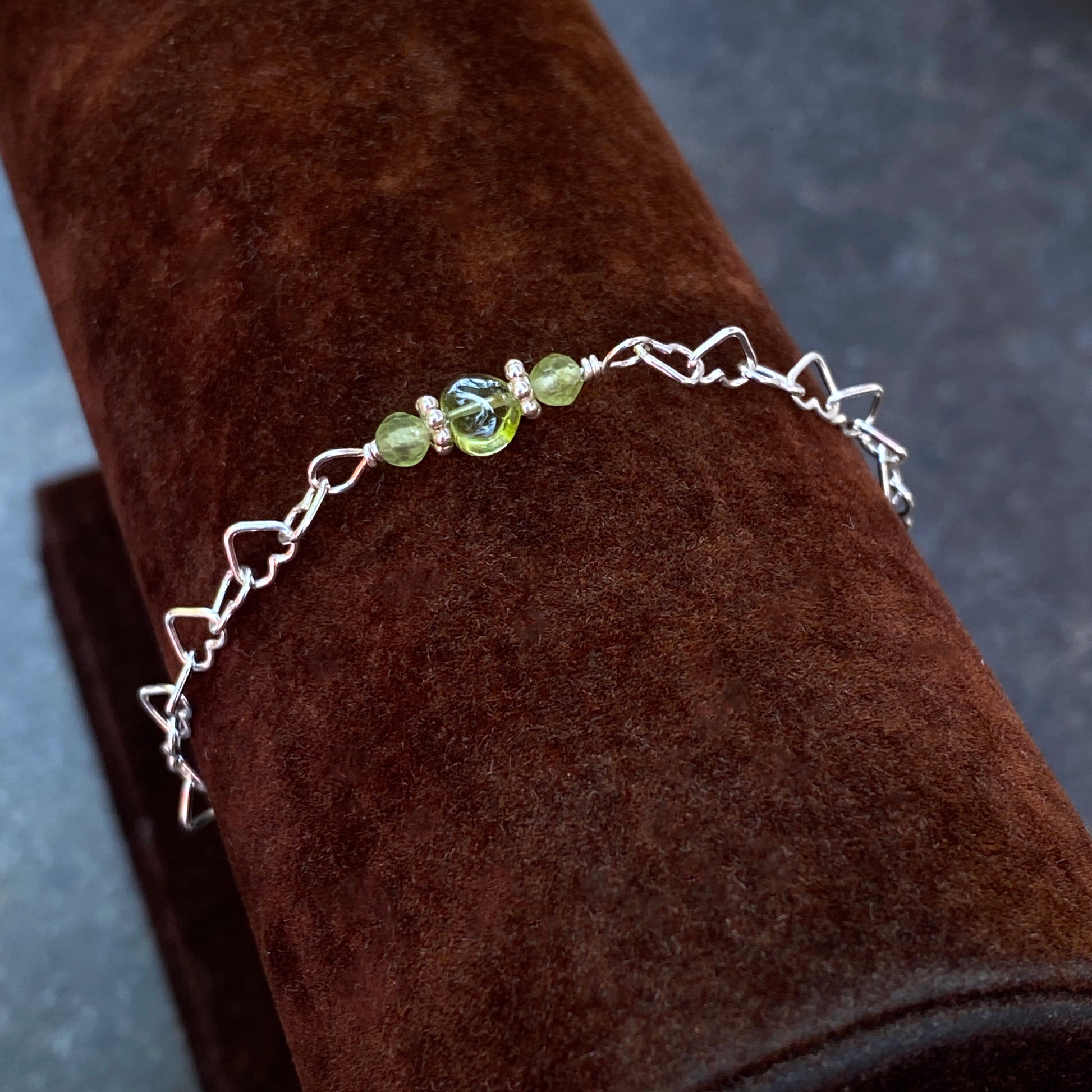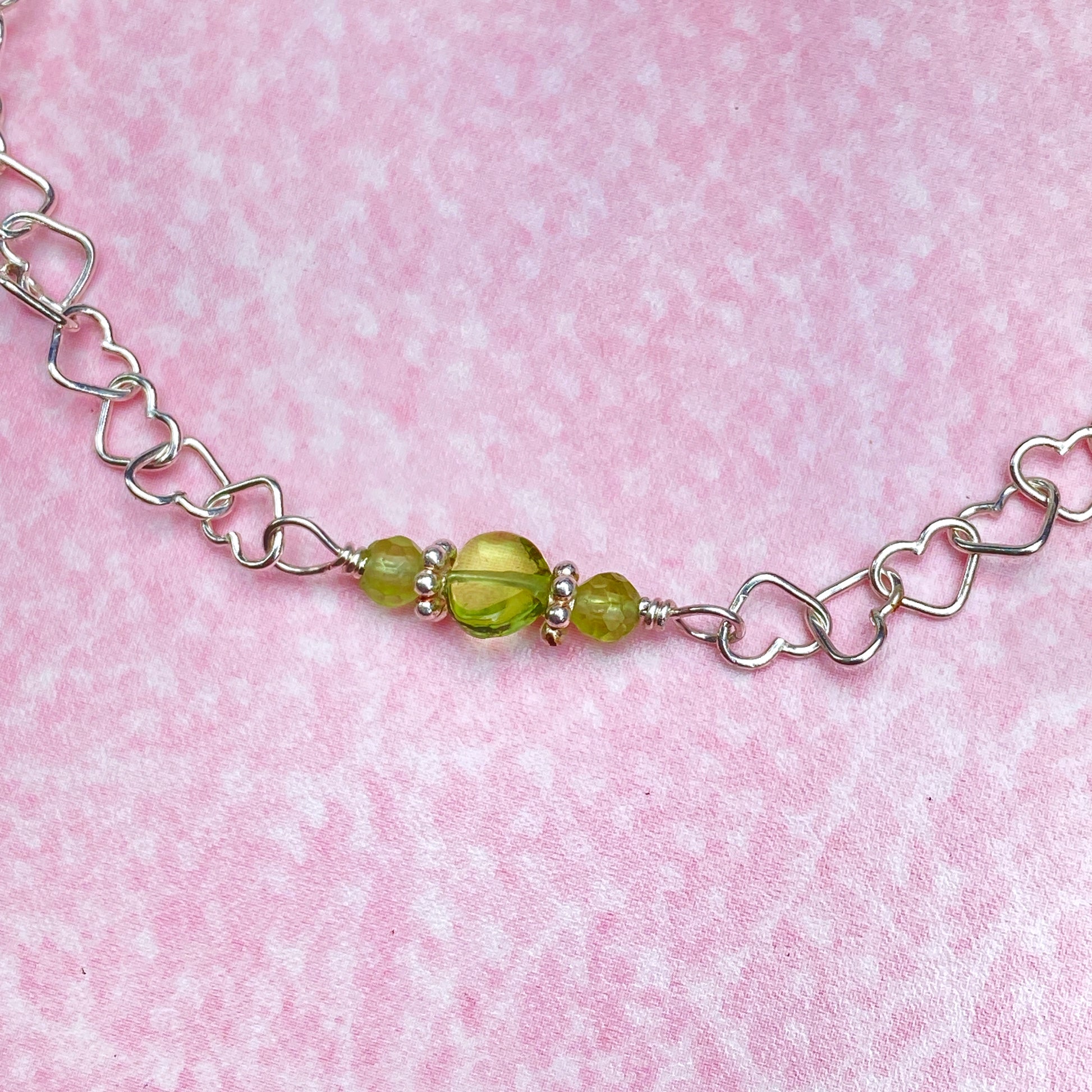 Peridot gemstone heart and silver heart chain bracelet with clasp
