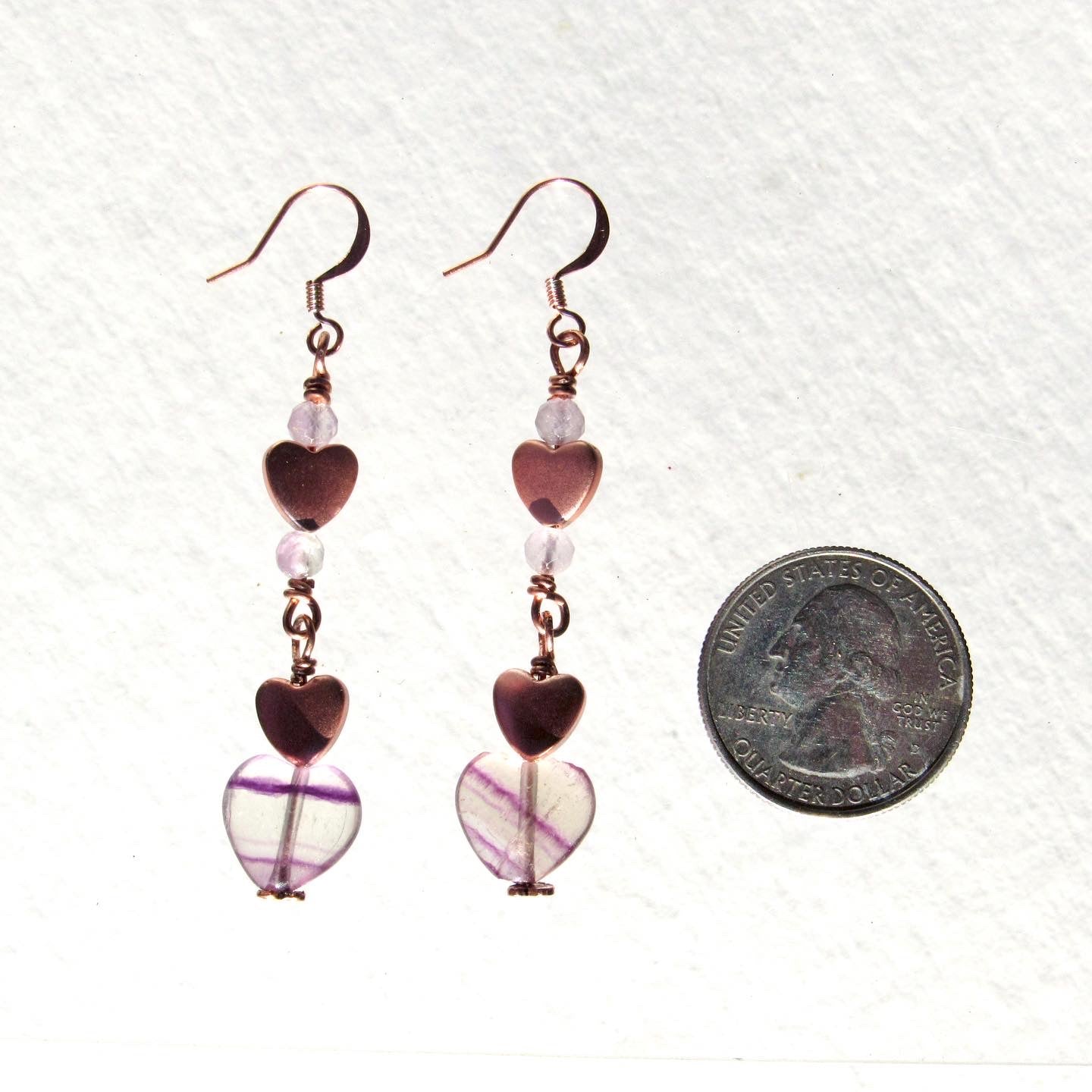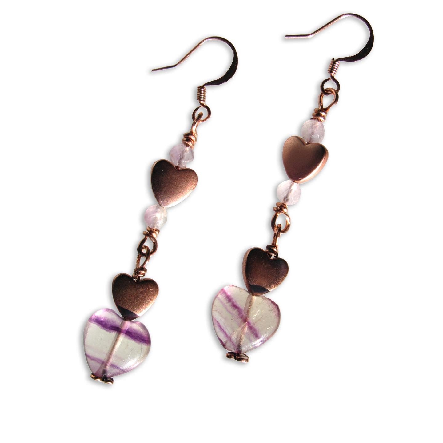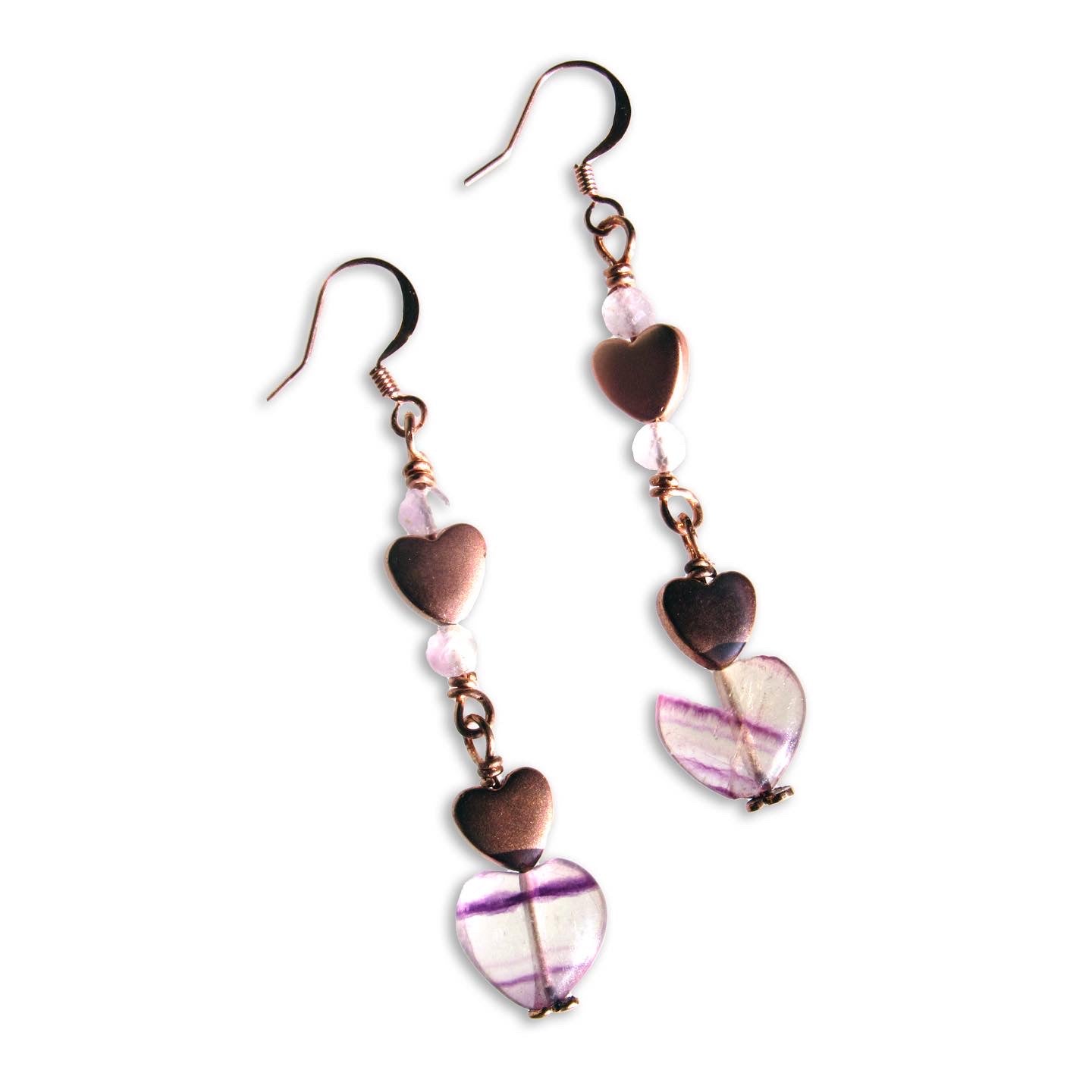 Fluorite and Hematite gemstone Dangle Heart earrings