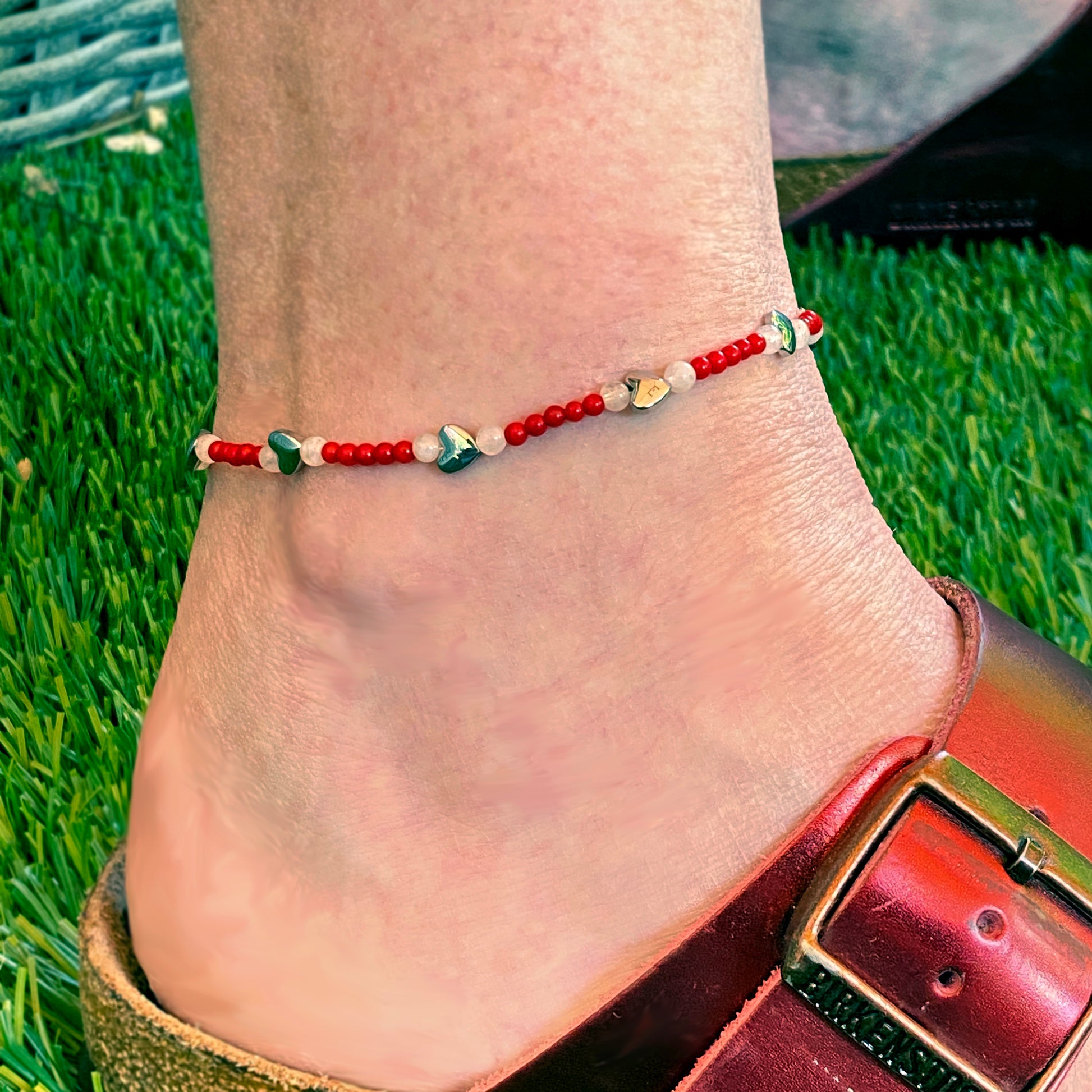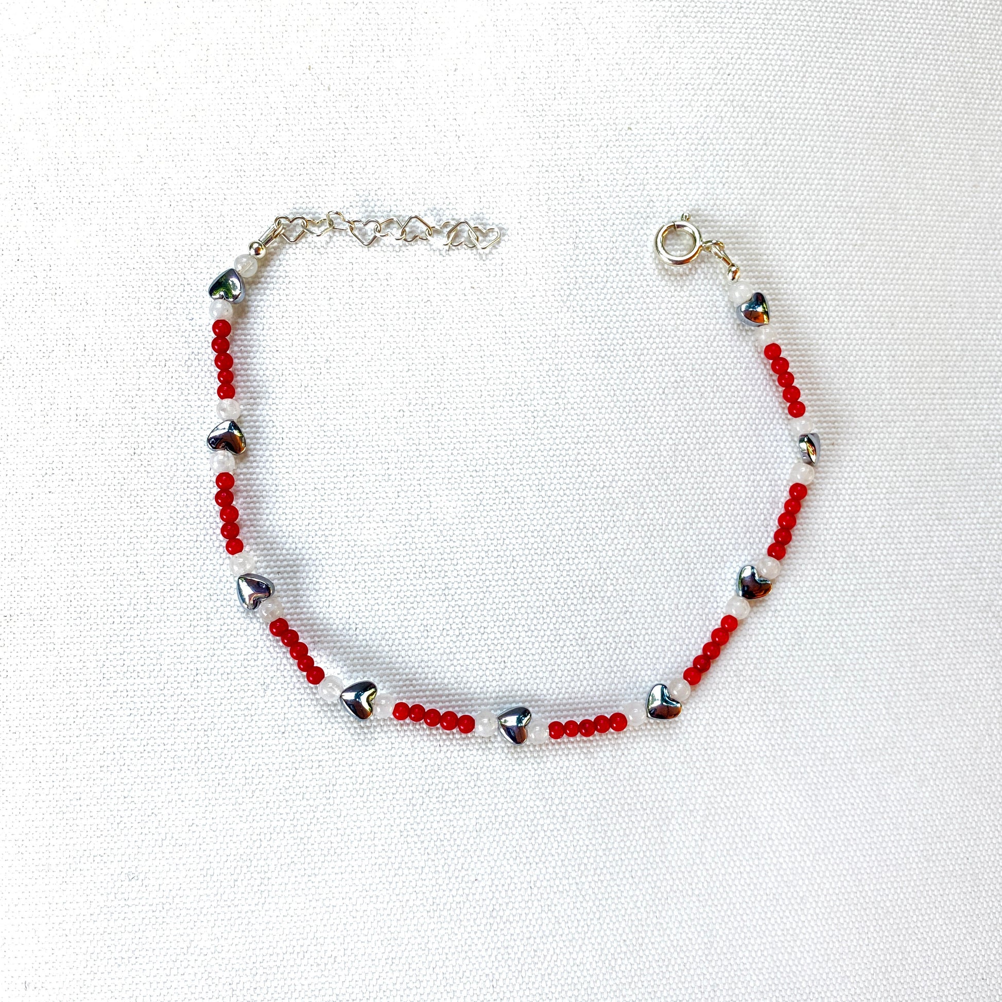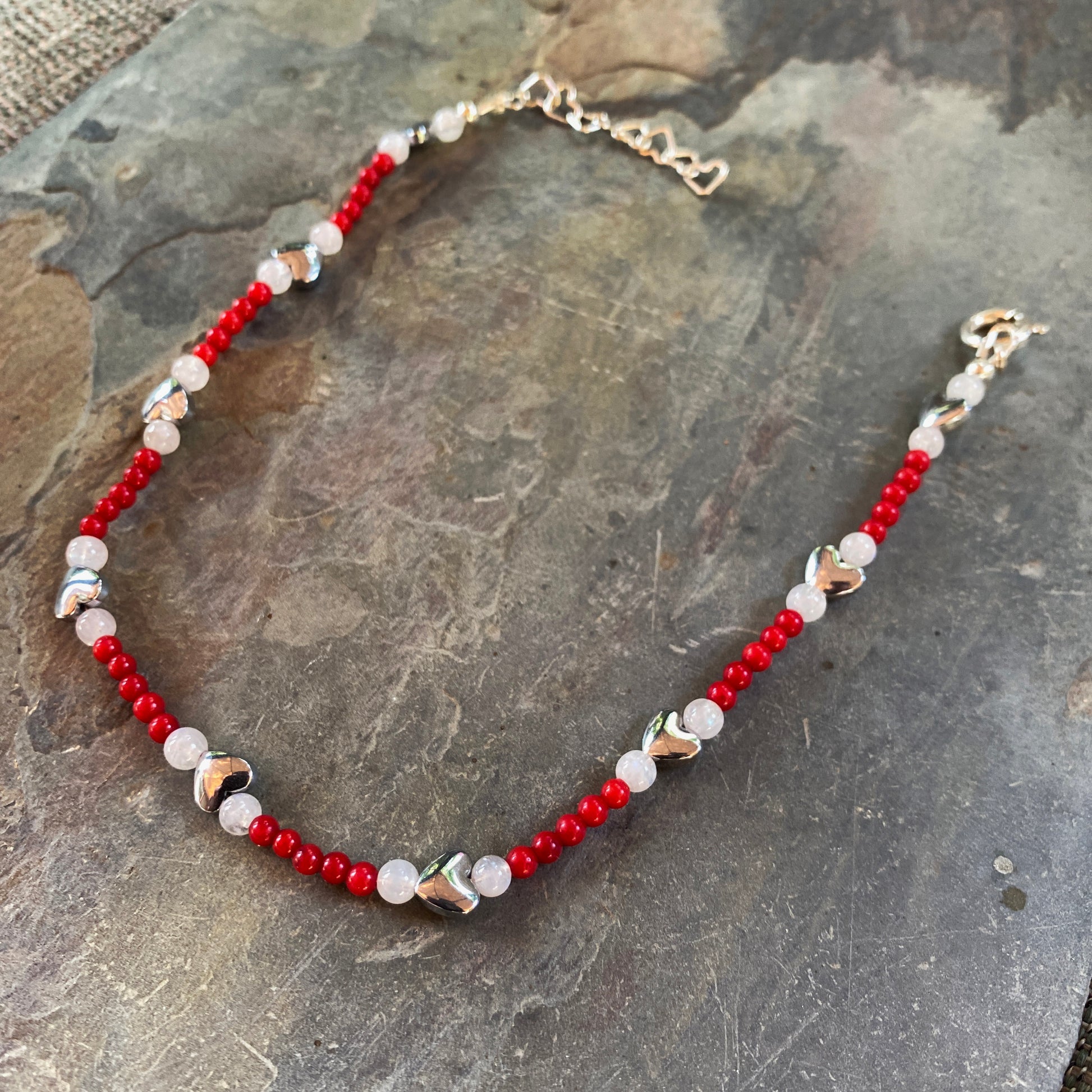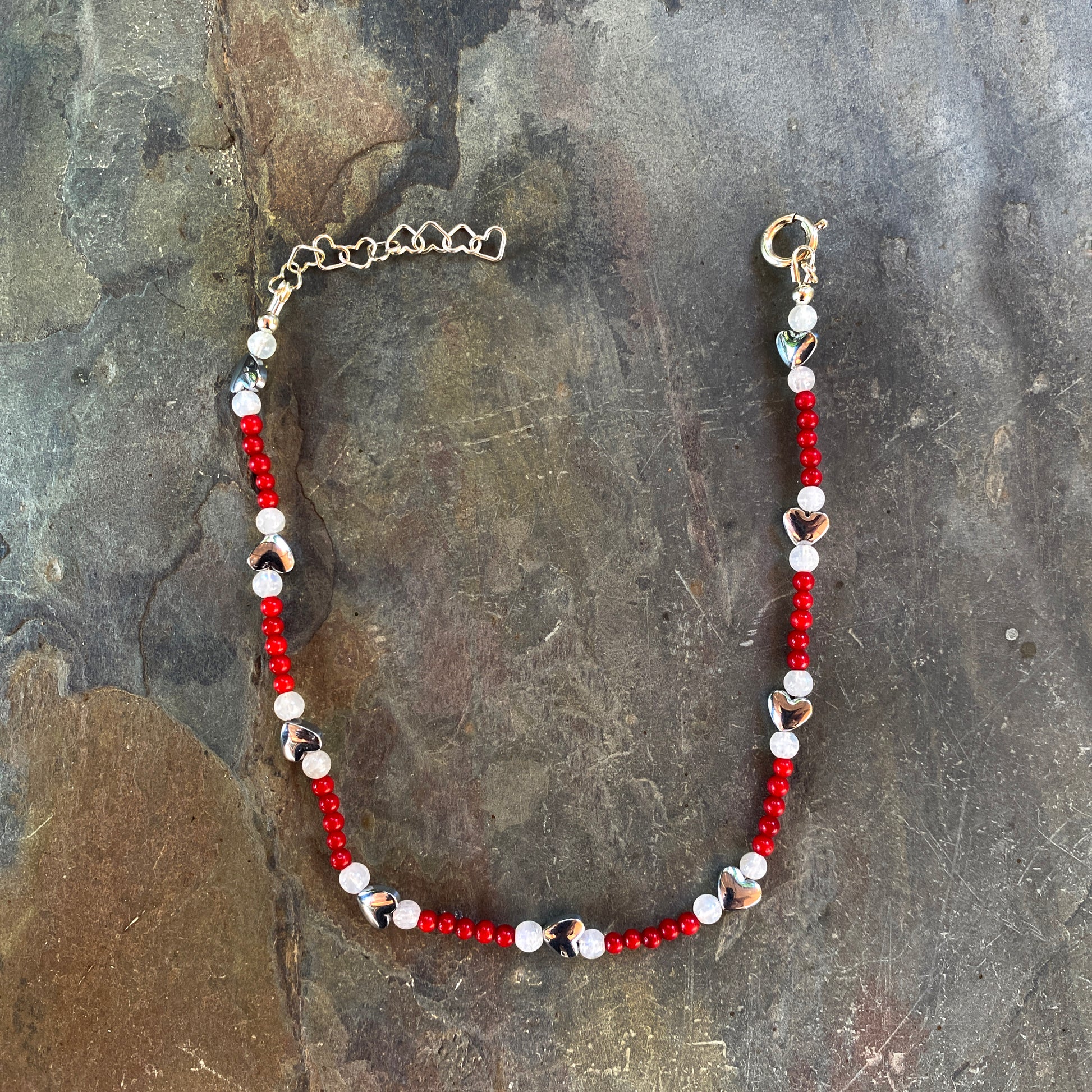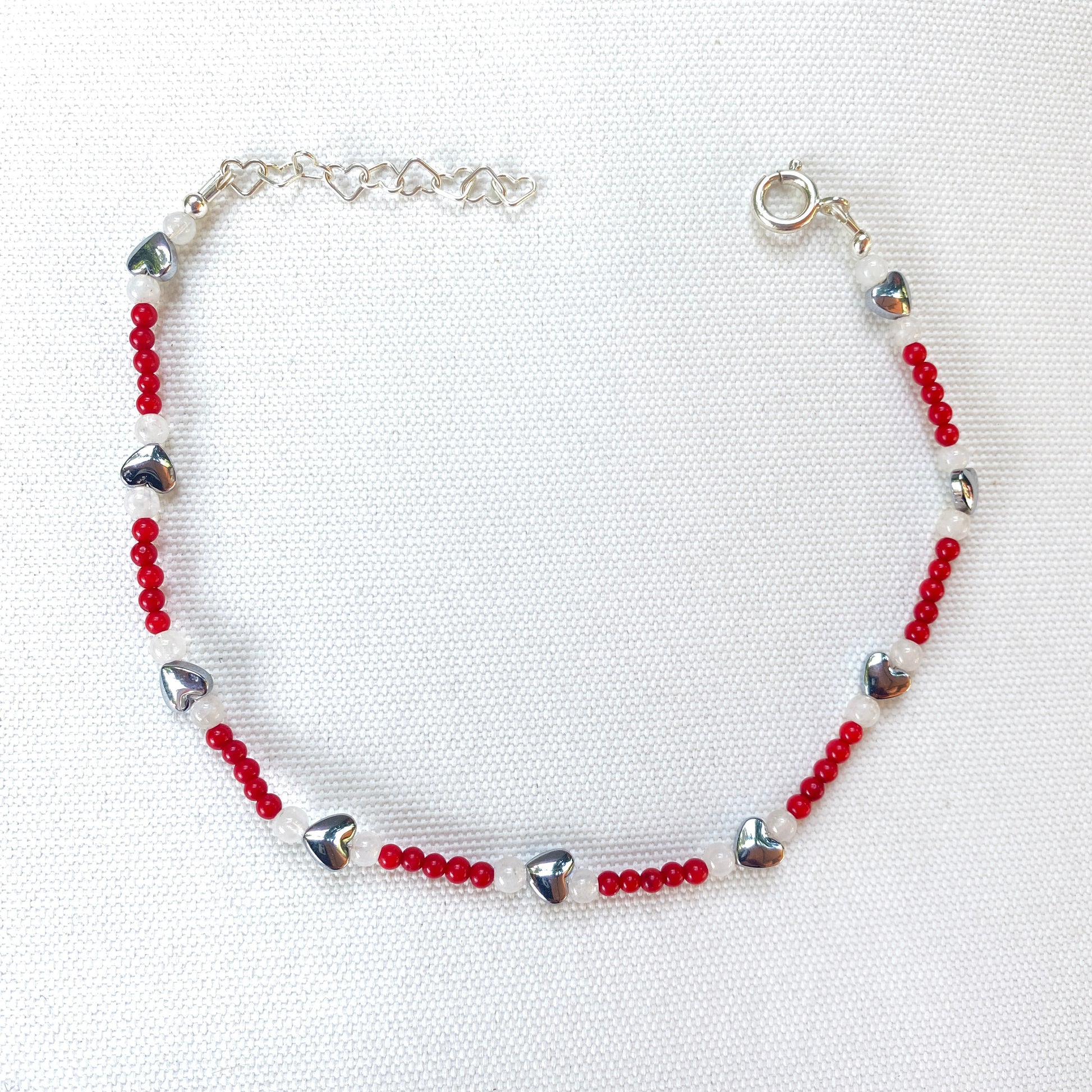 Coral, hematite heart and moonstone gemstone sterling silver anklet