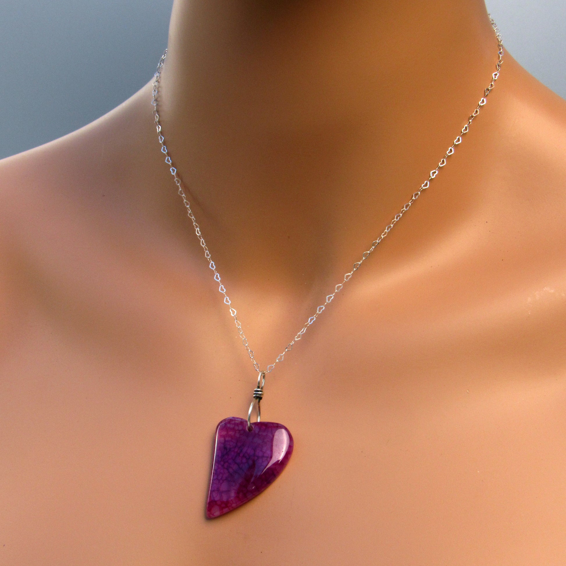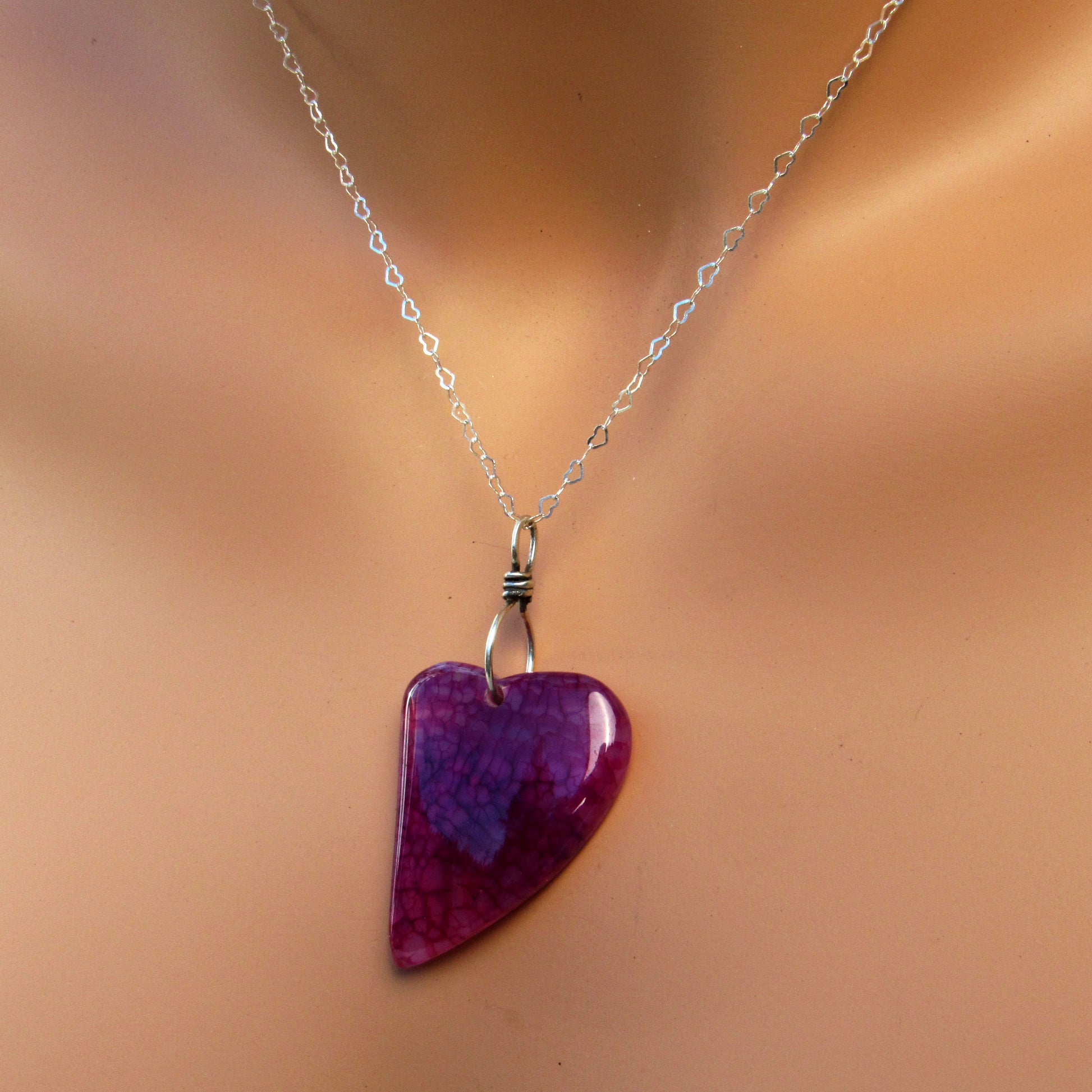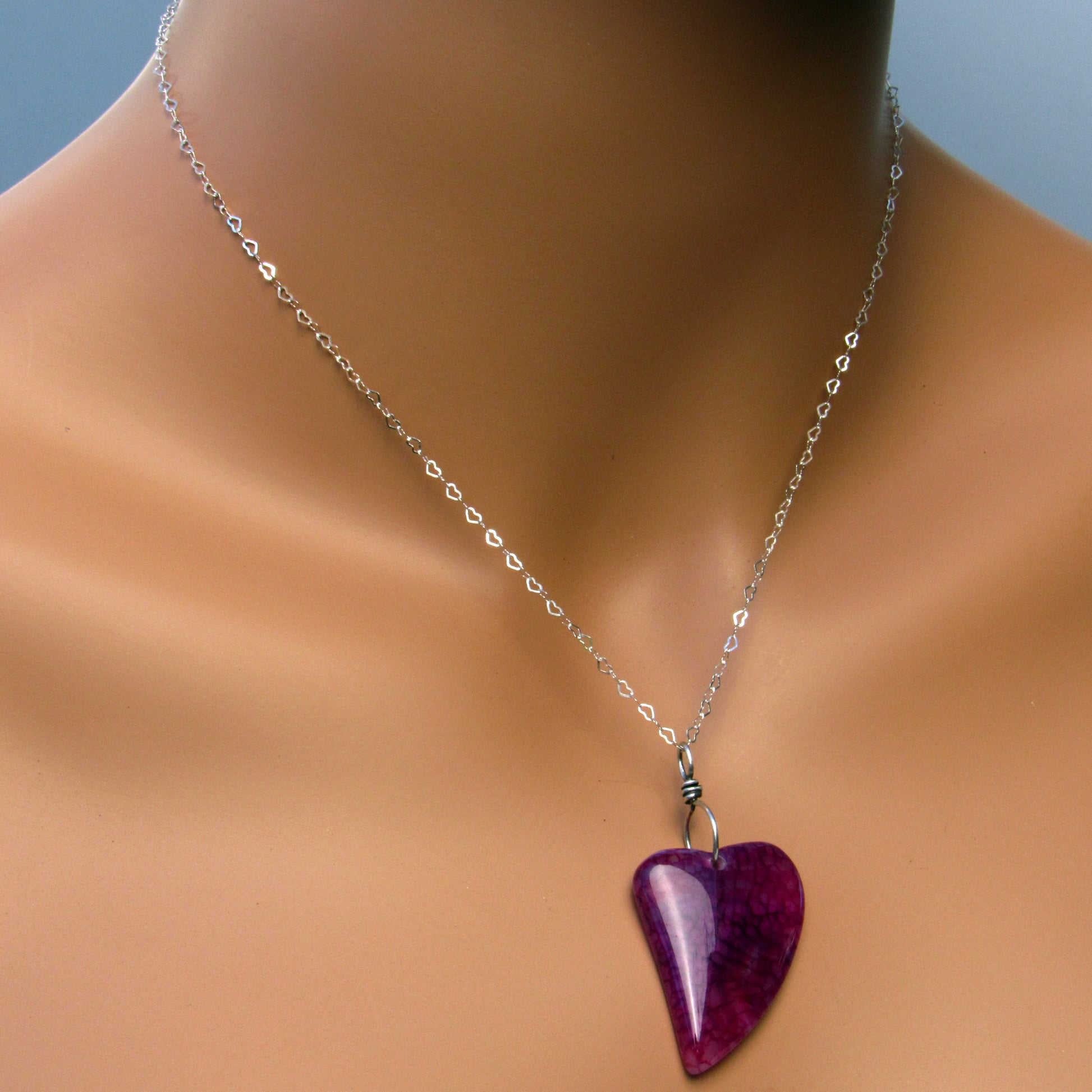 Dragon’s Vein Agate gemstone Heart on Sterling Silver Chain with Lots of hearts