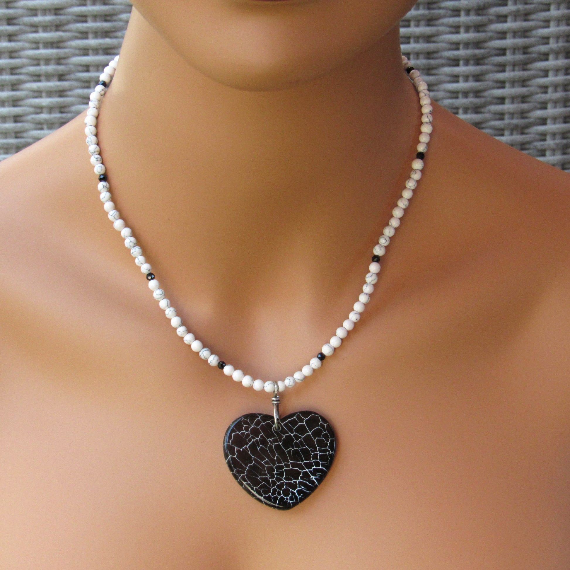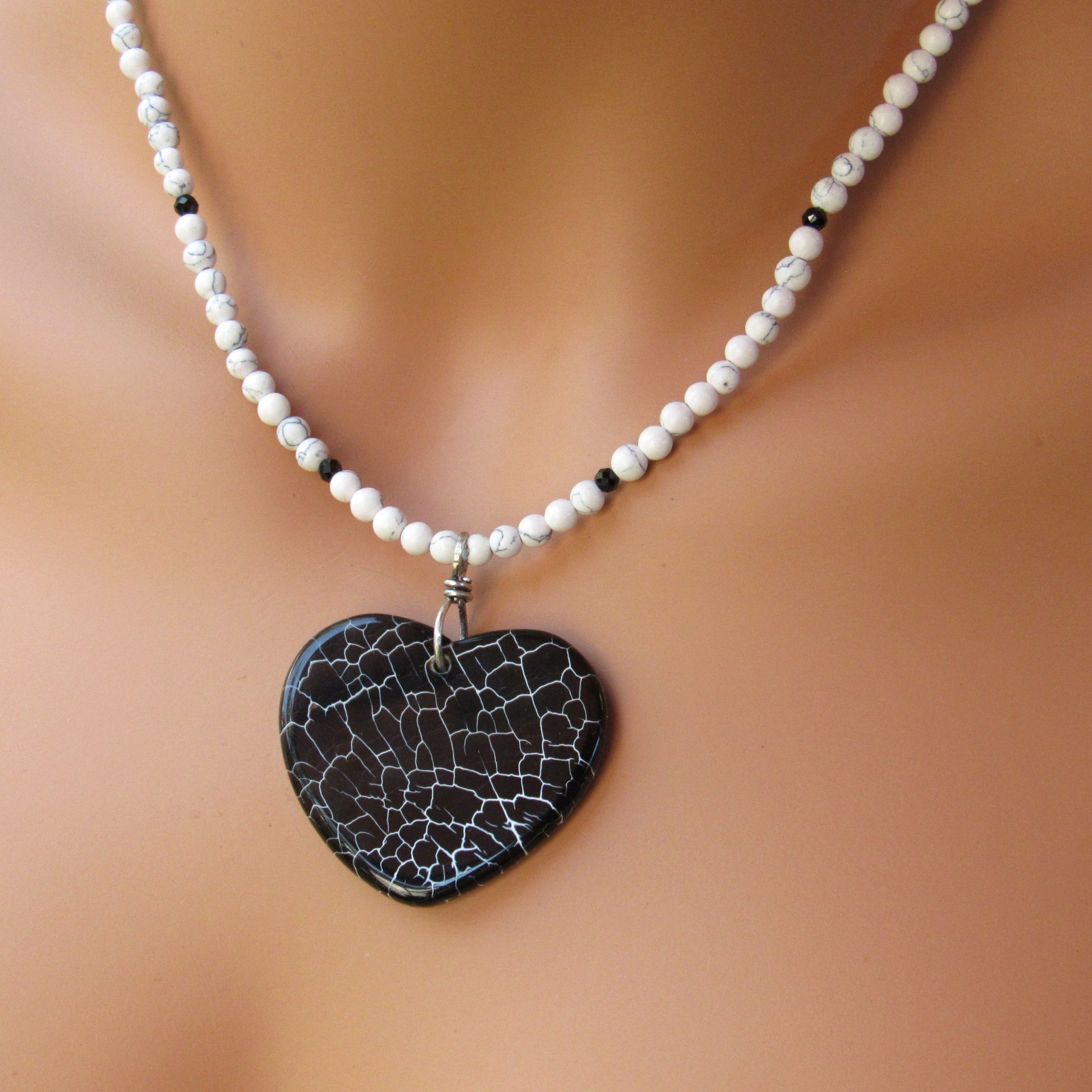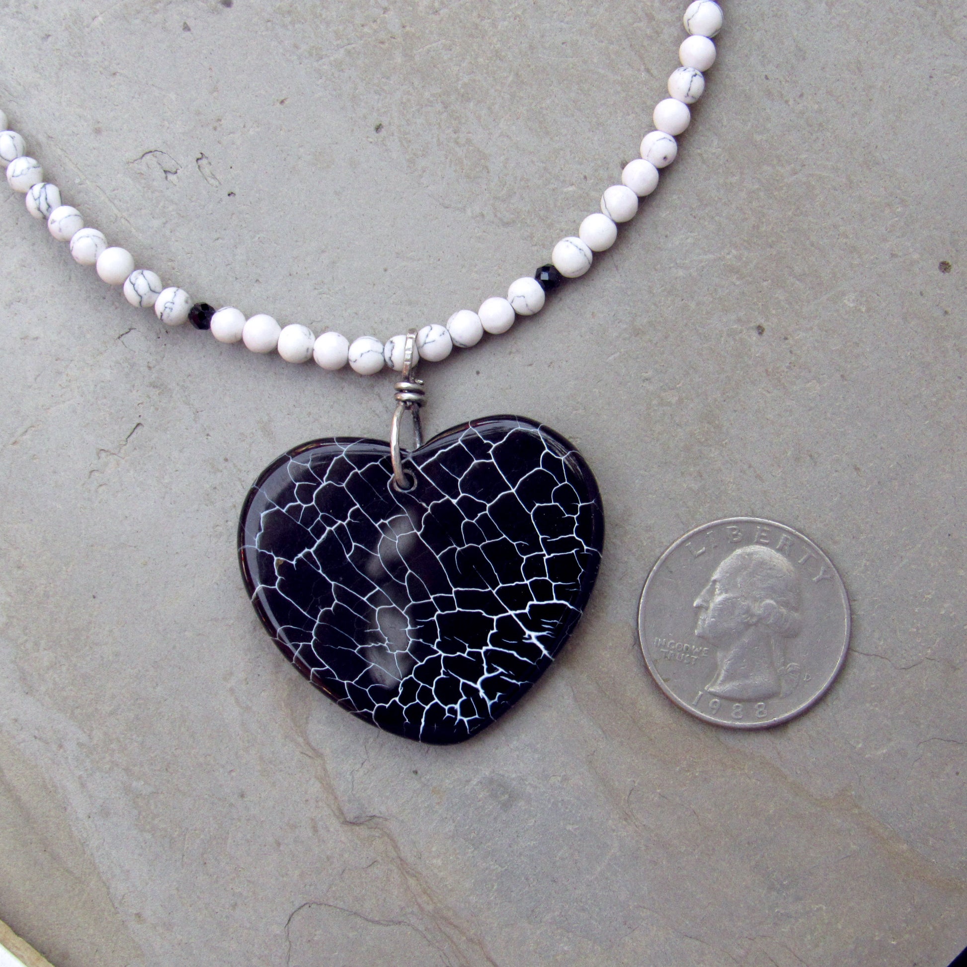 Dragon’s Vein Agate Heart on White Turquoise with Black Spinel and Sterling Silver