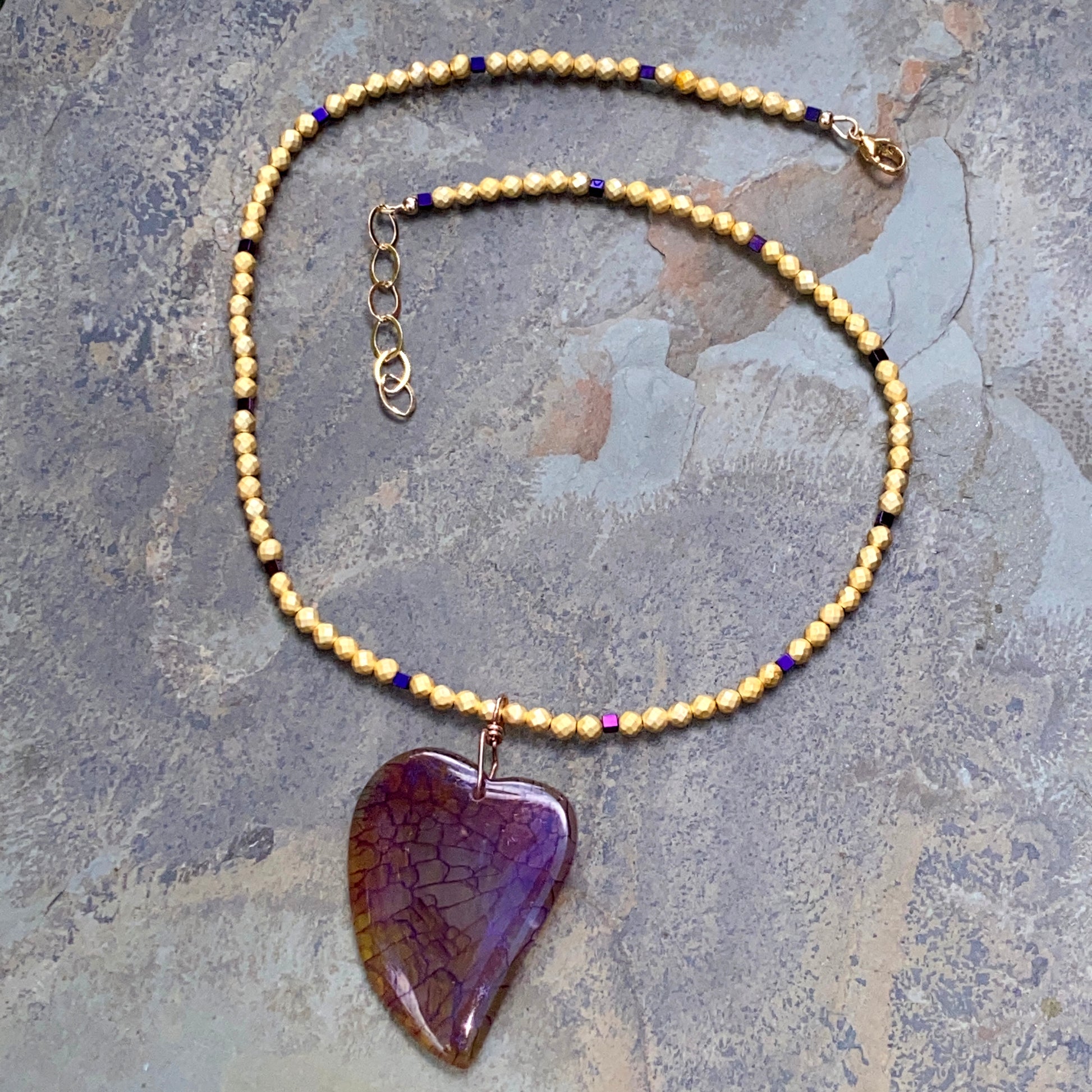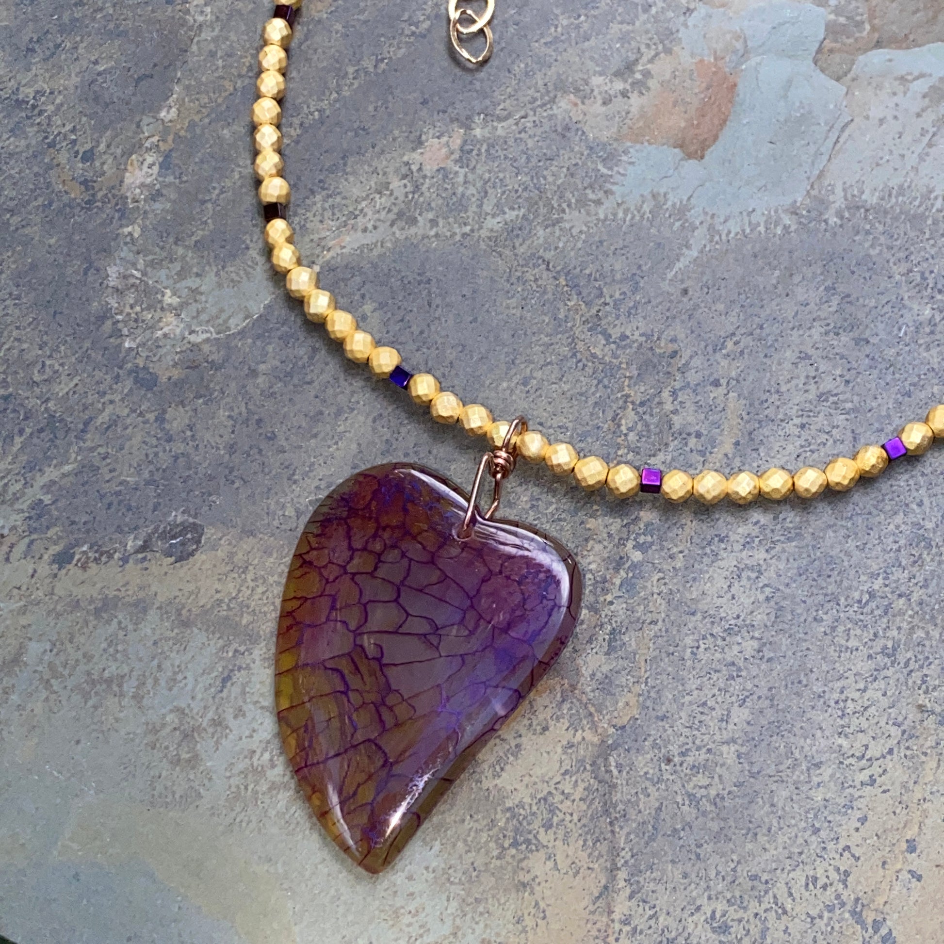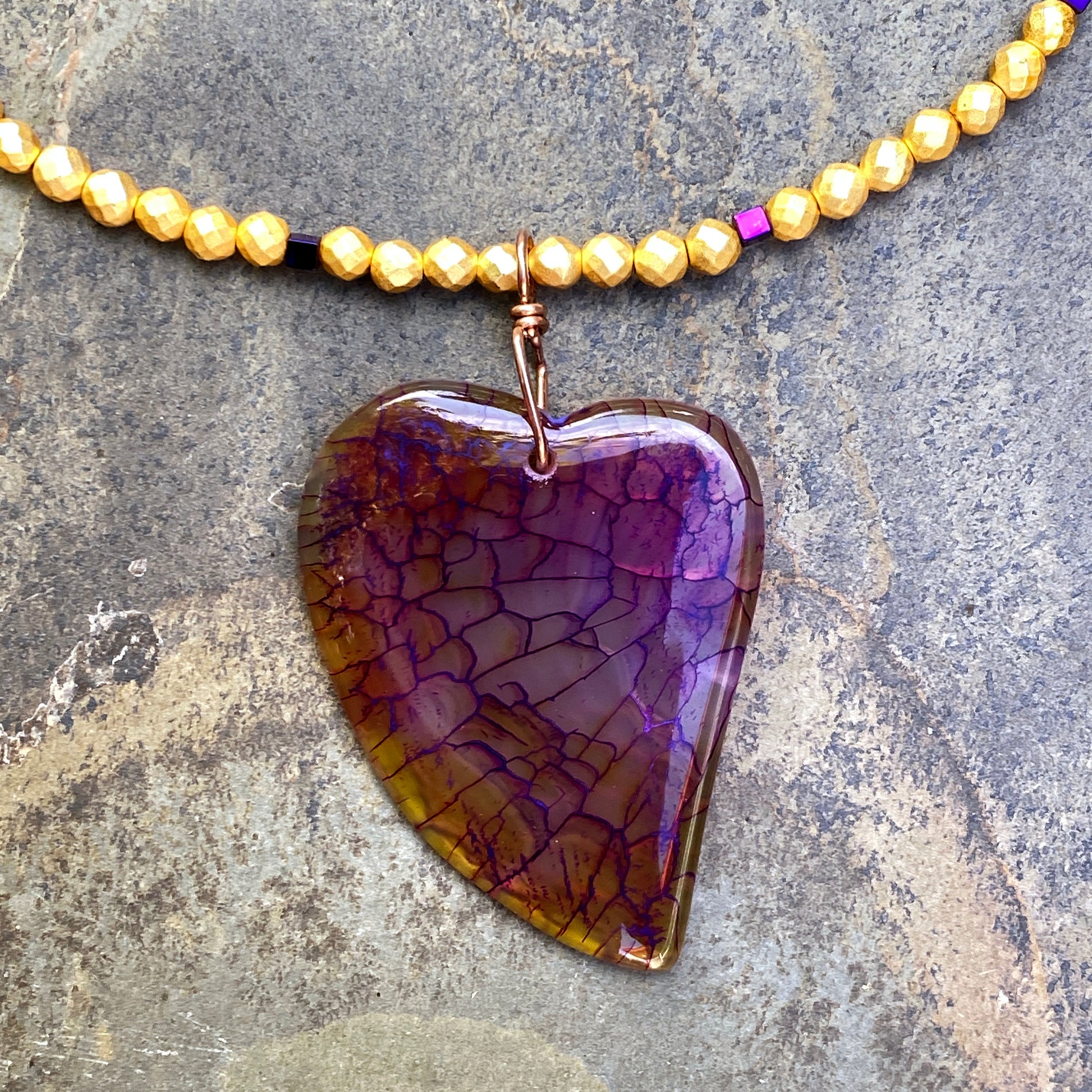 Dragon’s Vein Heart Pendant on Gold & Purple Hematite and 14 Kt GF Clasp