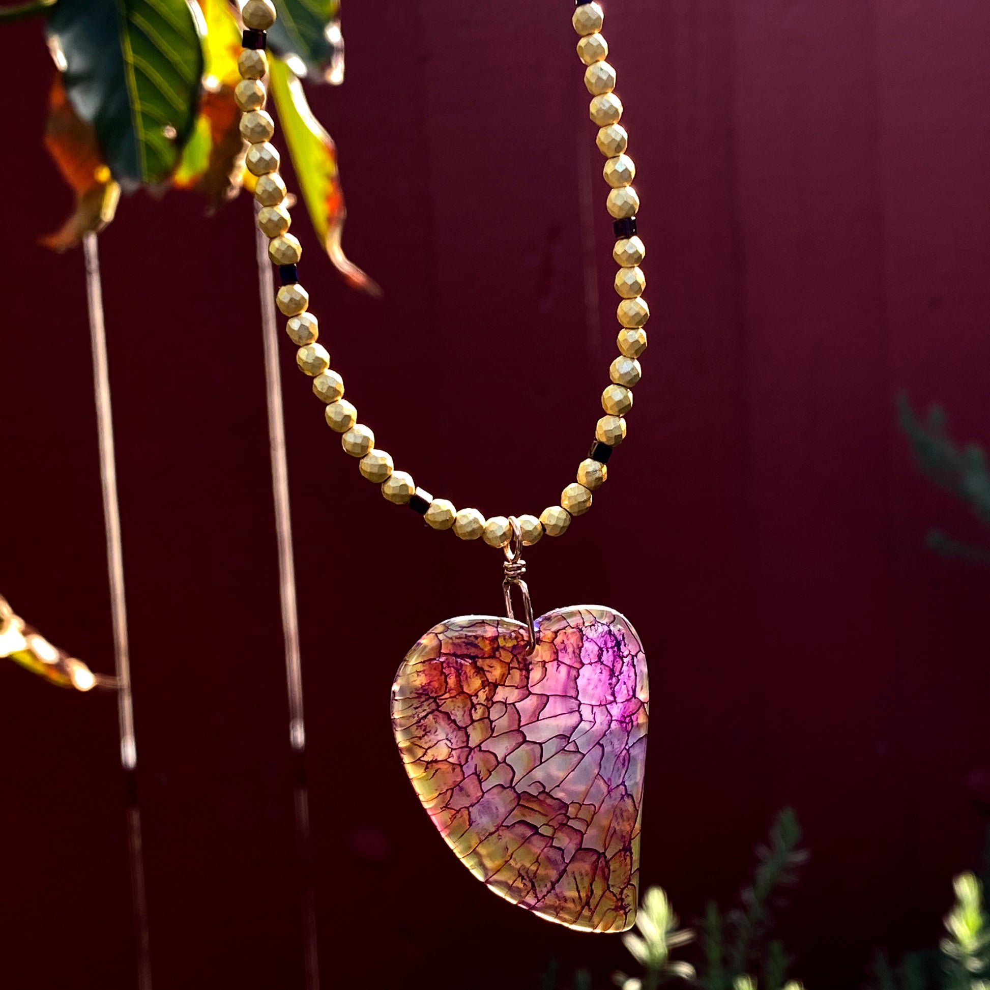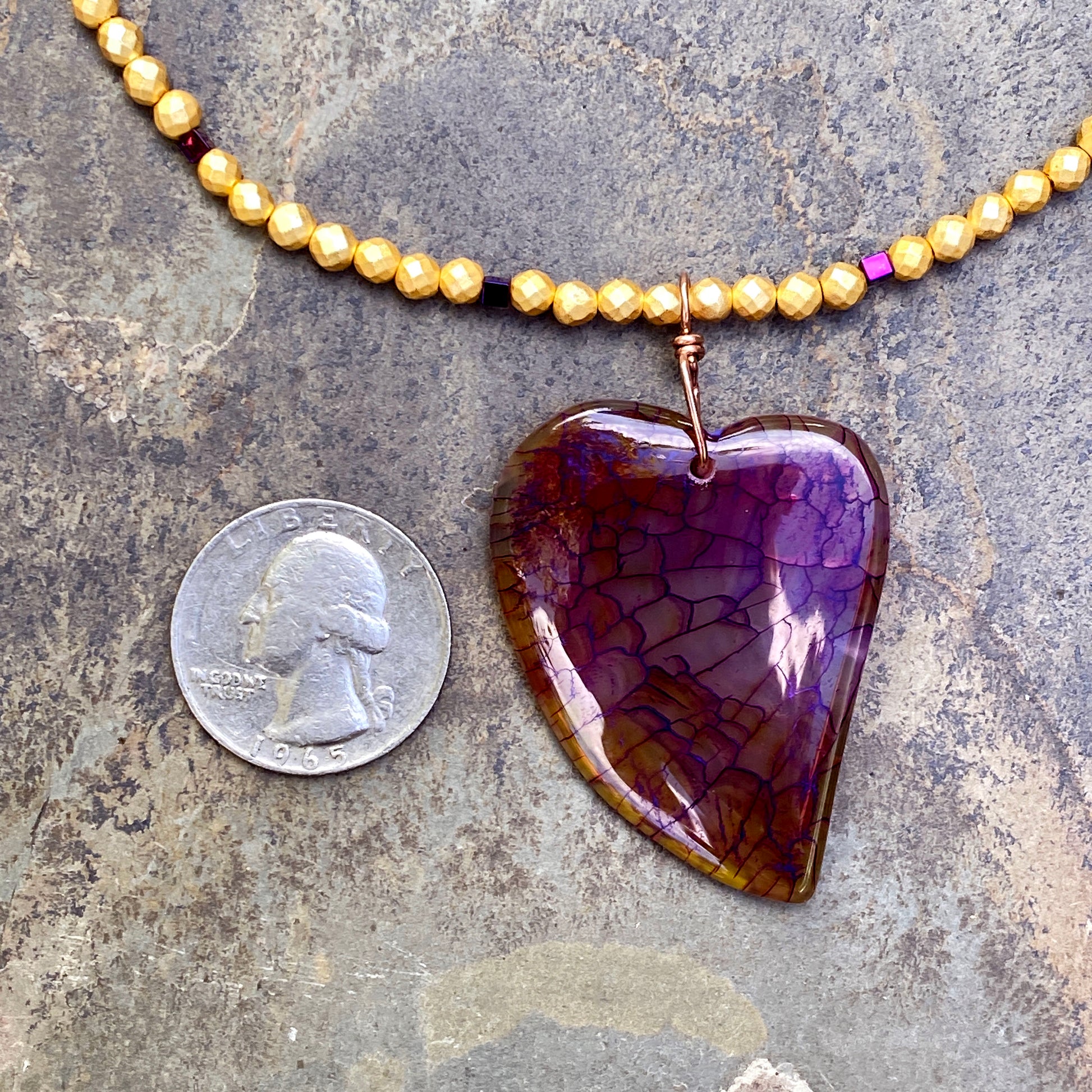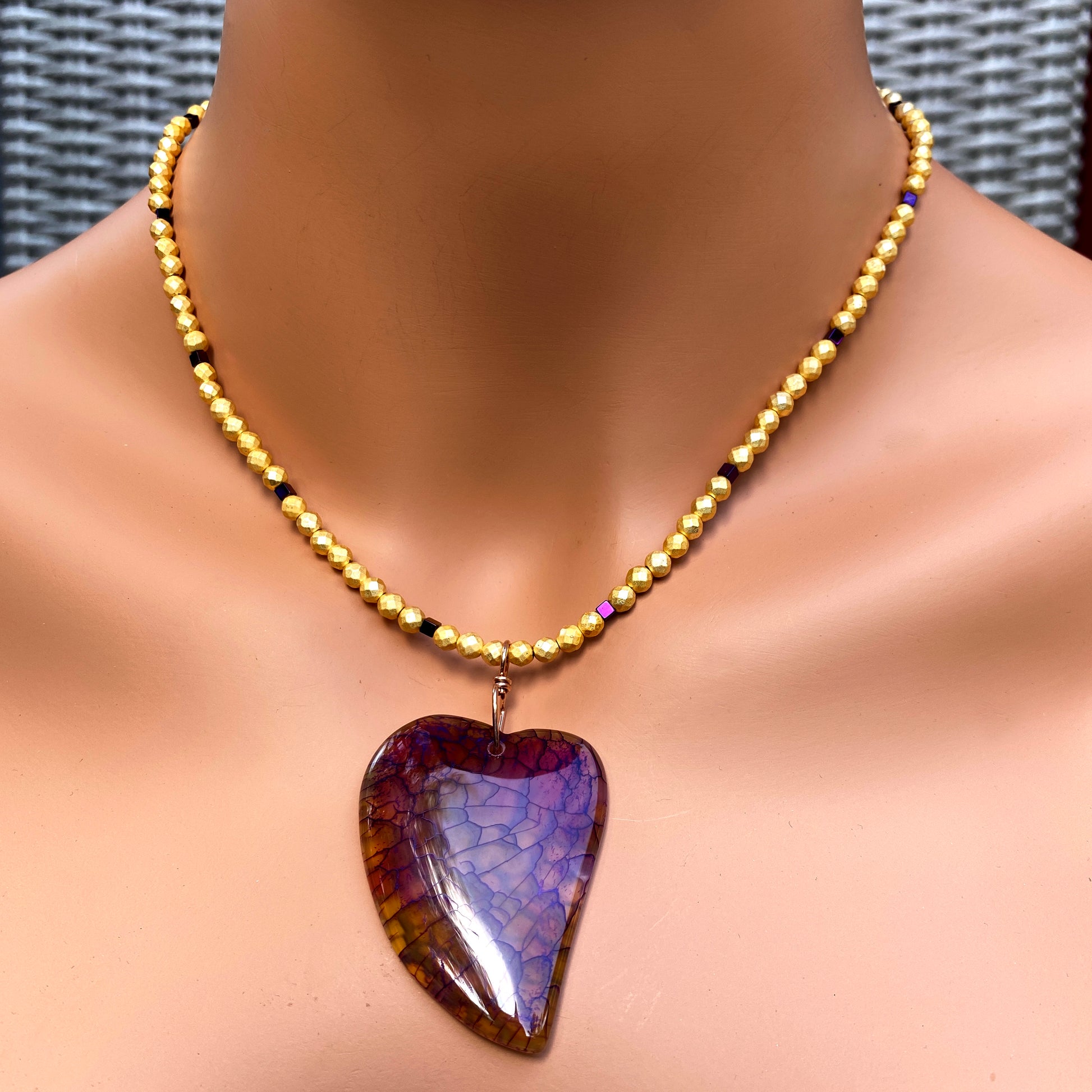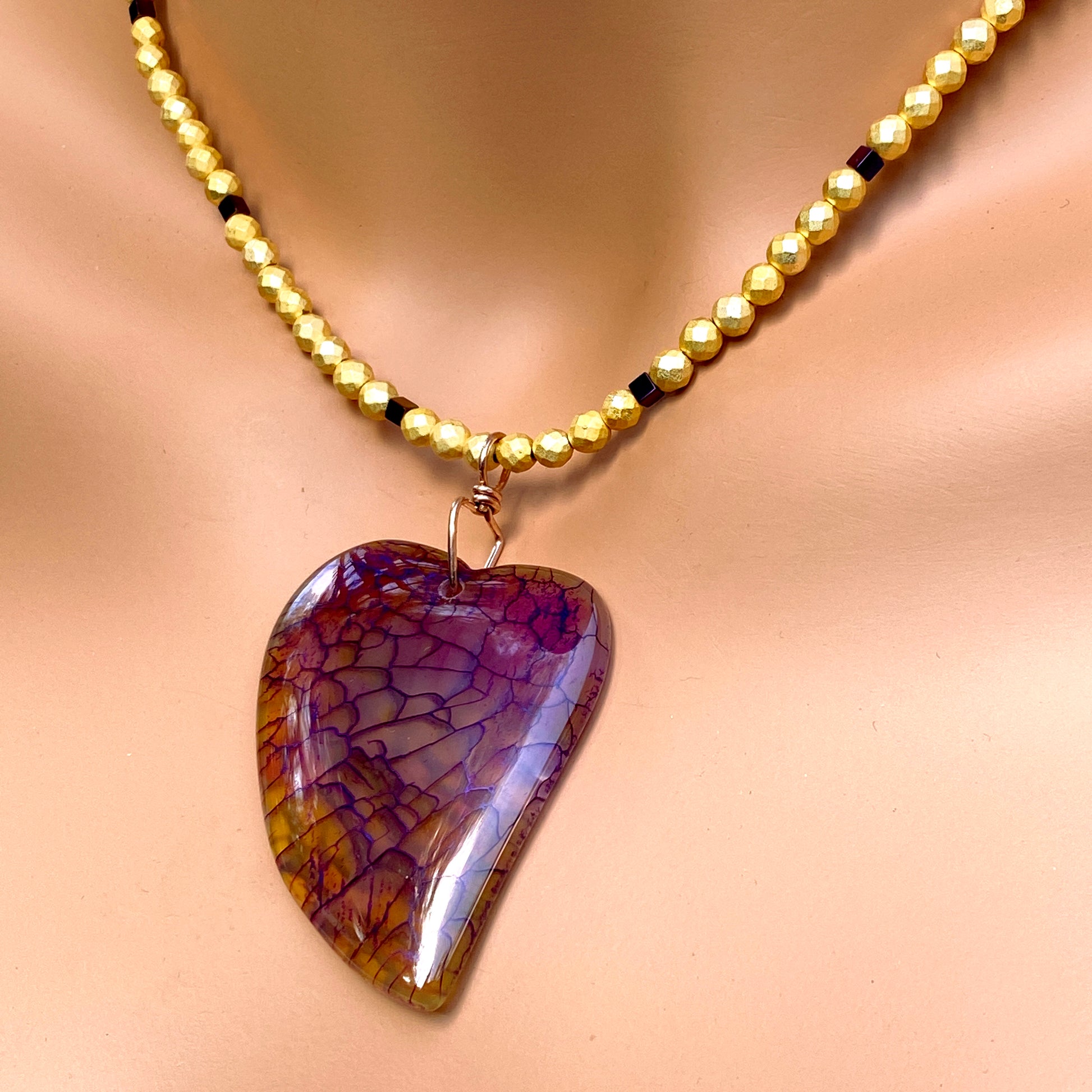 Dragon’s Vein Heart Pendant on Gold & Purple Hematite and 14 Kt GF Clasp