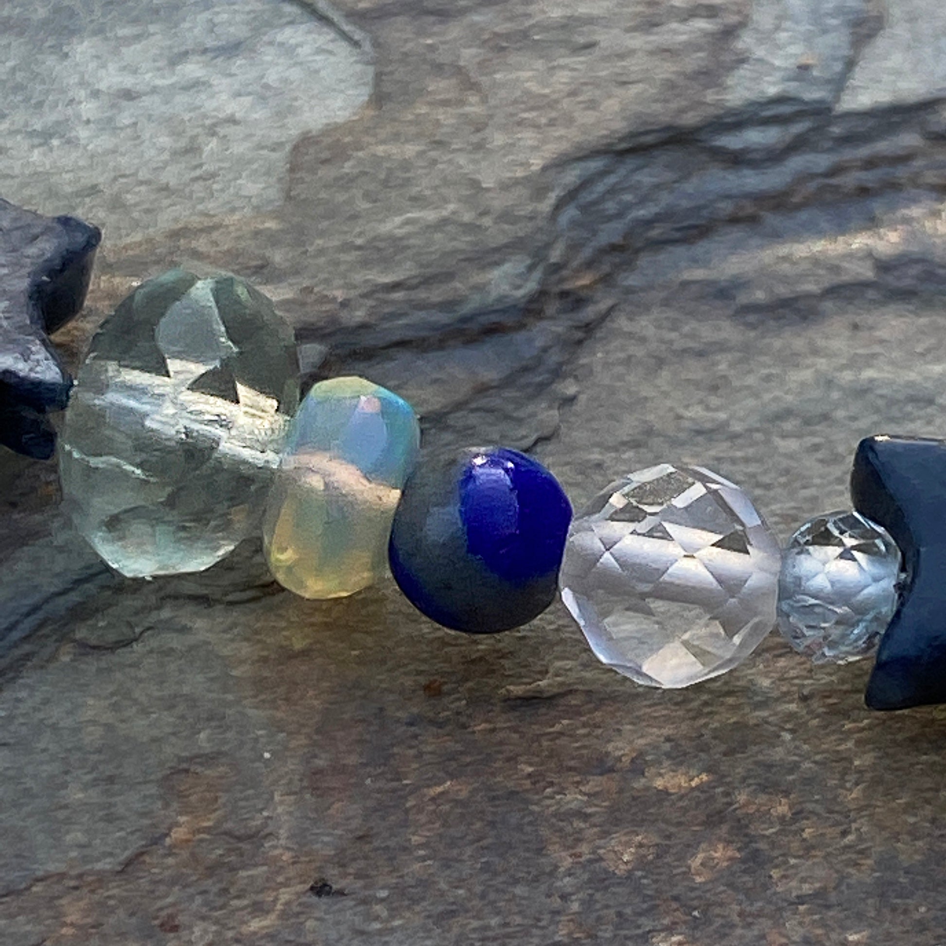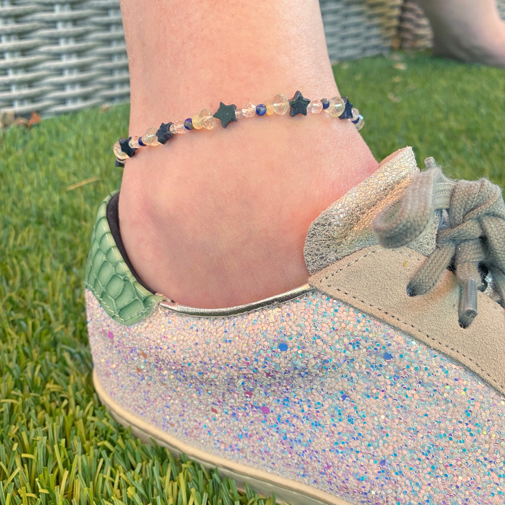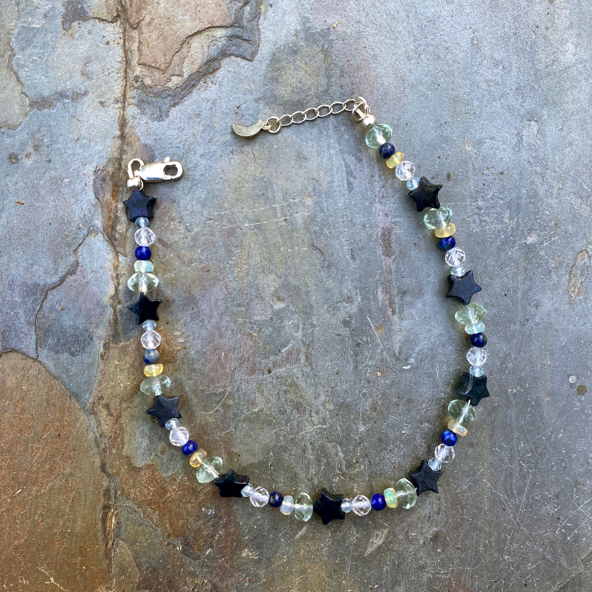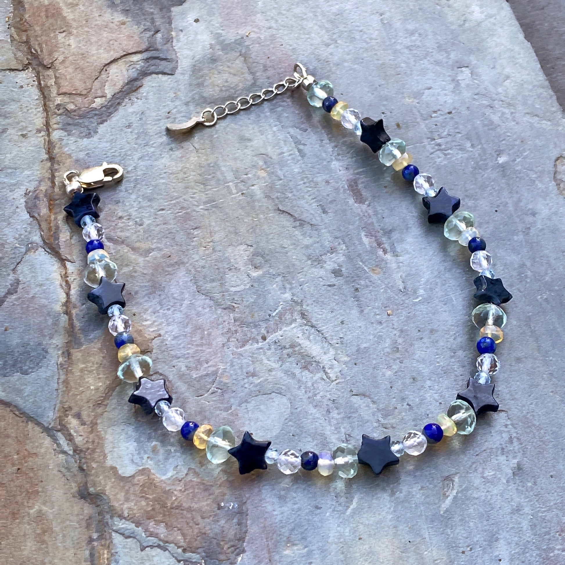 Ethiopian Opal gemstone (white and yellow), Lapis Lazuli Topaz, Fluorite & Dumortierite star anklet