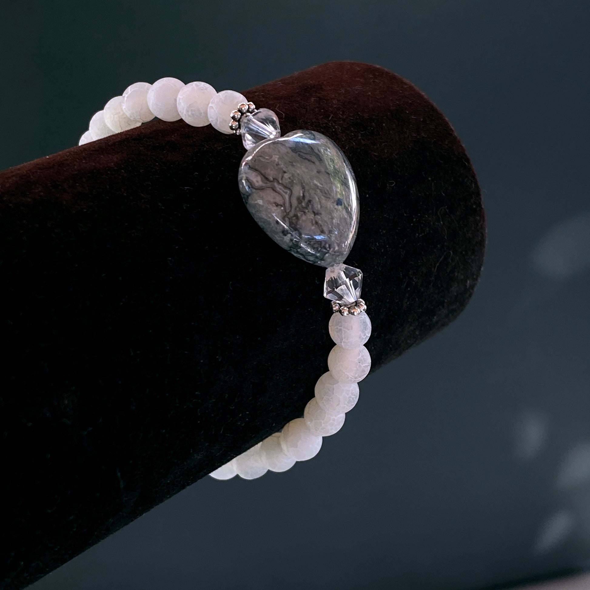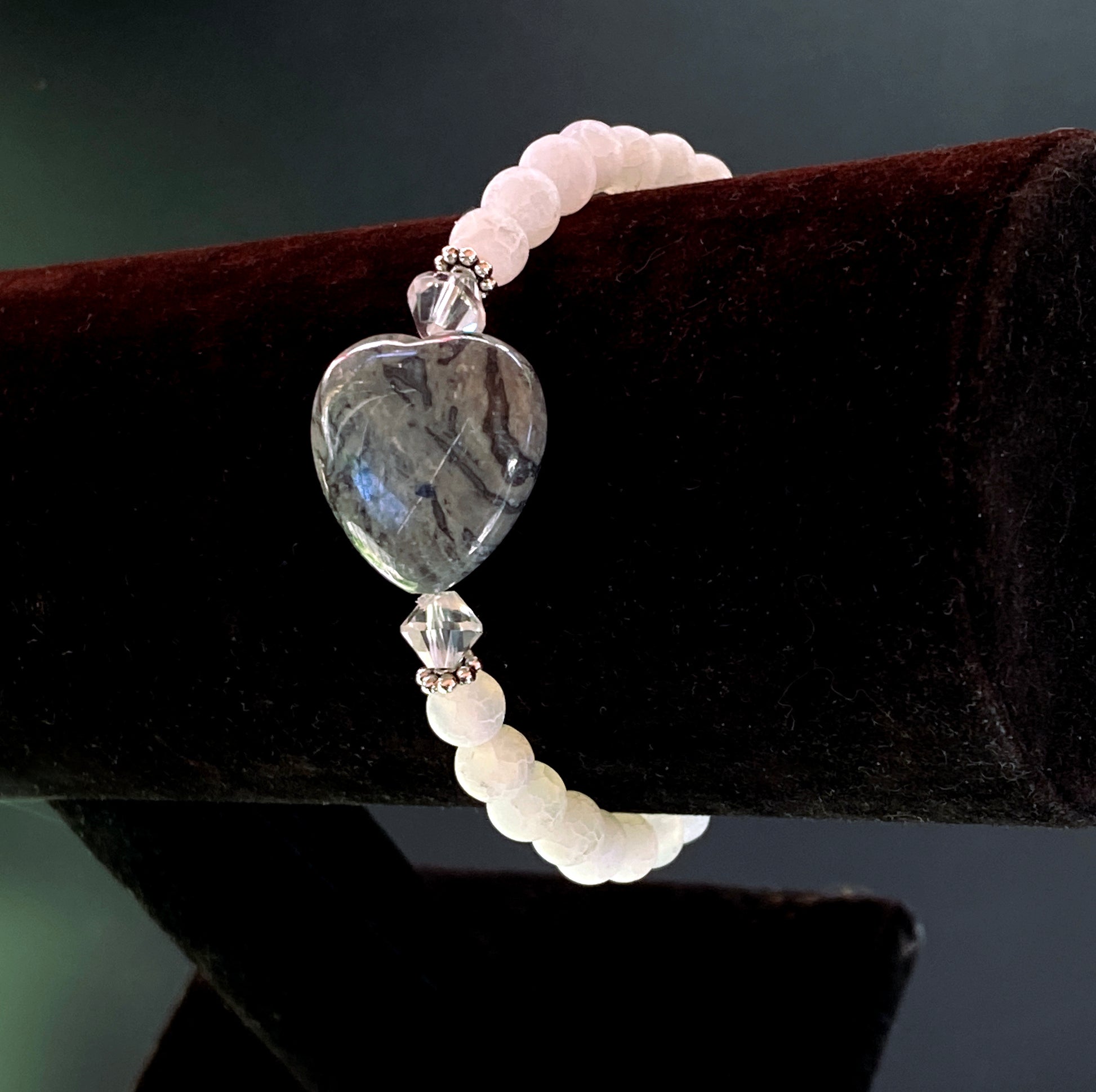 Frosted White Agate, Chinese Crazy Lace Agate Heart, and Clear Quartz with Sterling Silver 7 inch stretch bracelet.