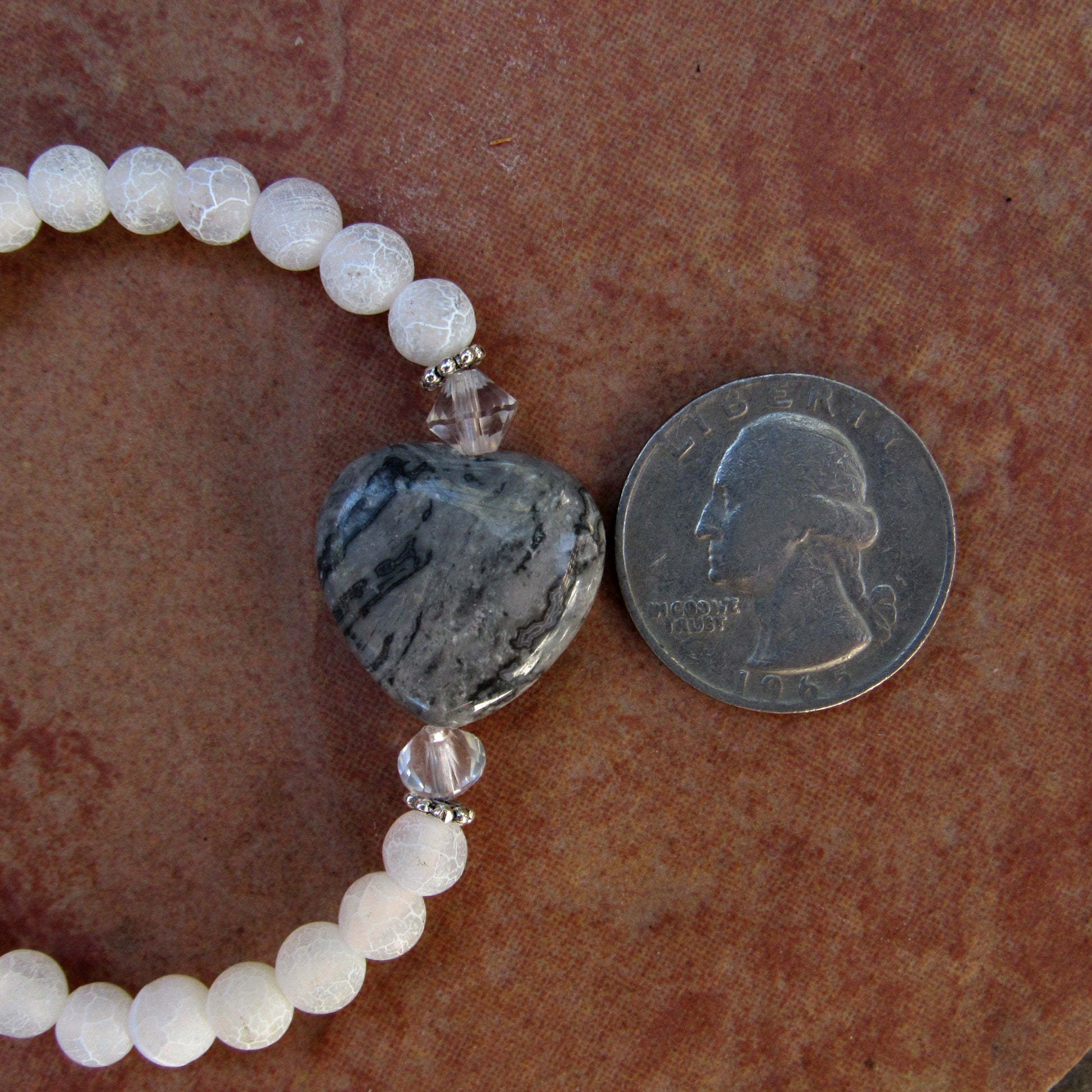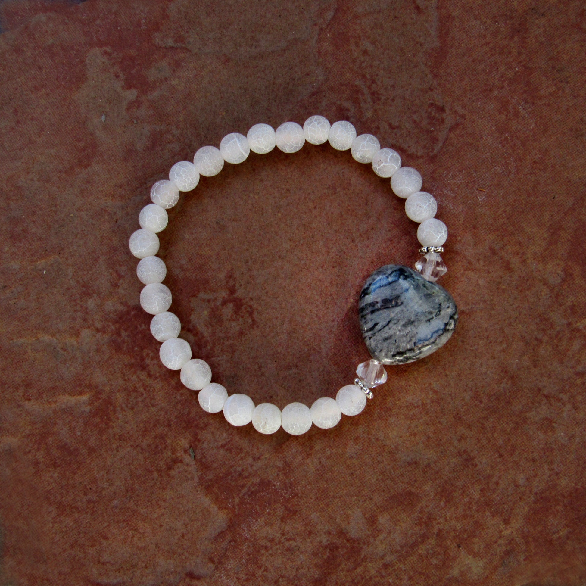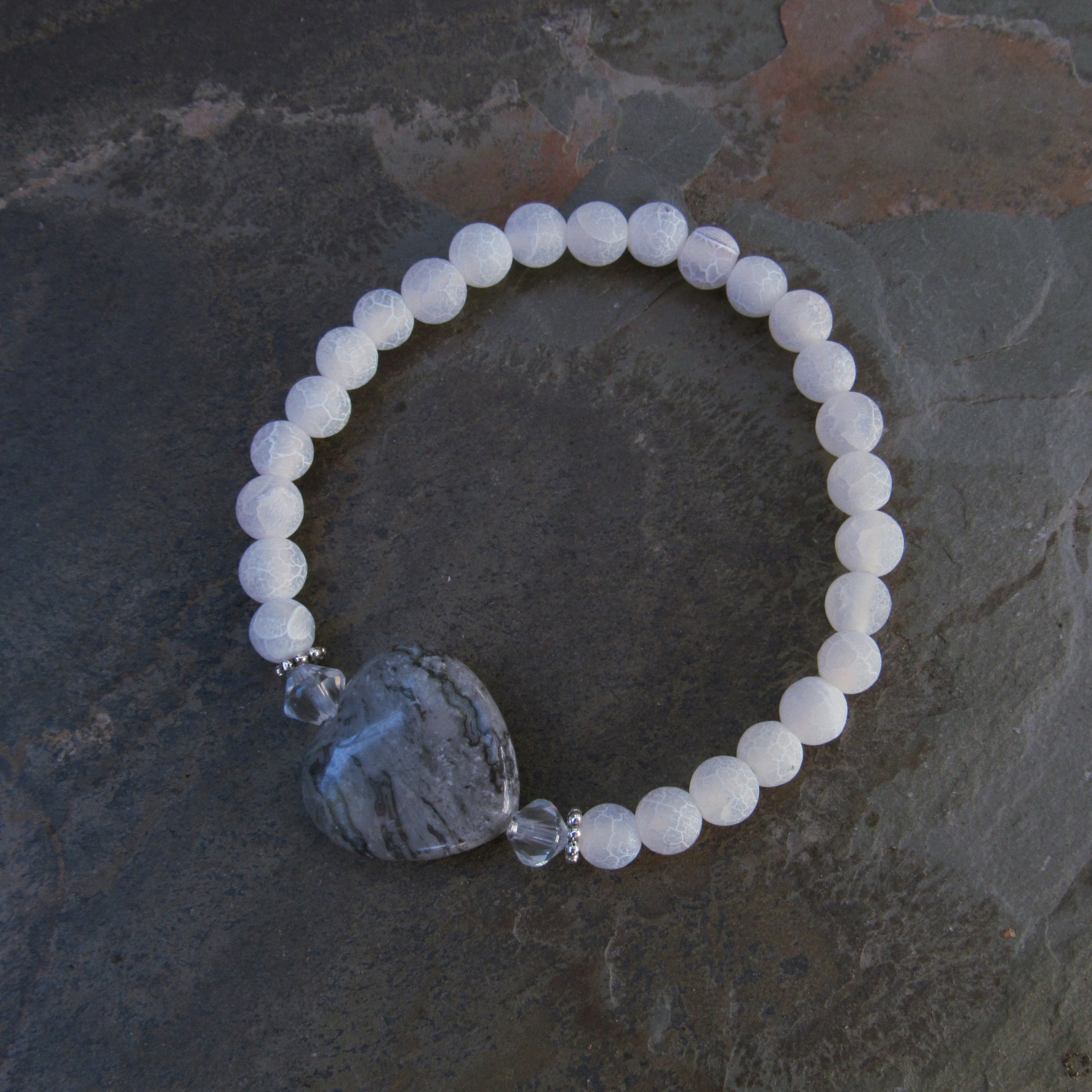 Frosted White Agate Gemstones, Chinese Crazy Lace Agate Heart, and Clear Quartz bracelet