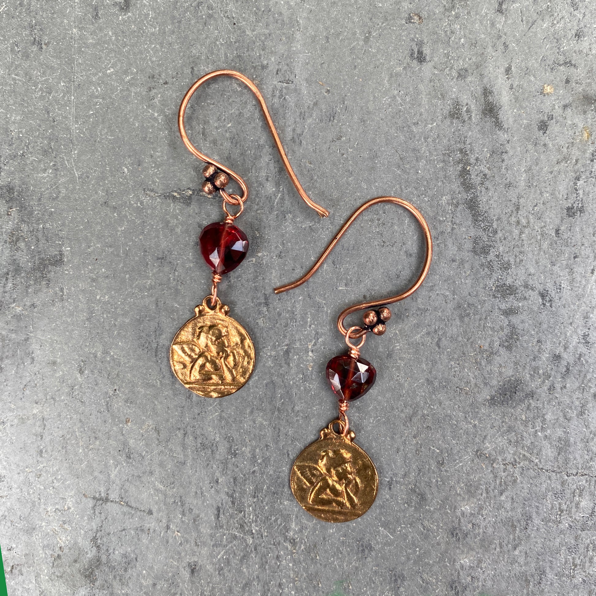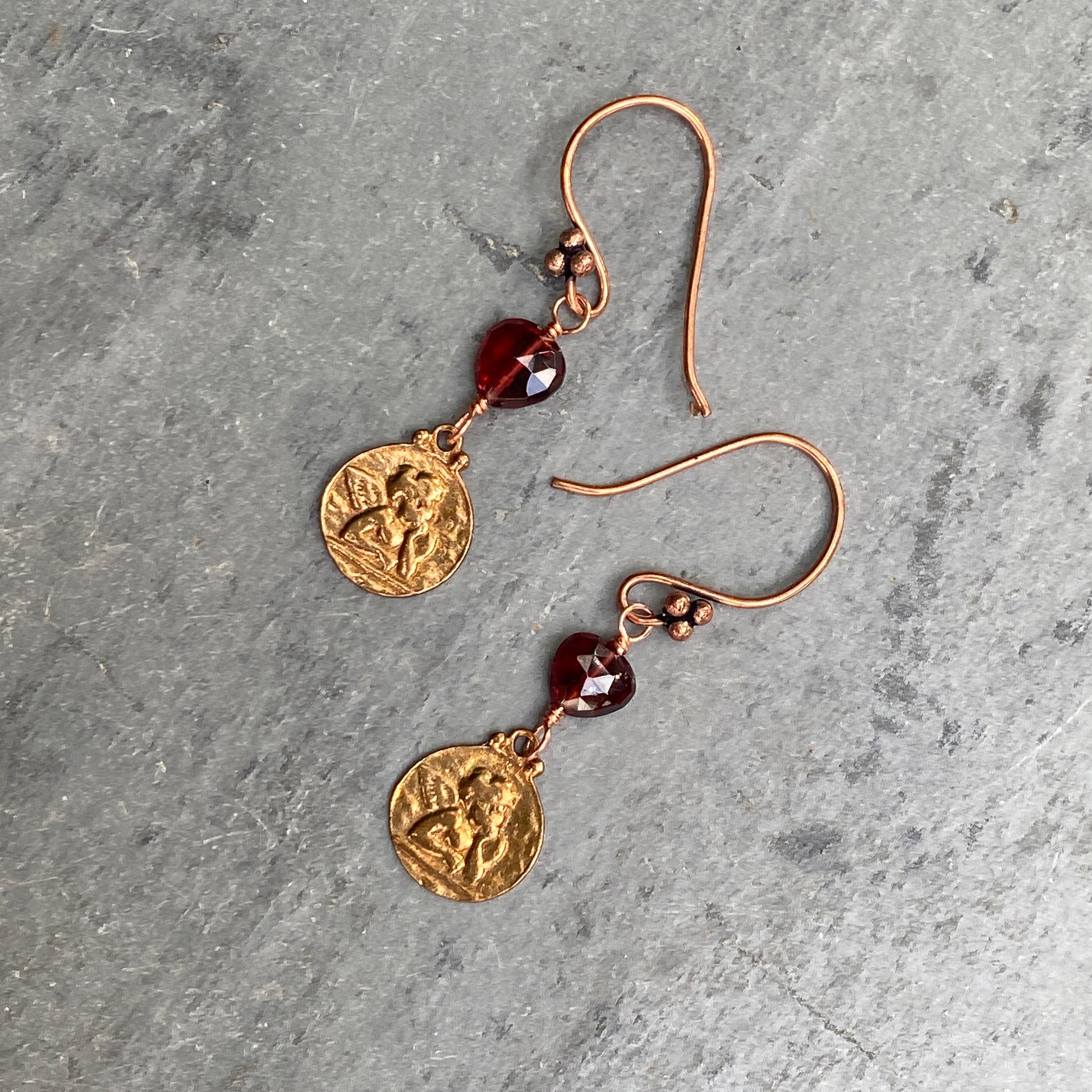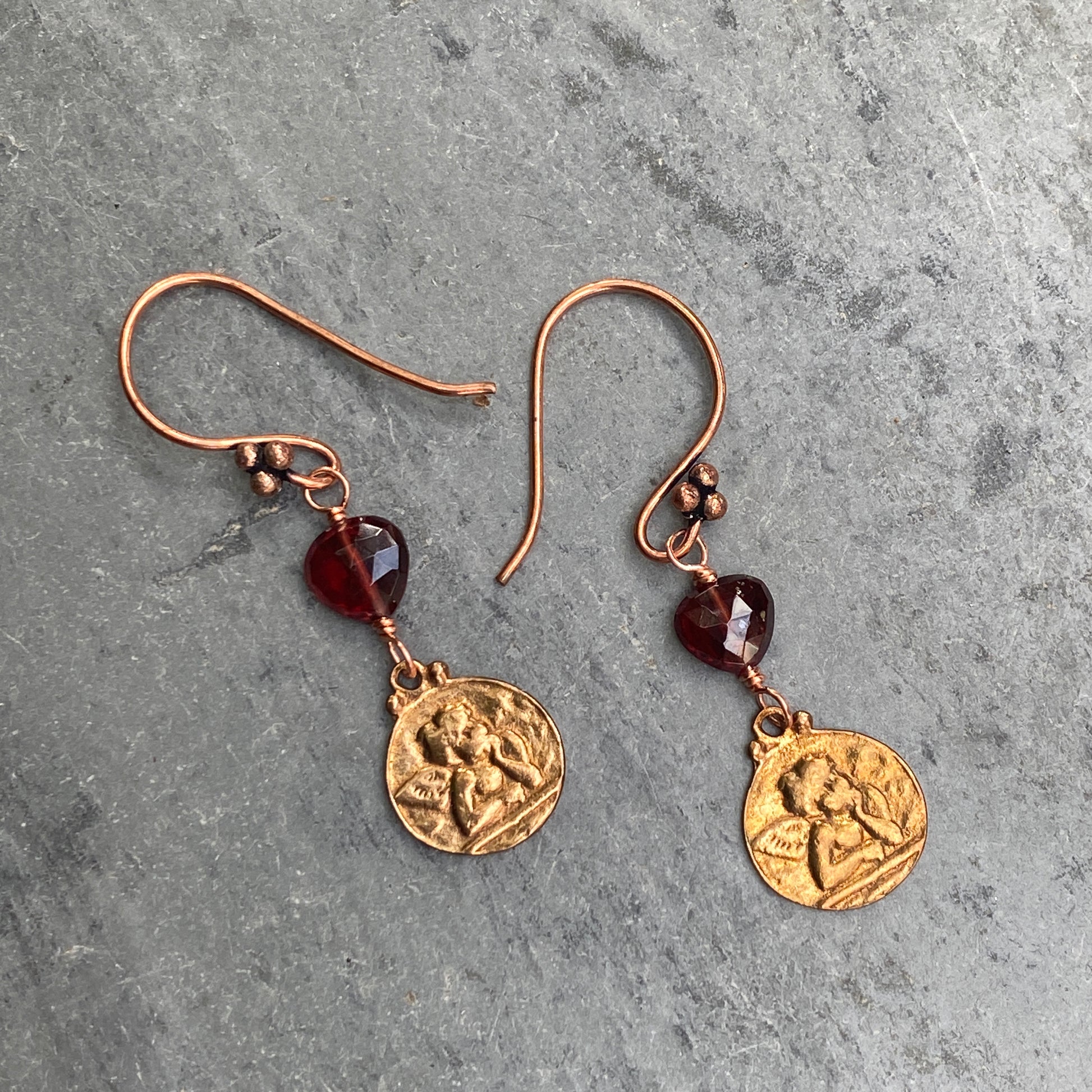 Garnet Gemstone hearts with Copper Circle with Cupid Imprint Dangle earrings