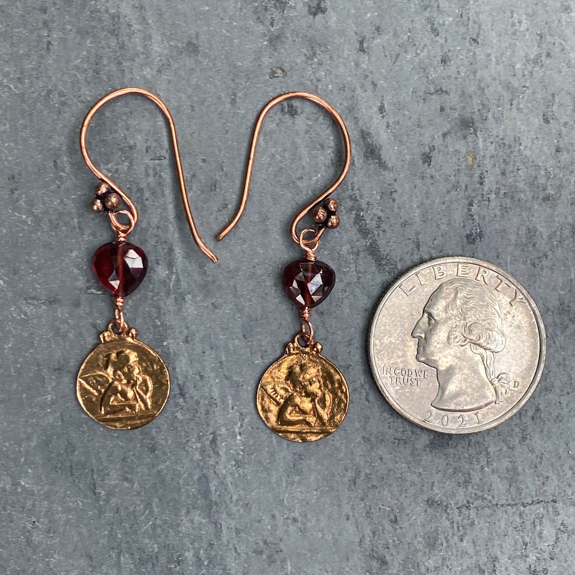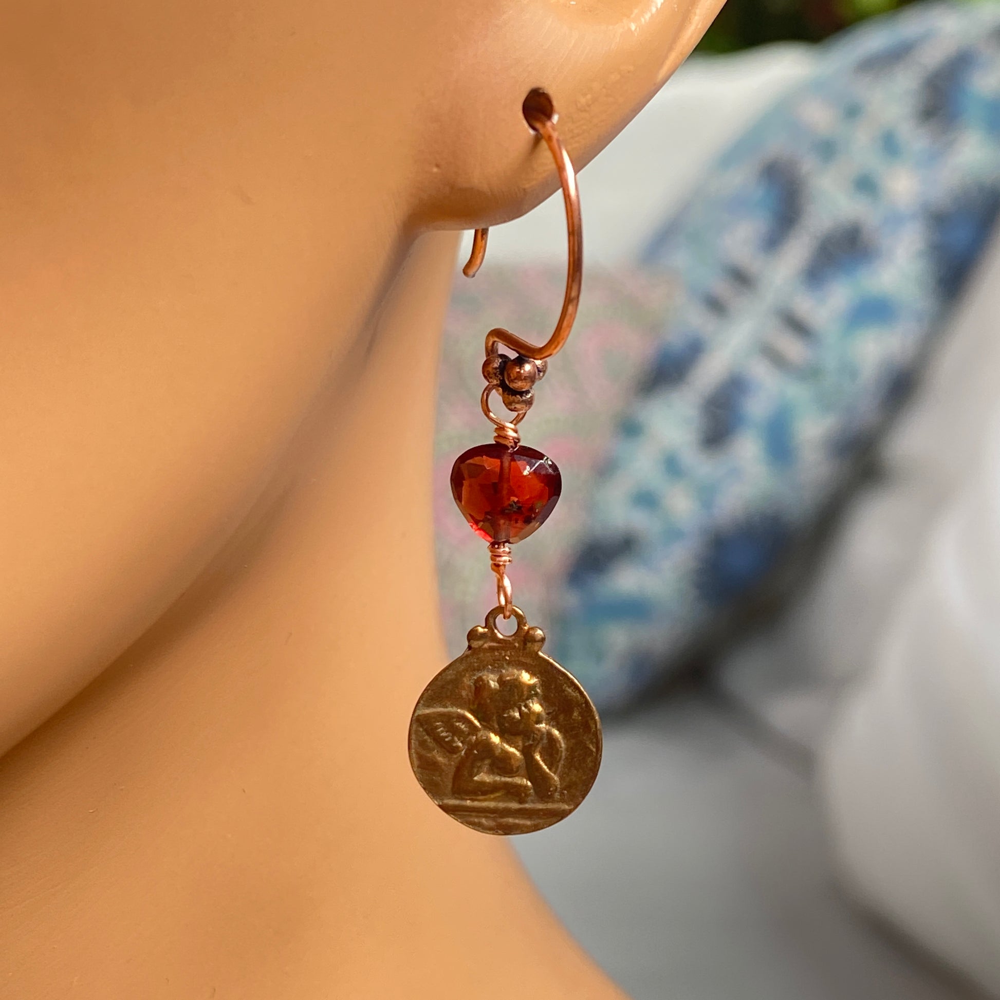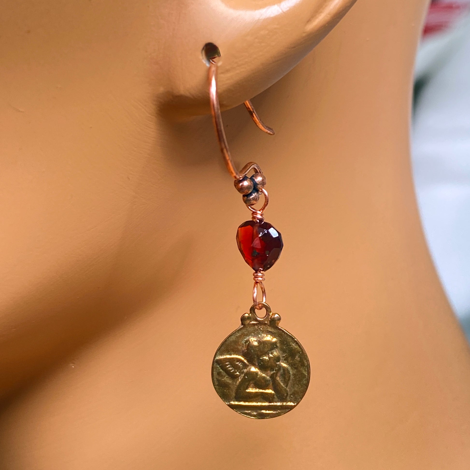 Garnet Gemstone hearts with Copper Circle with Cupid Imprint Dangle earrings