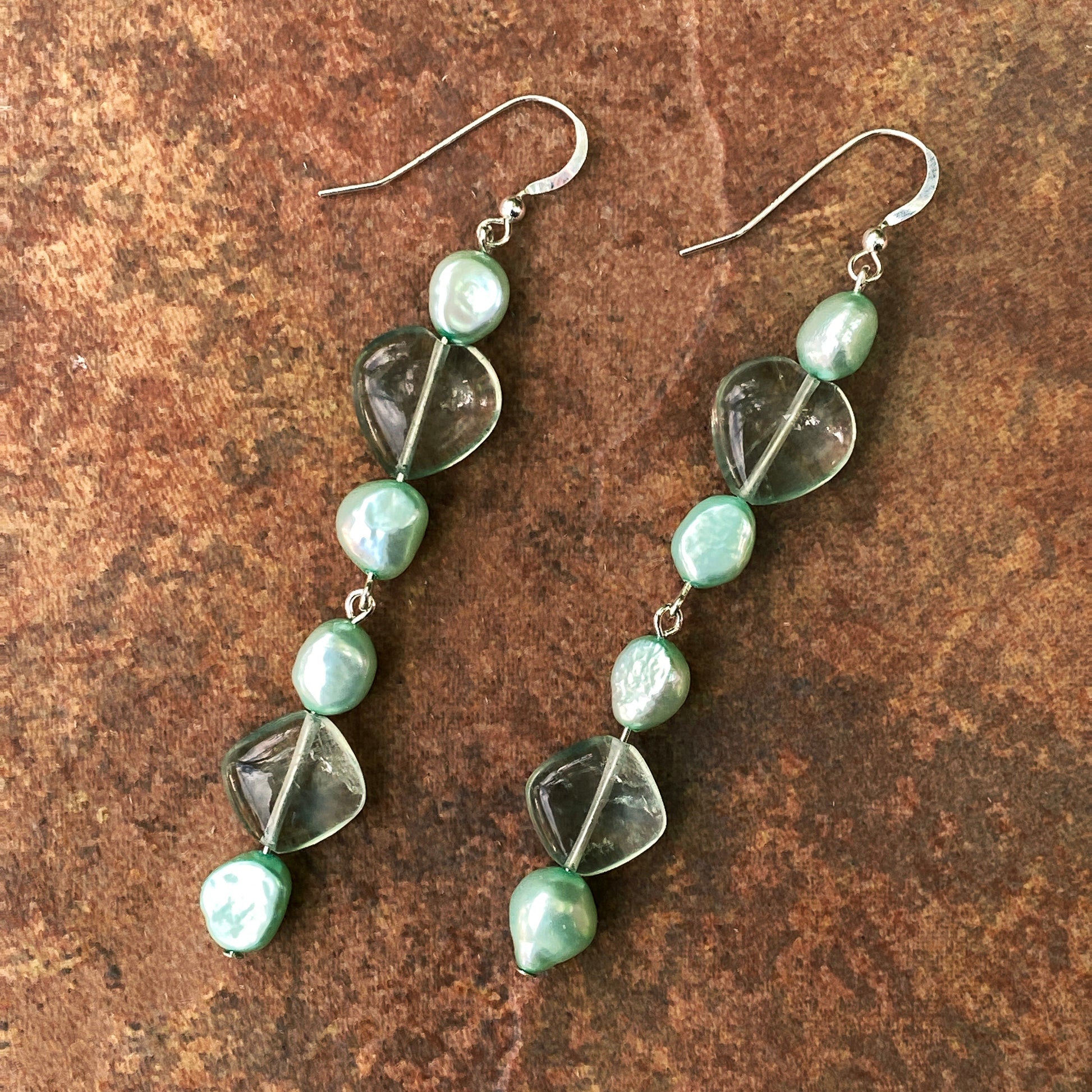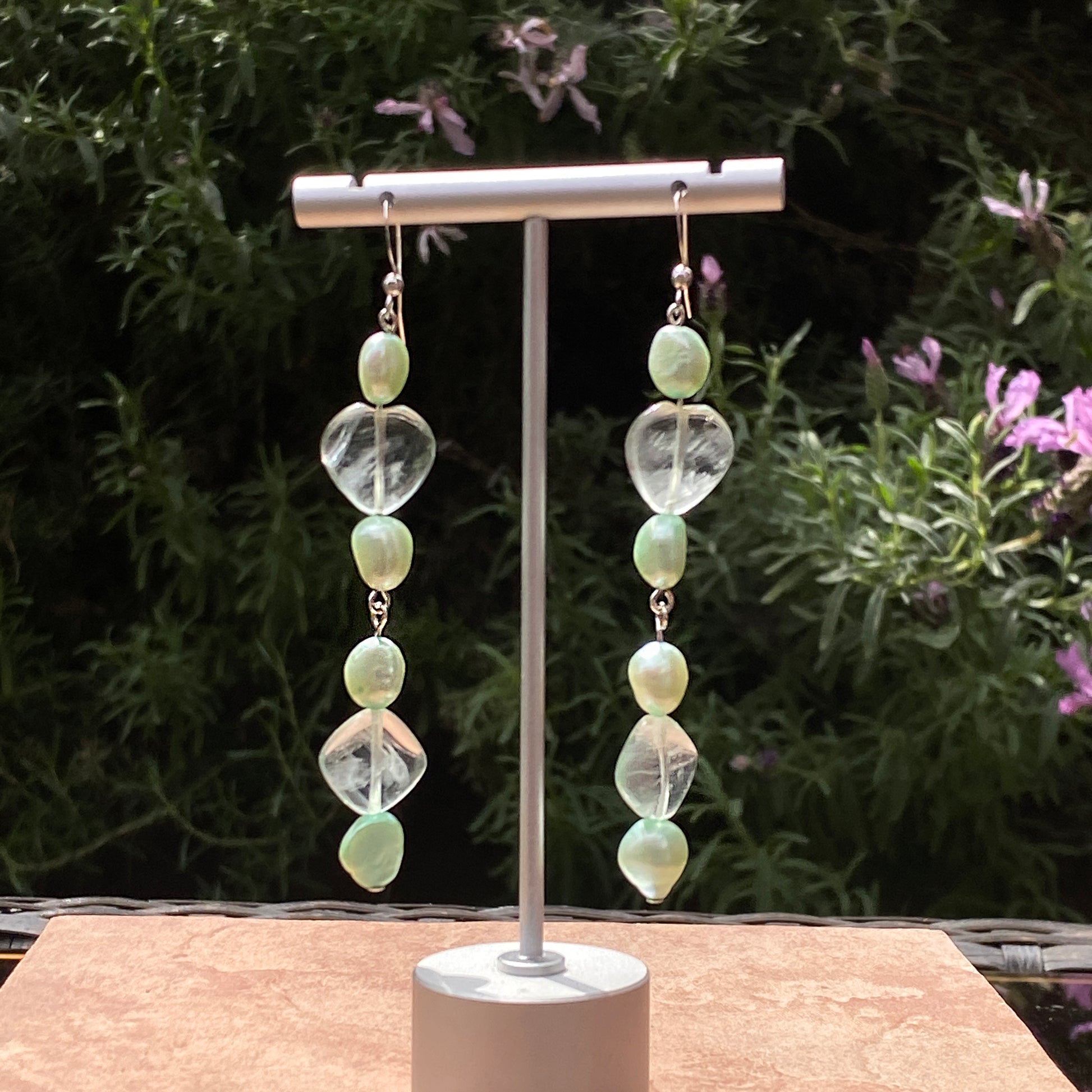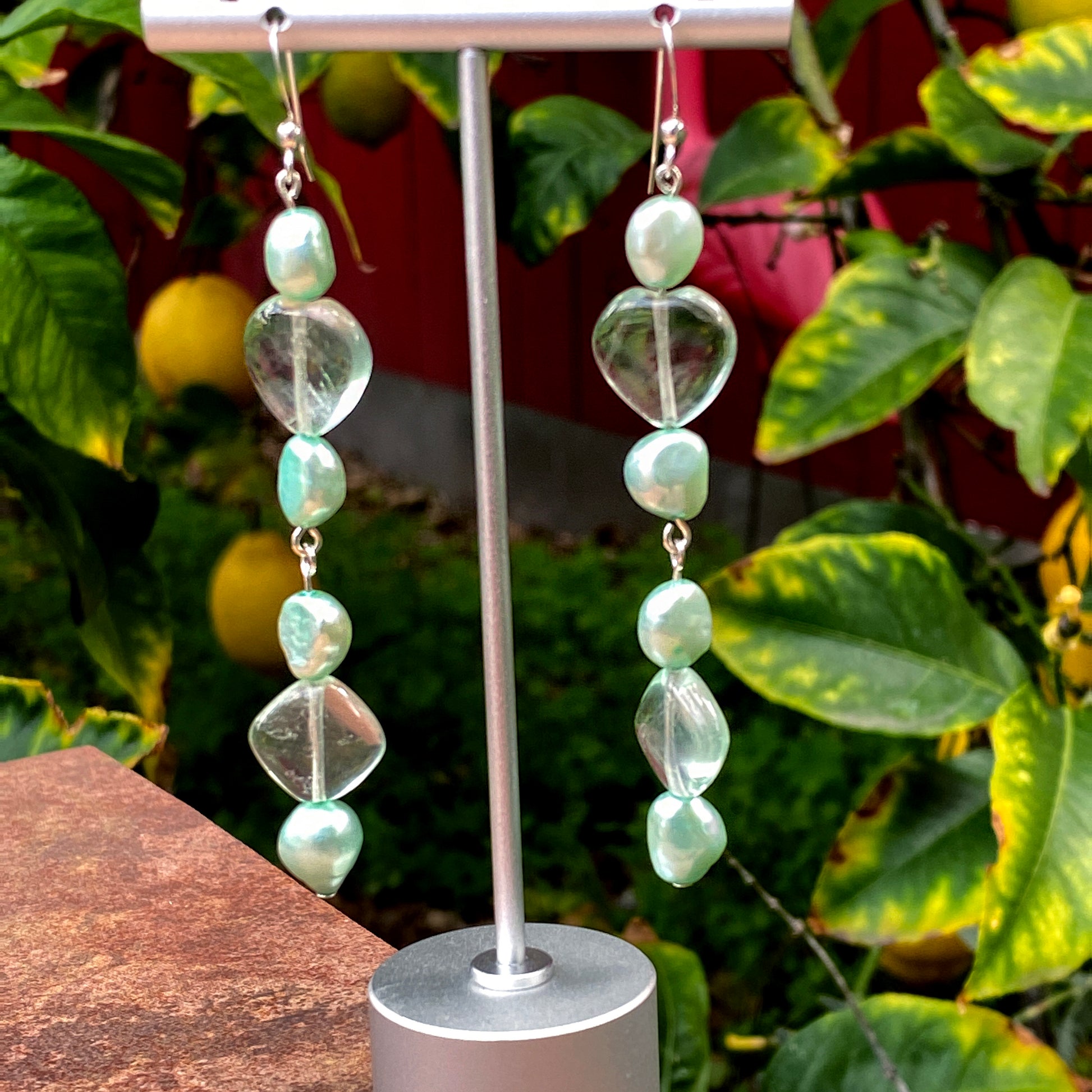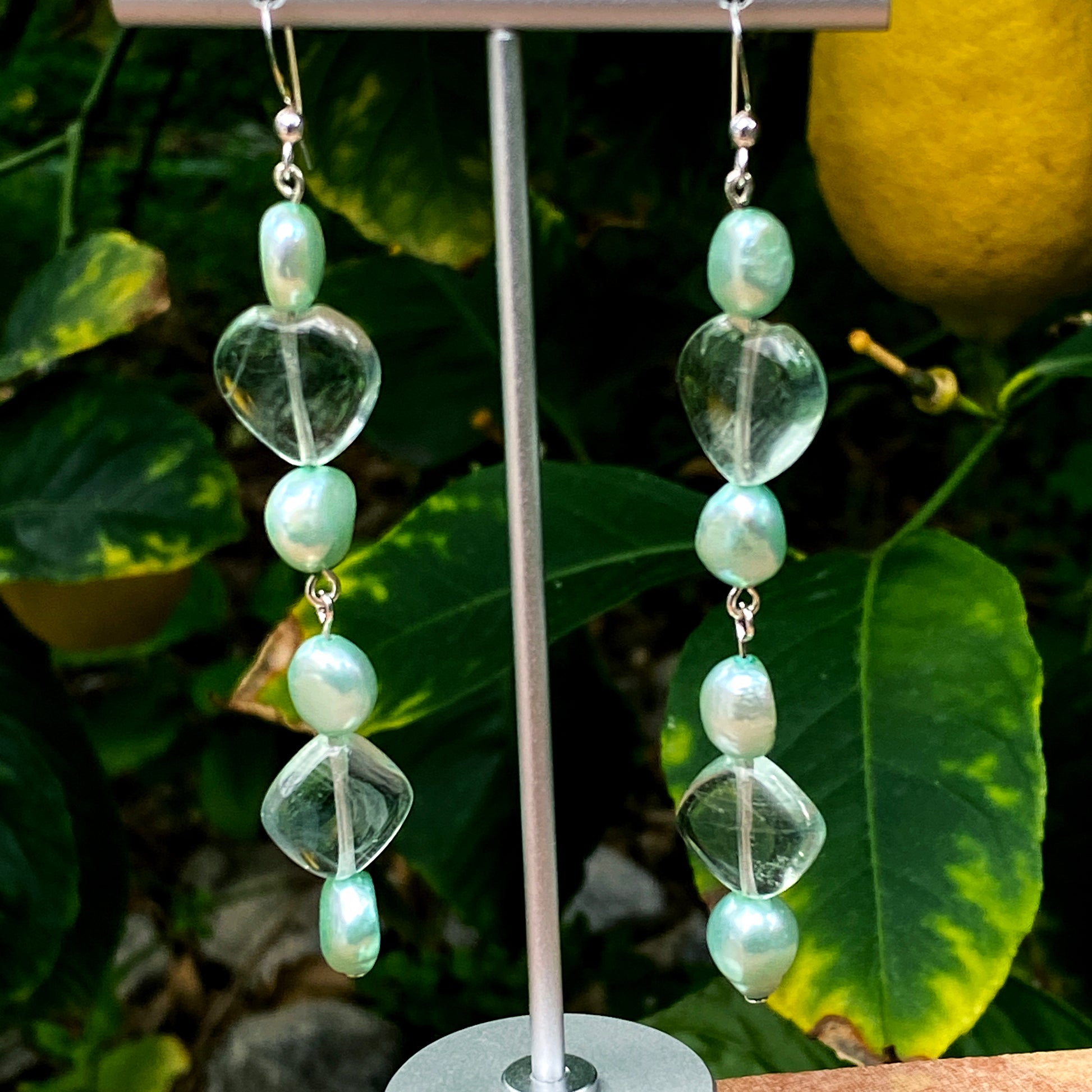 Genuine fresh water Pearls and Fluorite hearts and Fluorite Diamonds on sterling silver drop Earrings