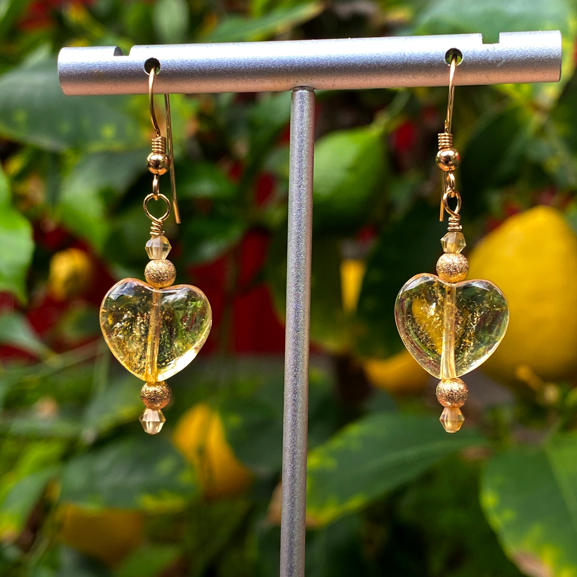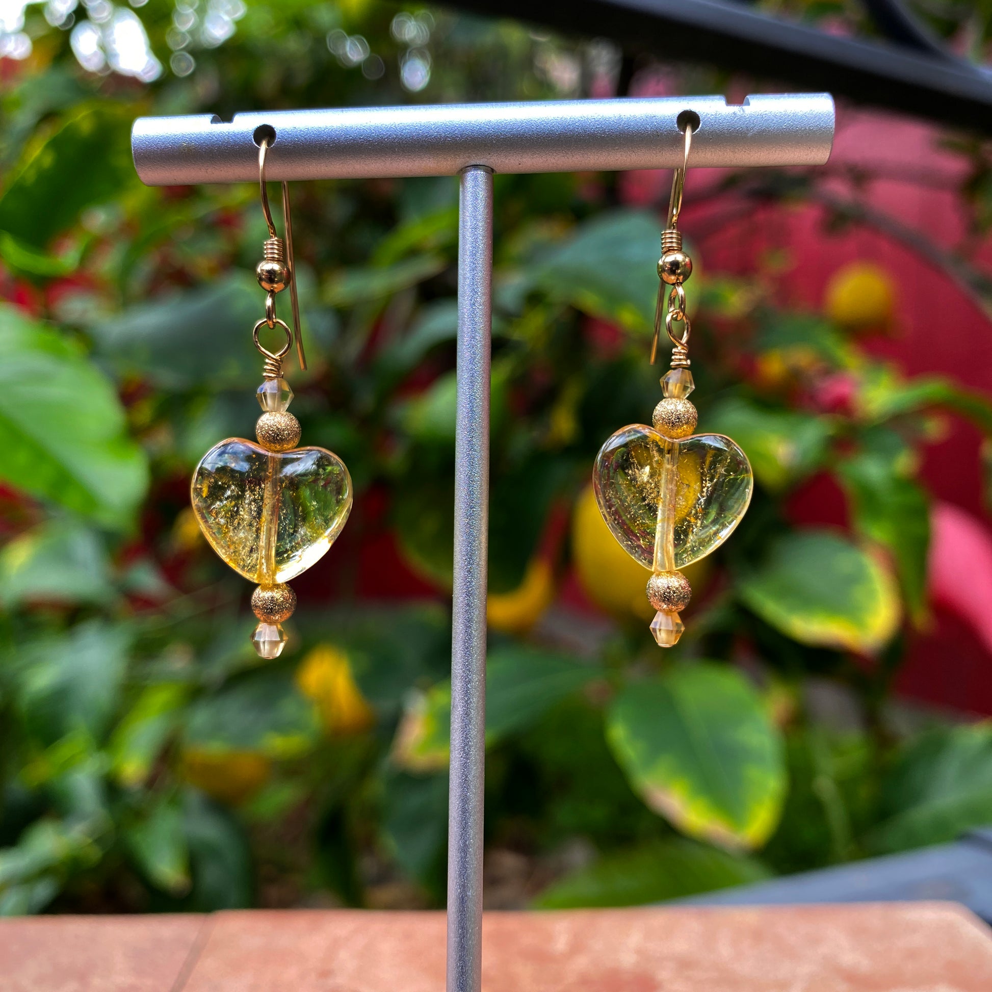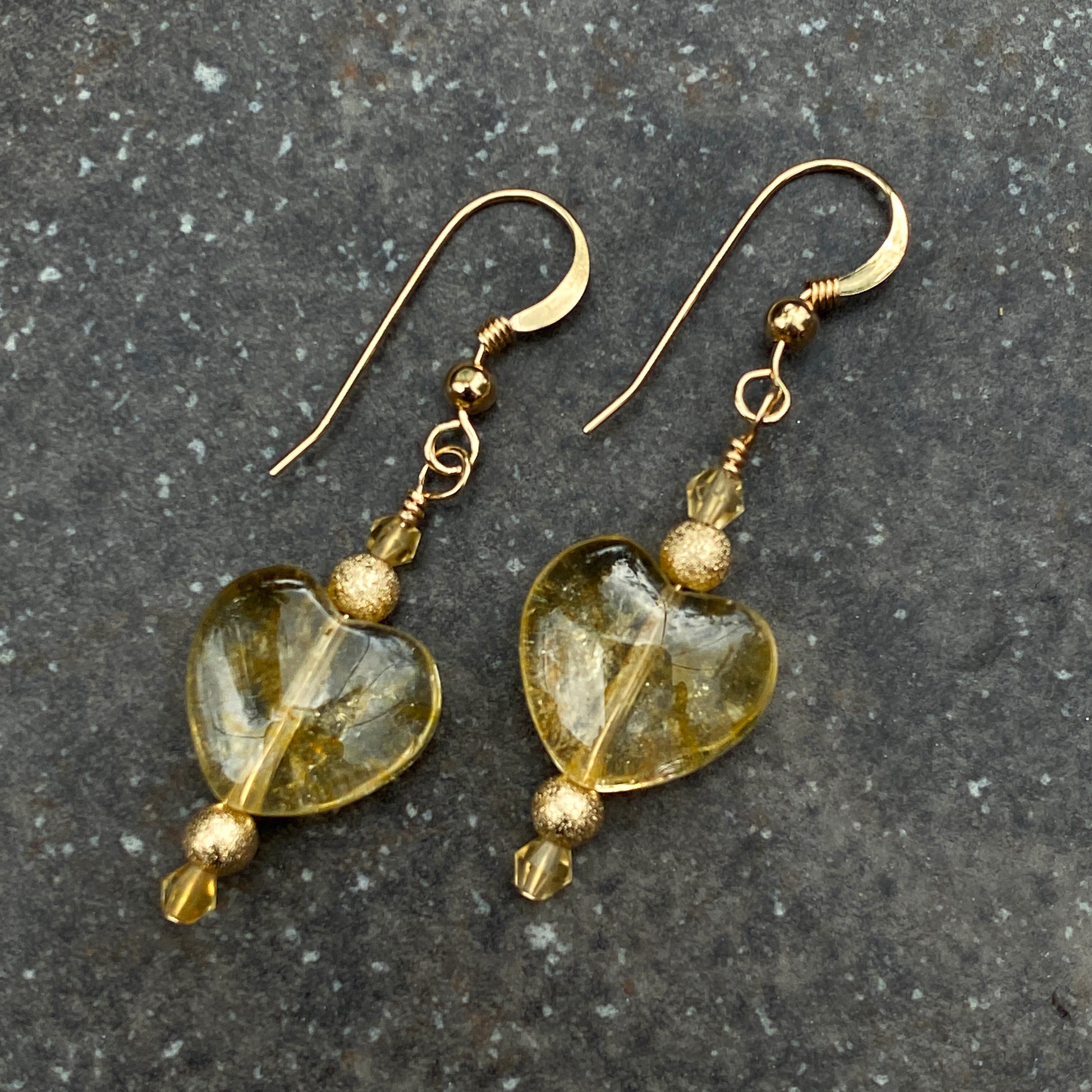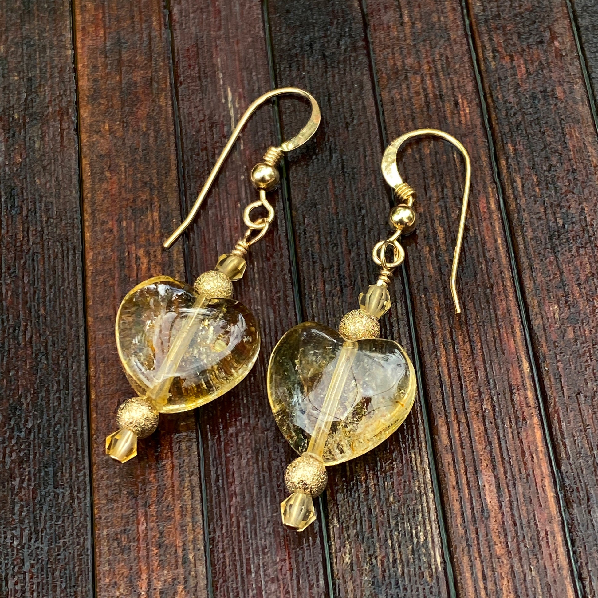 Citrine quartz Gemstone hearts and 14 kt gold fill drop earrings