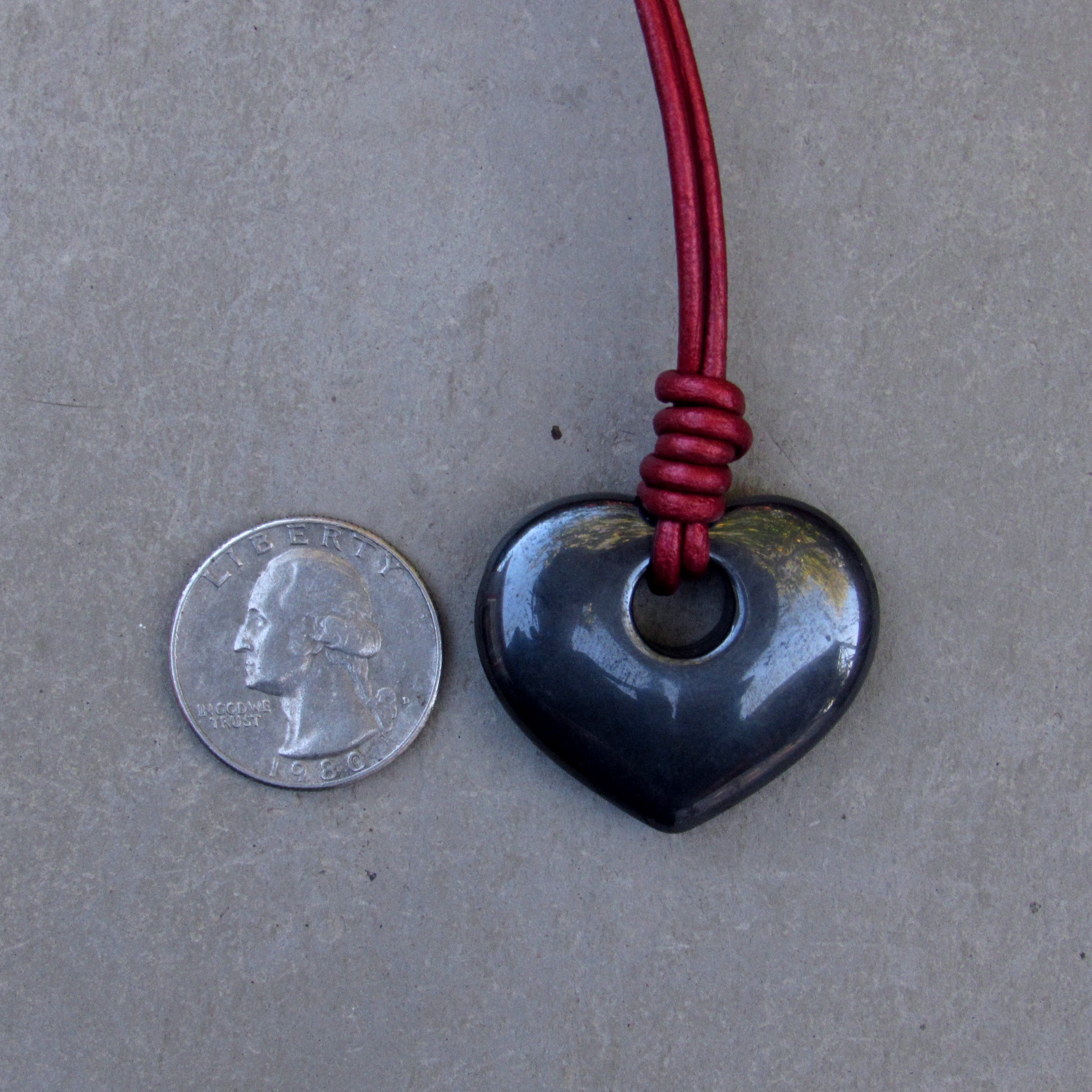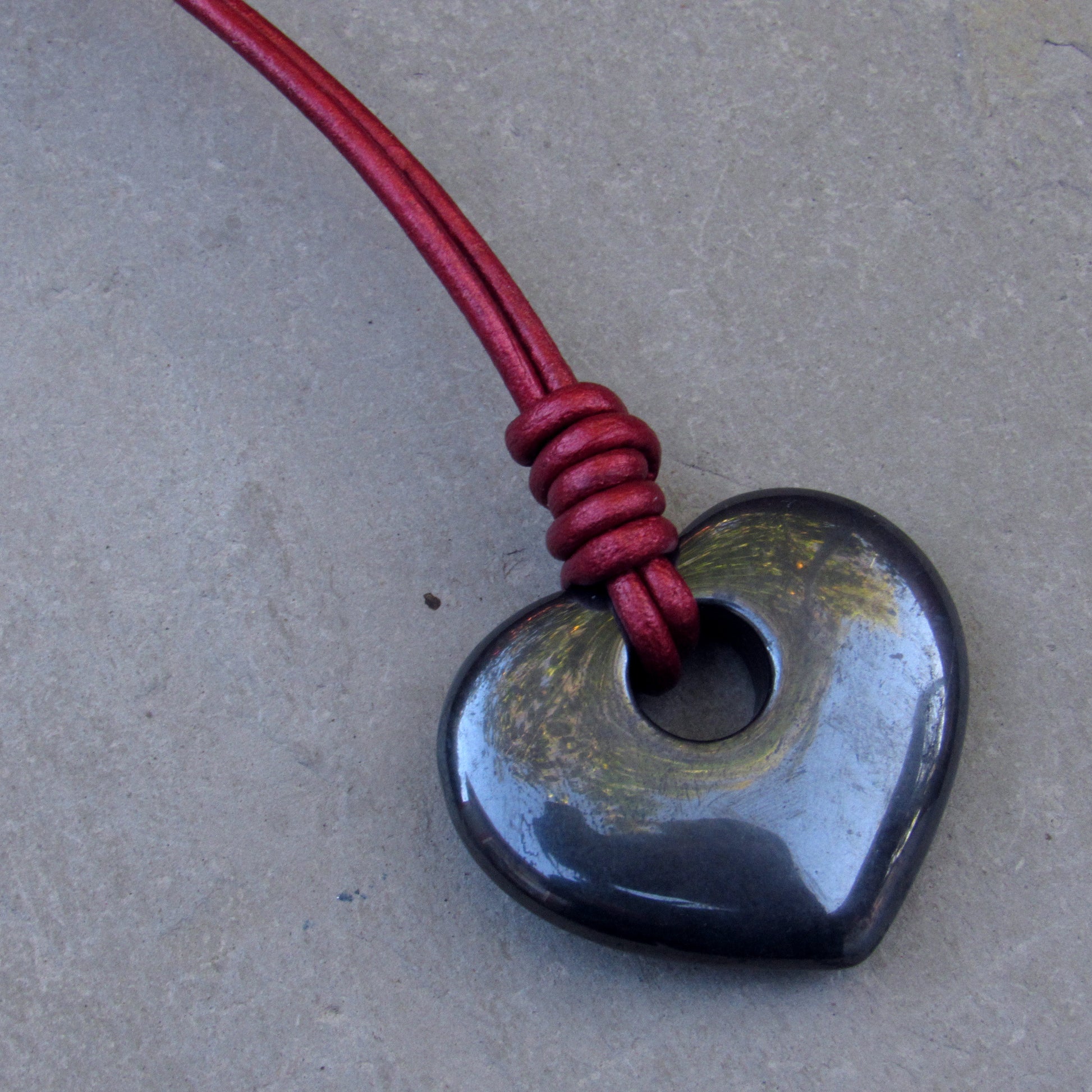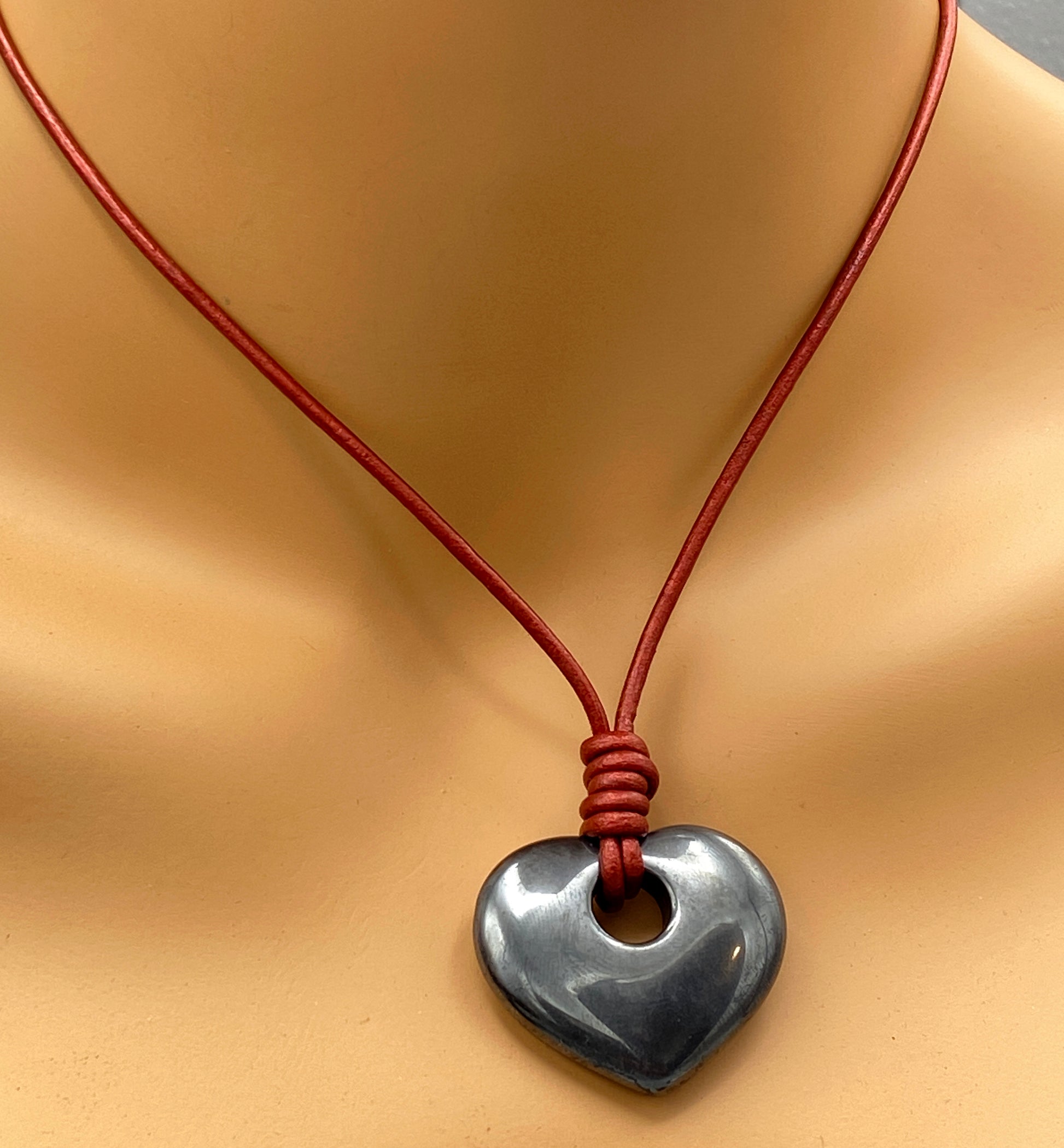 Hematite heart Hand Knotted on Metallic Red Leather With Sterling Silver Clasp