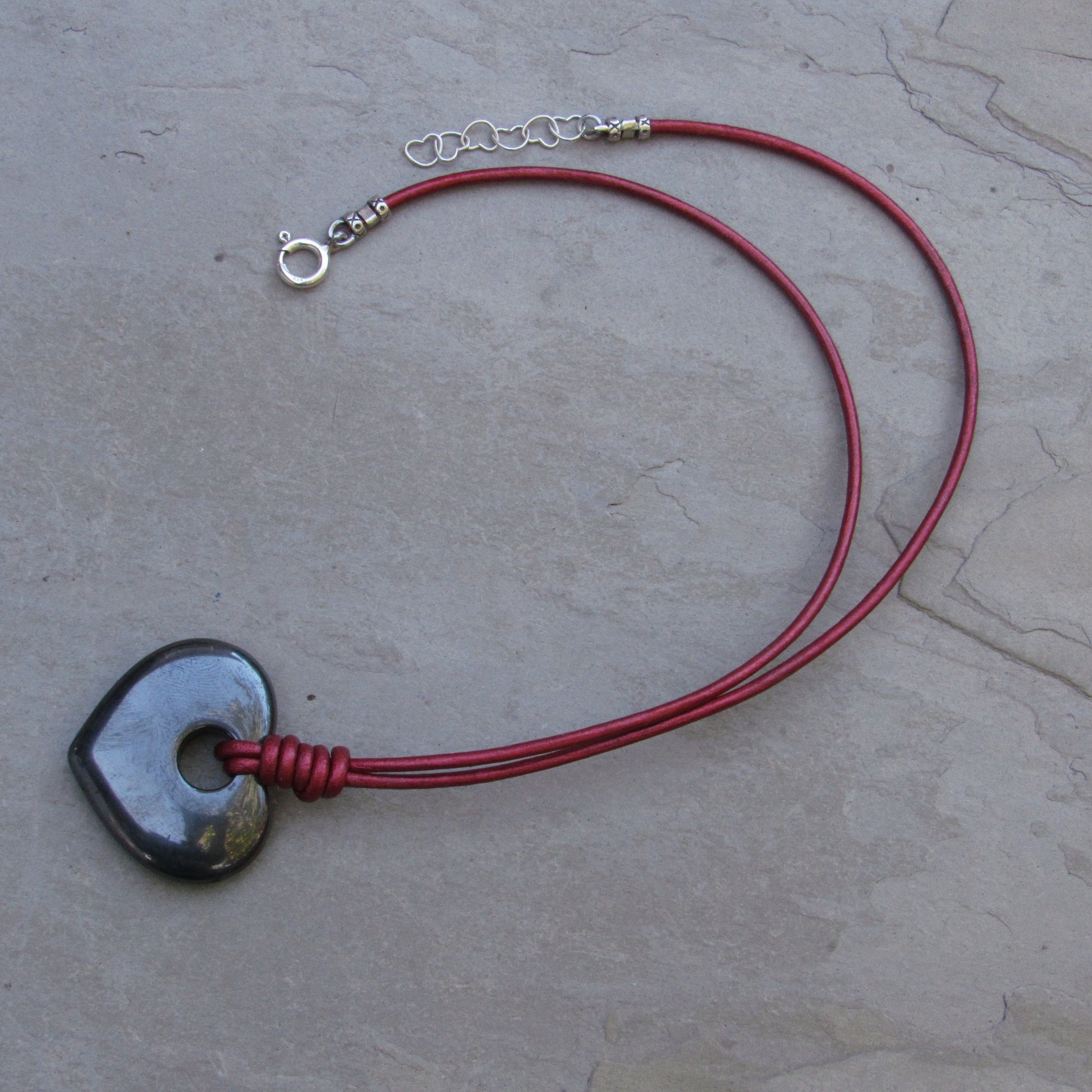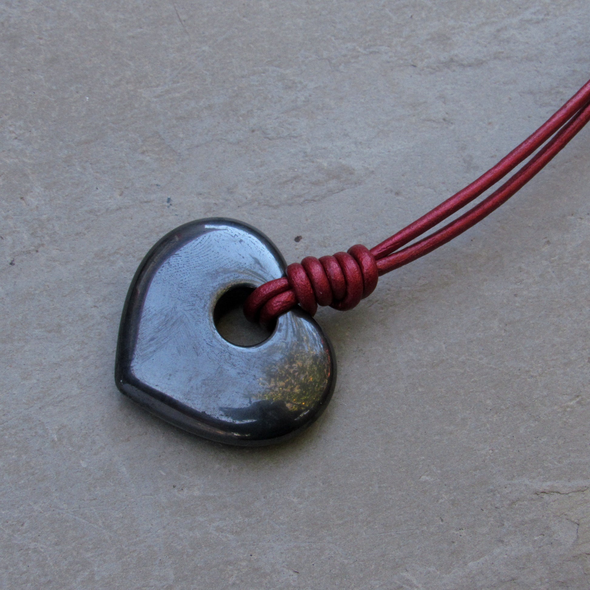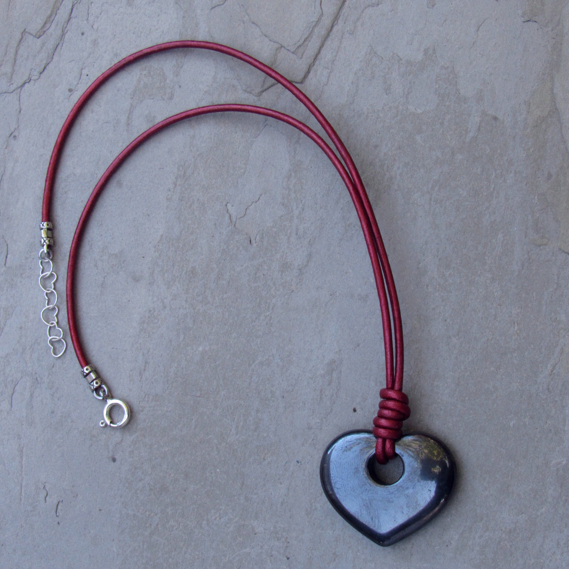 Hematite heart Hand Knotted on Metallic Red Leather With Sterling Silver Clasp