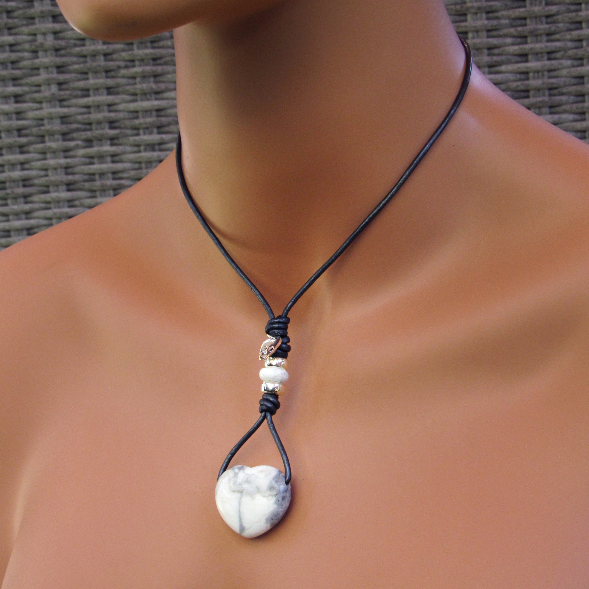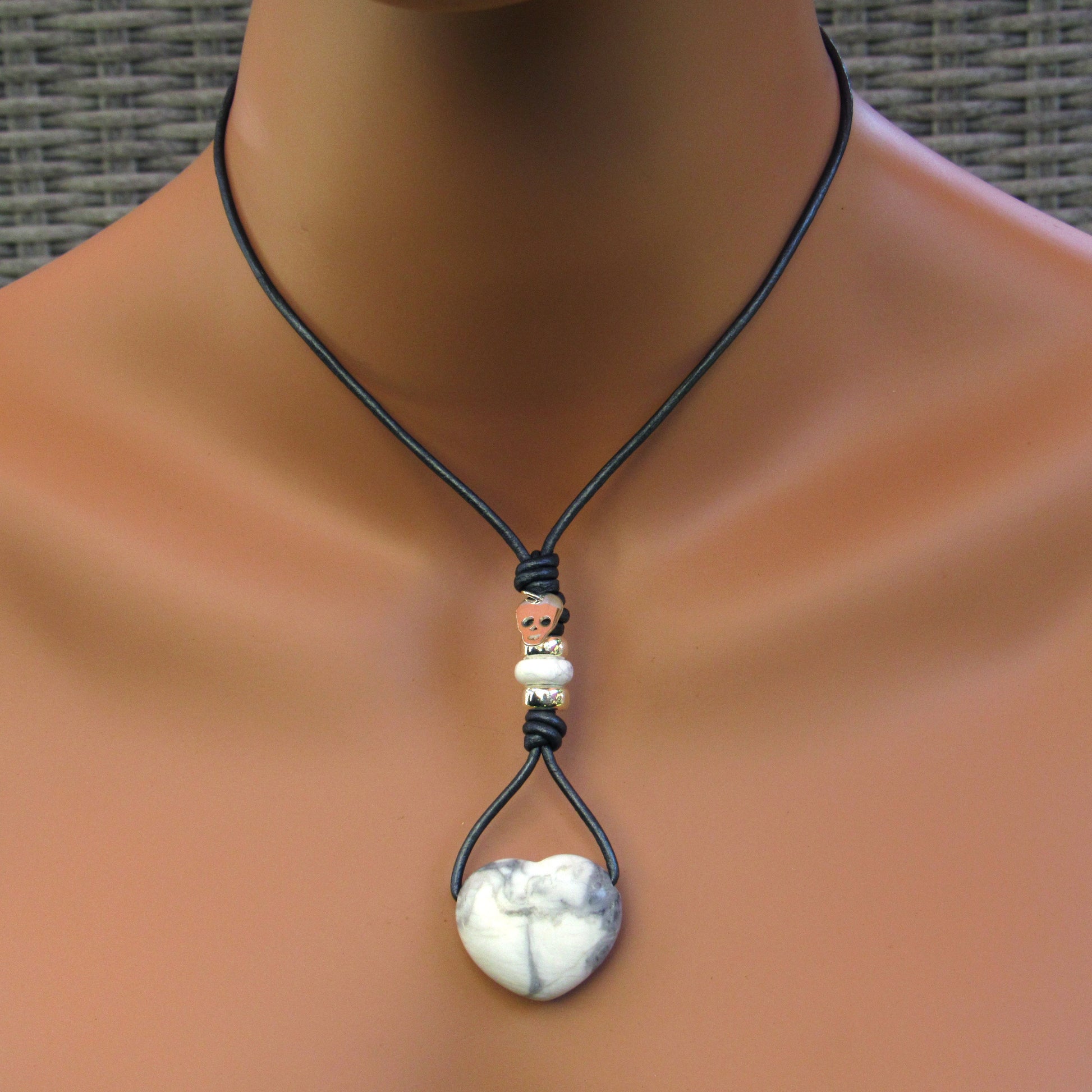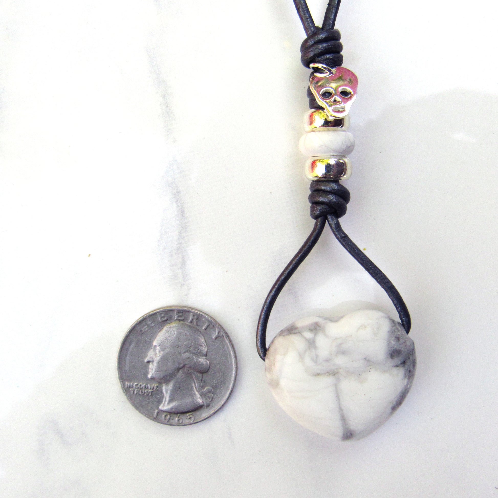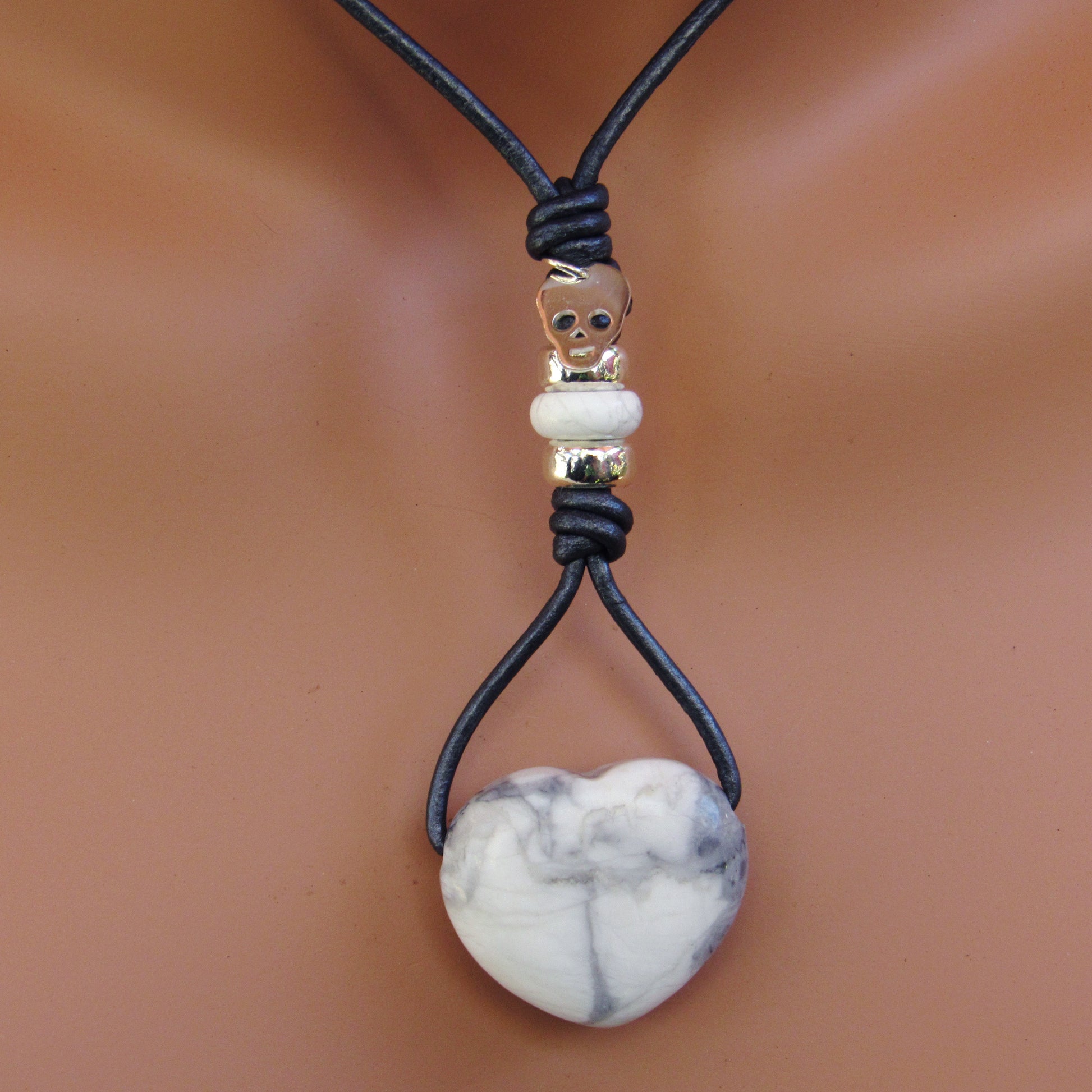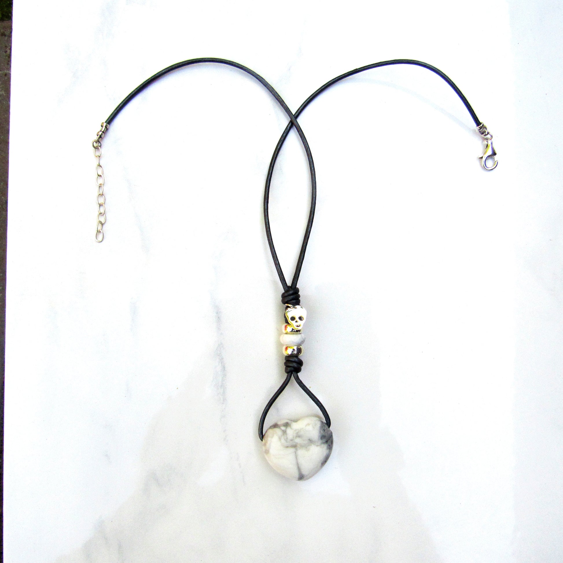 Howlite hand knotted leather with Sterling Silver Skull Necklace
