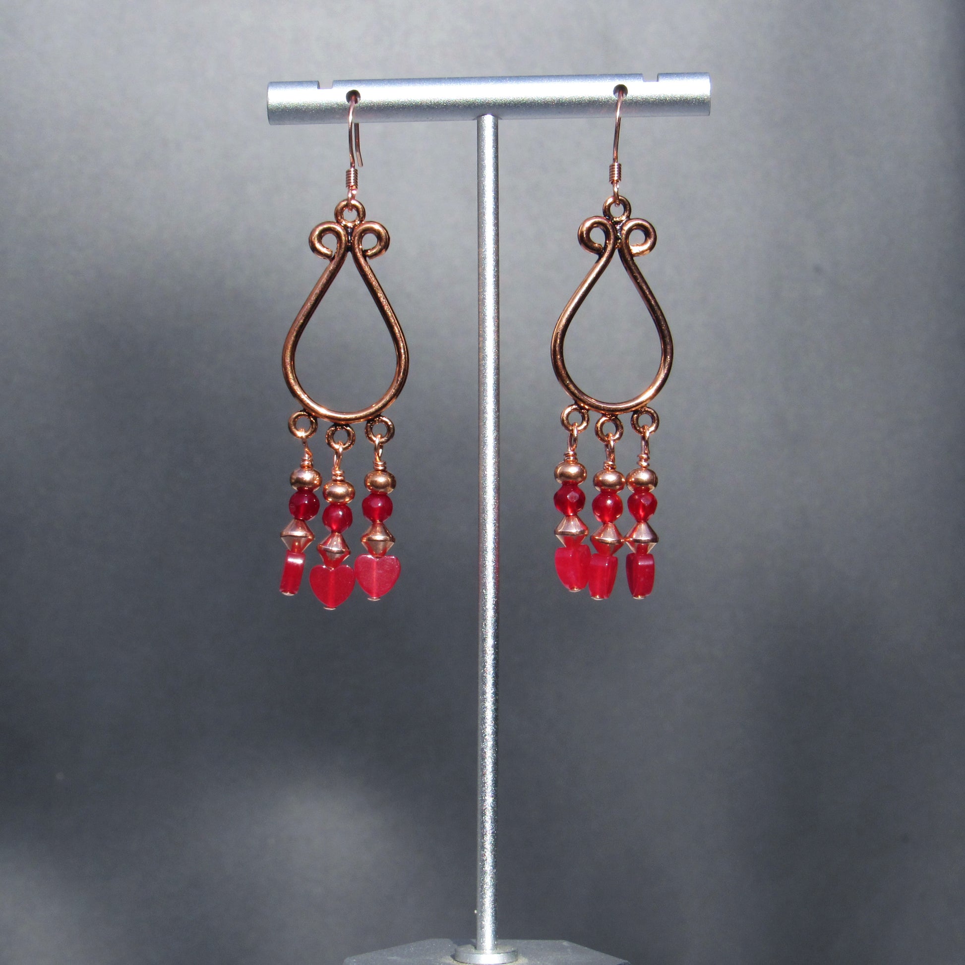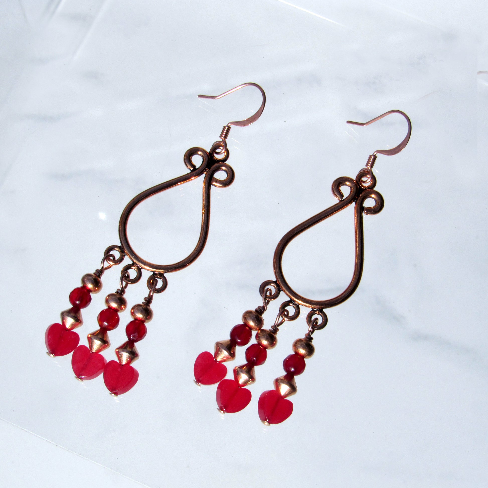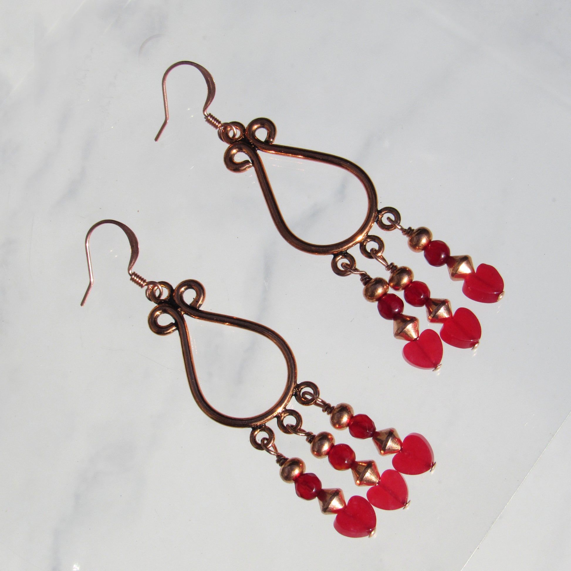 Jade gemstone hearts, Red agates, and copper chandelier earrings