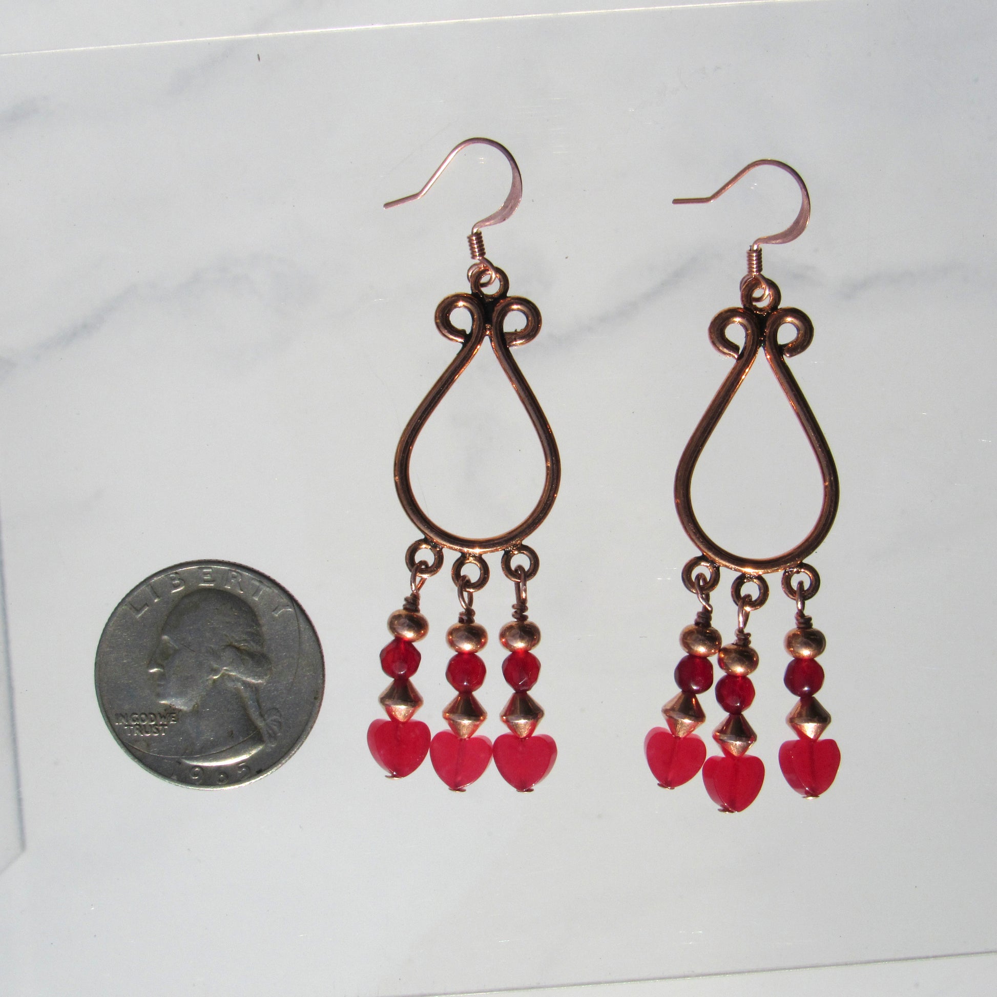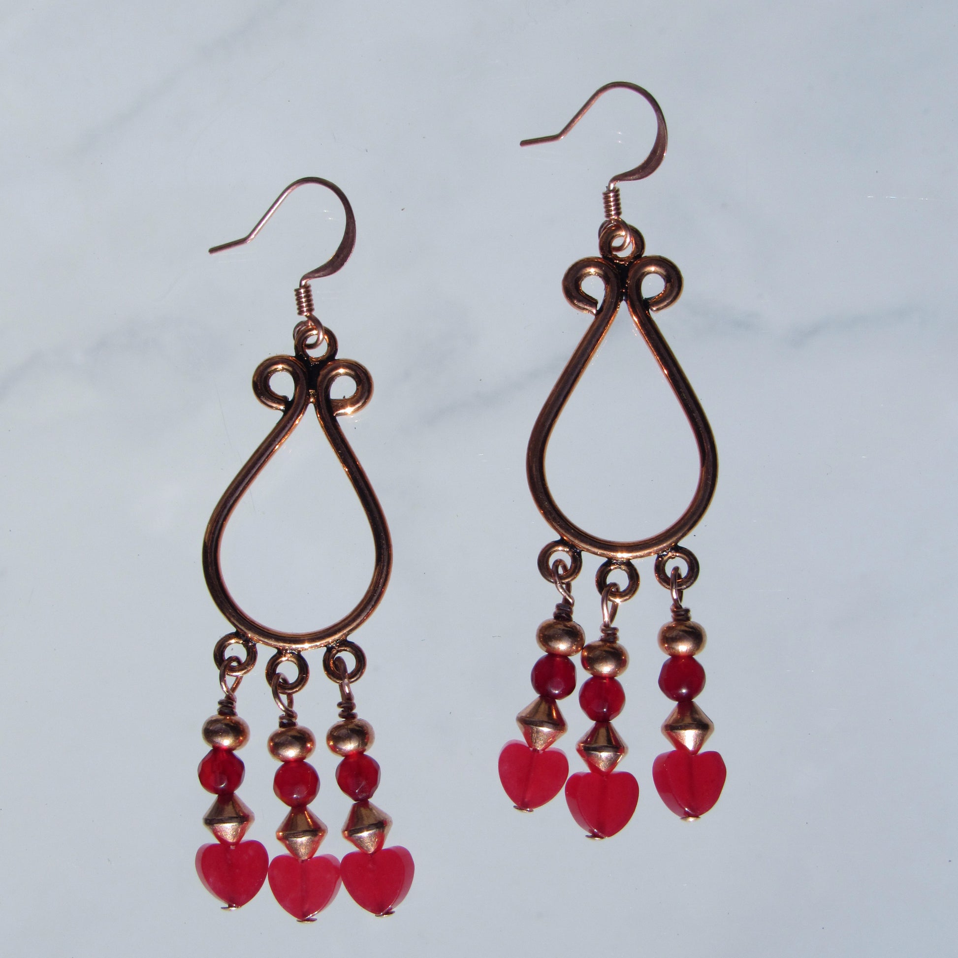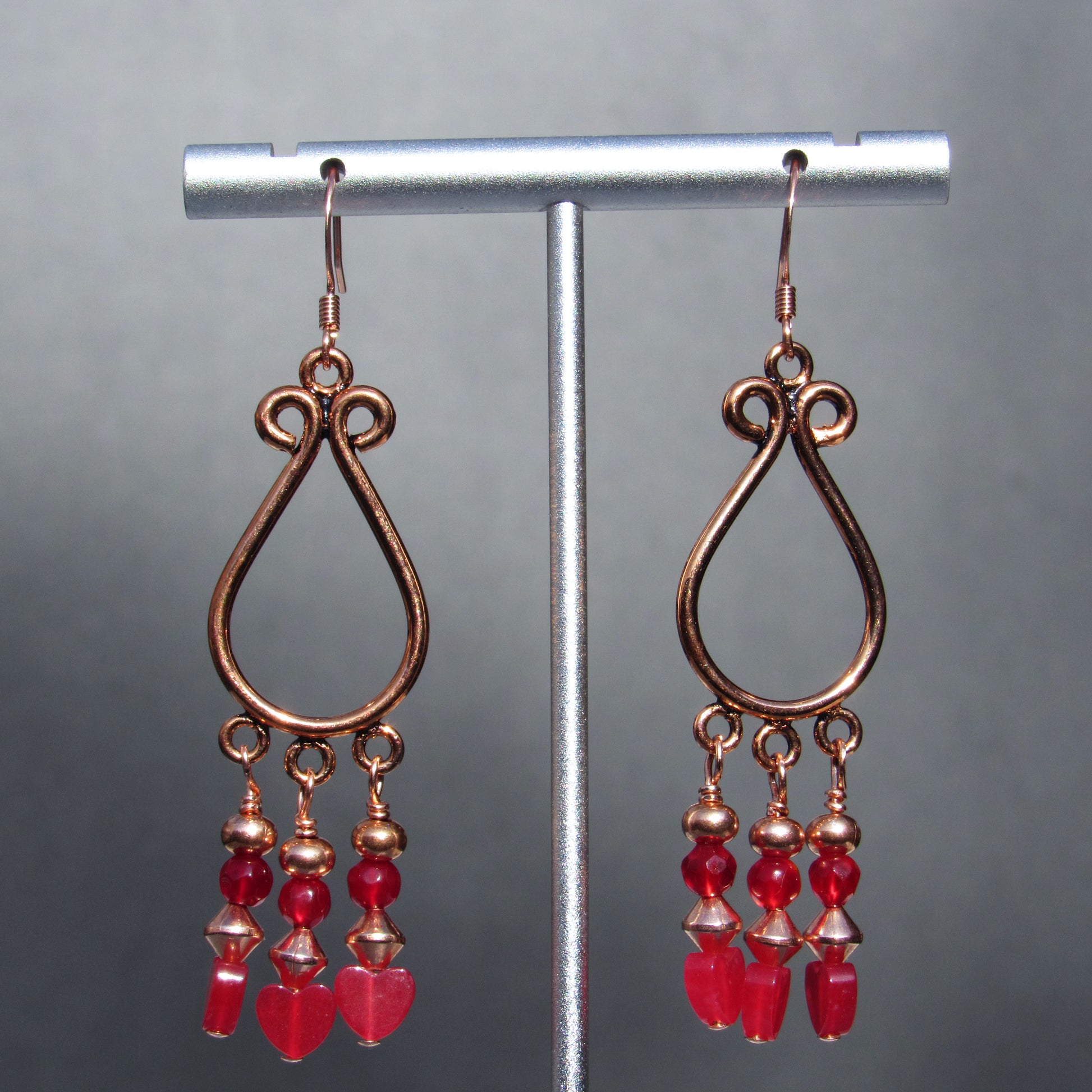 Jade gemstone hearts, Red agates, and copper chandelier earrings