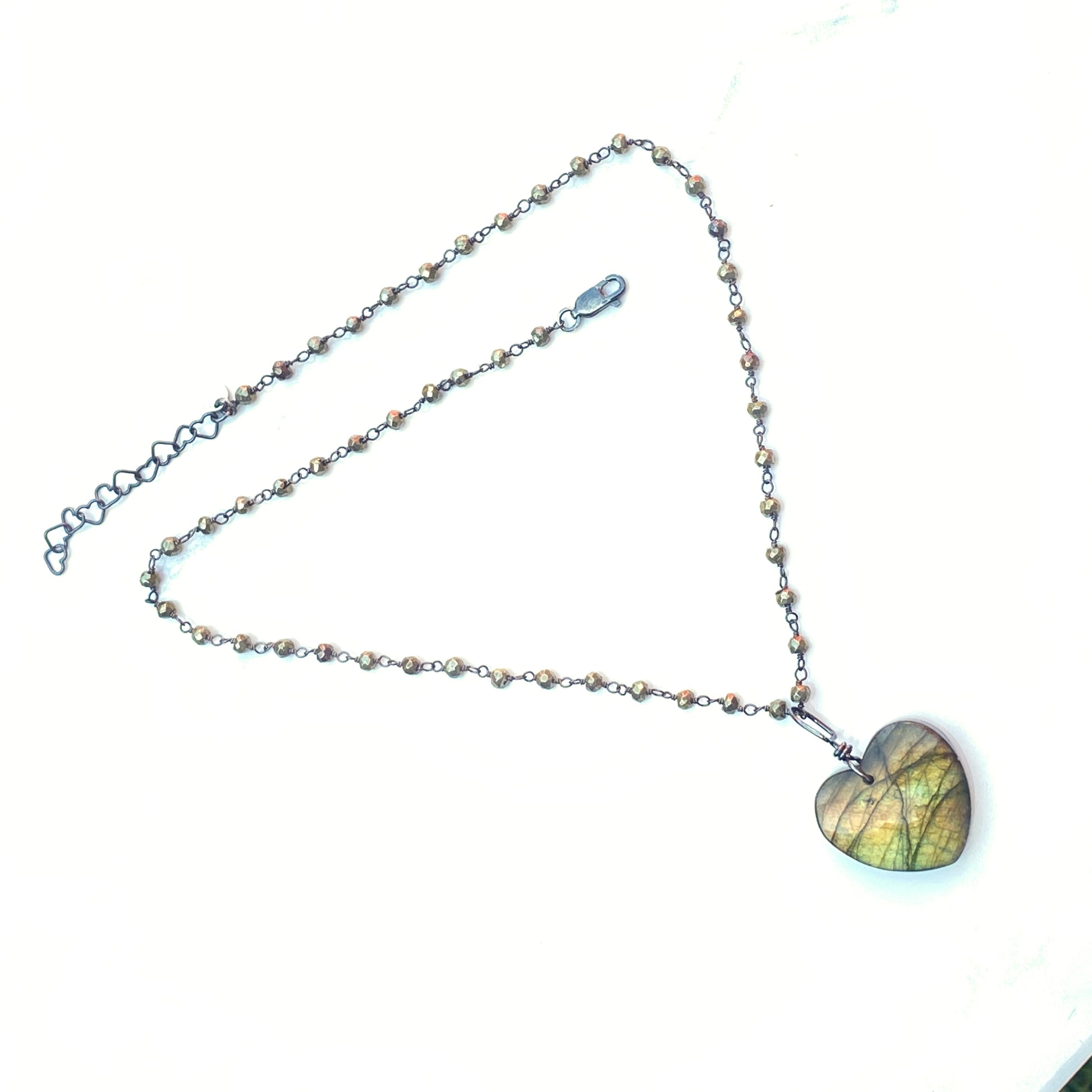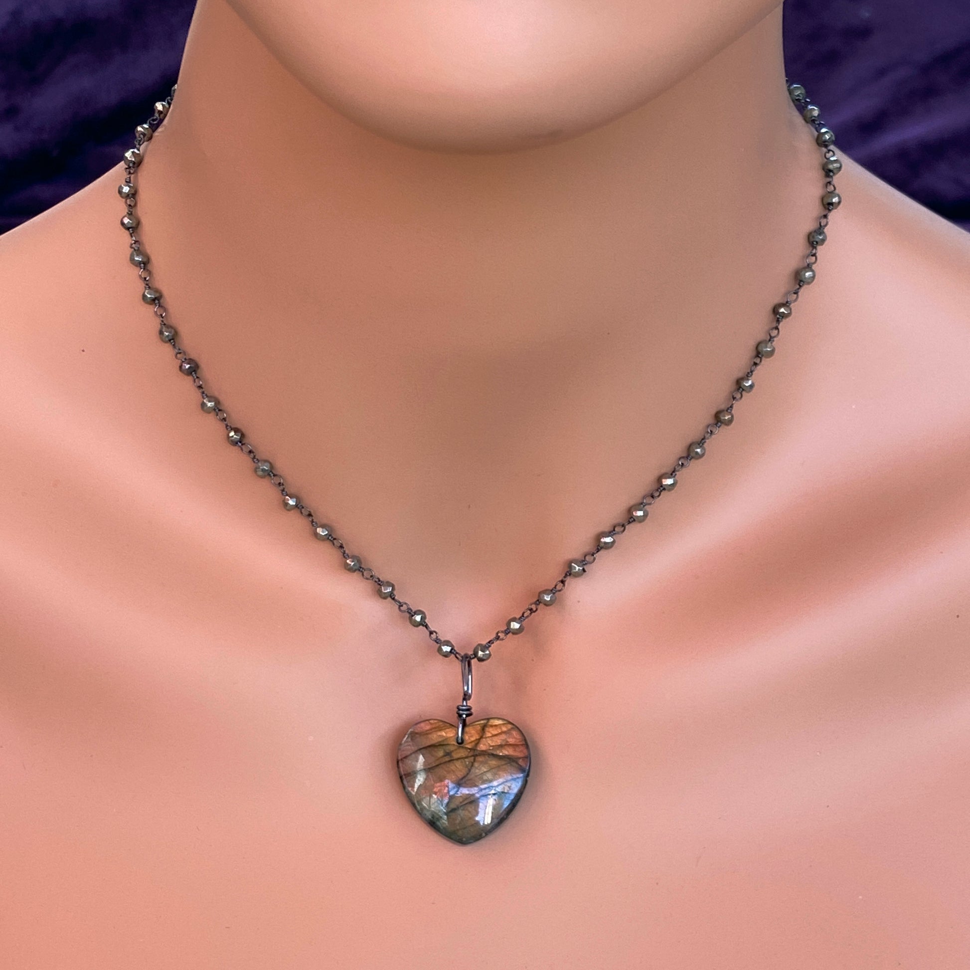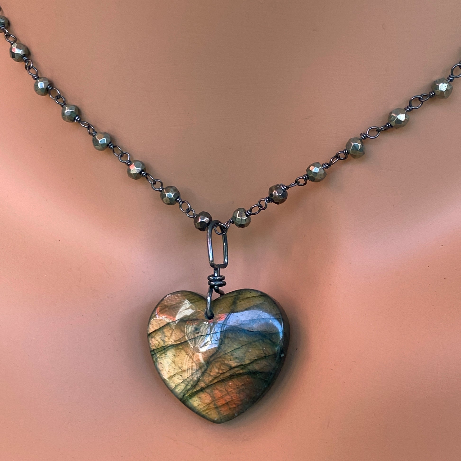 Labradorite Heart on Pyrite and Oxidized Sterling Silver Chain
