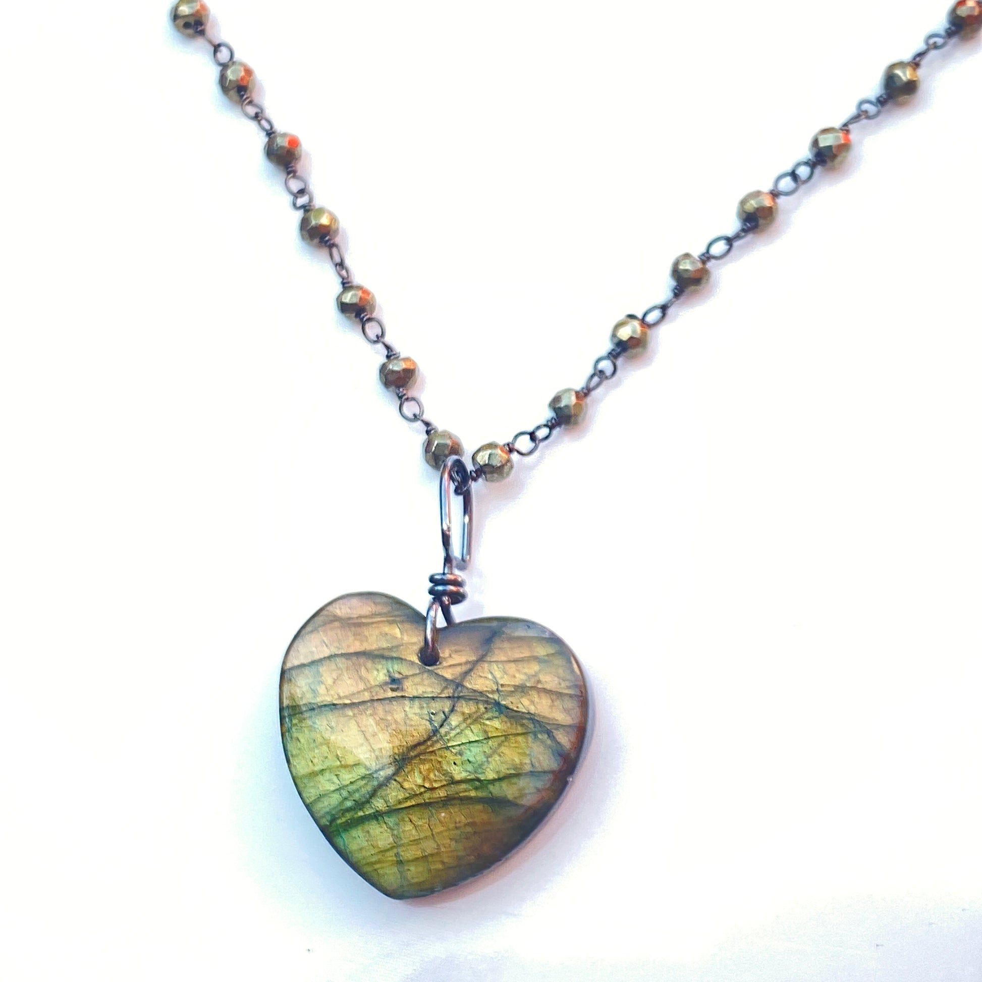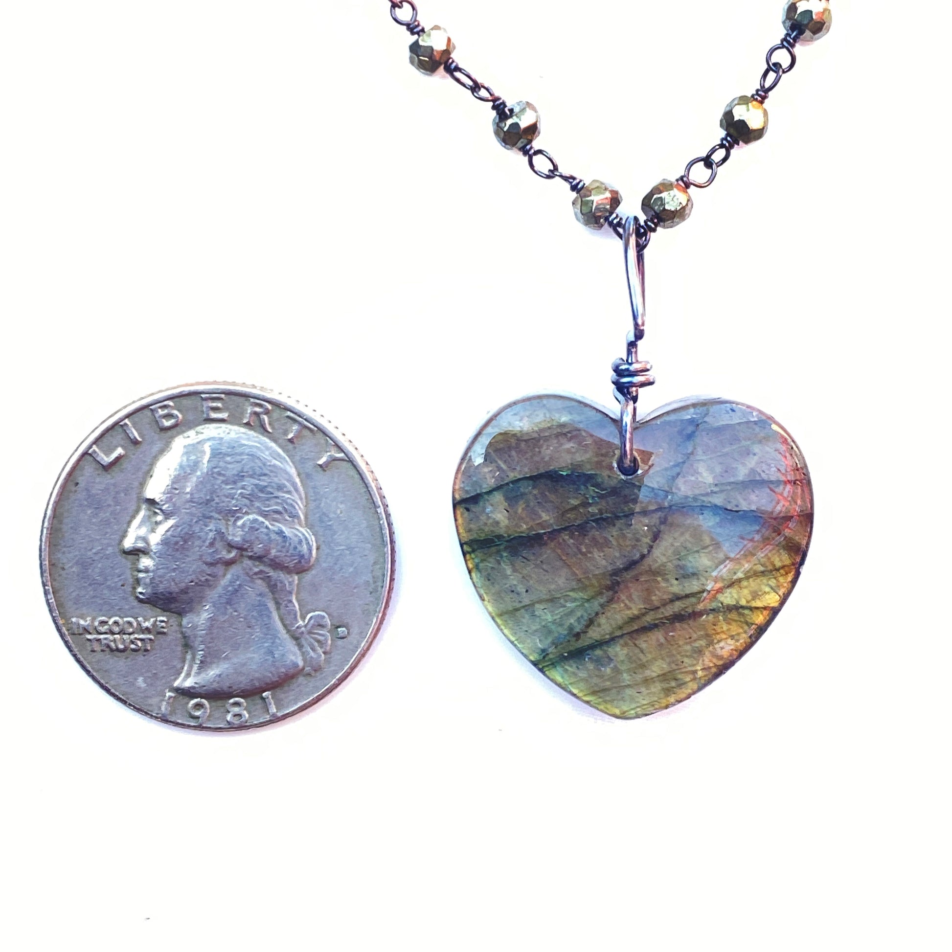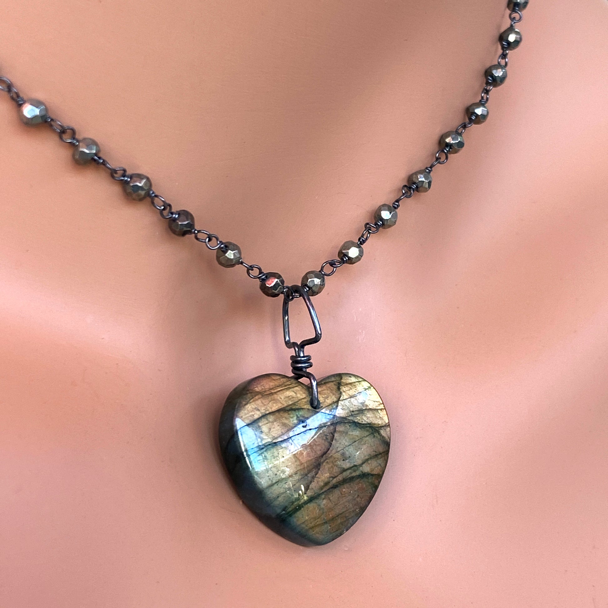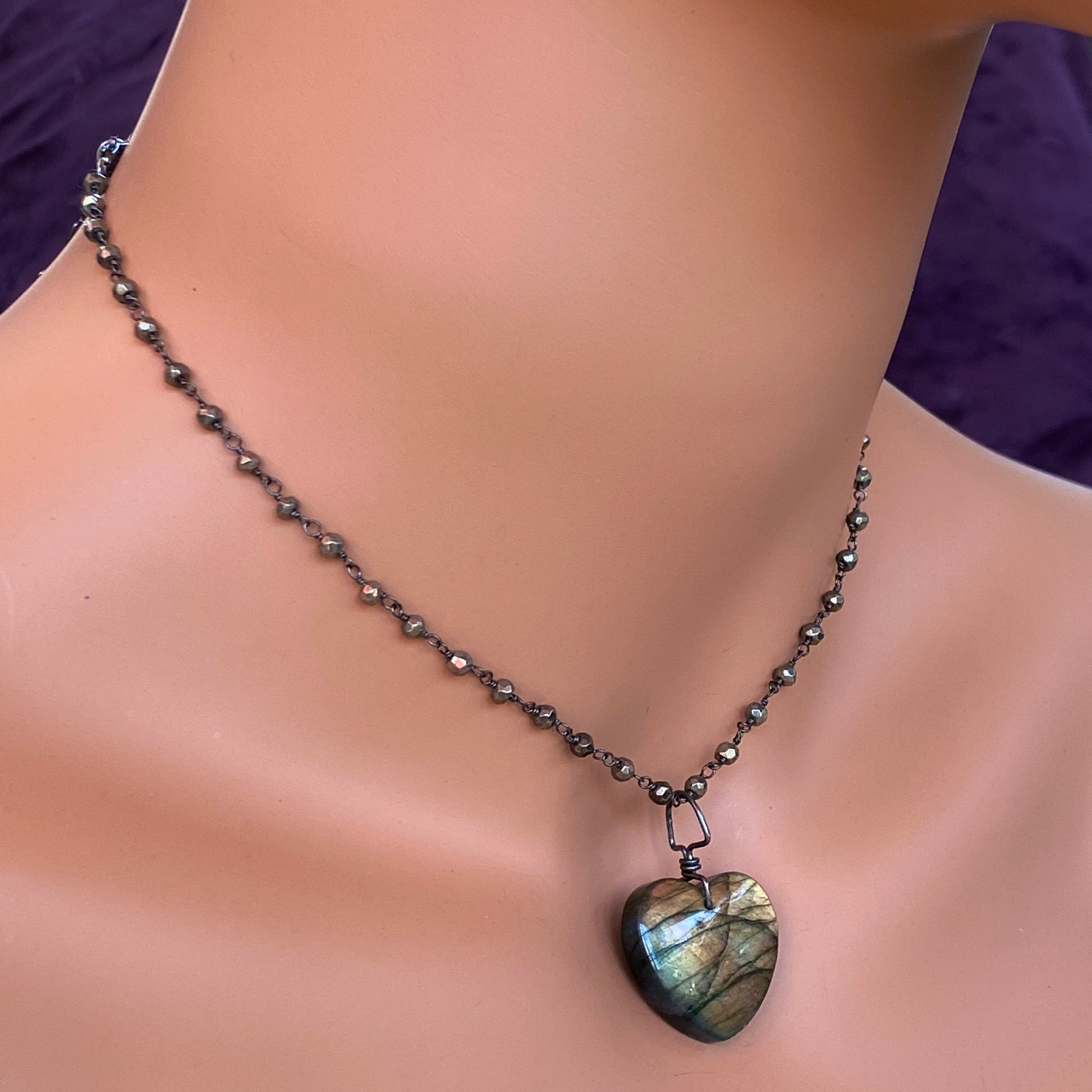 Labradorite Heart on Pyrite and Oxidized Sterling Silver Chain