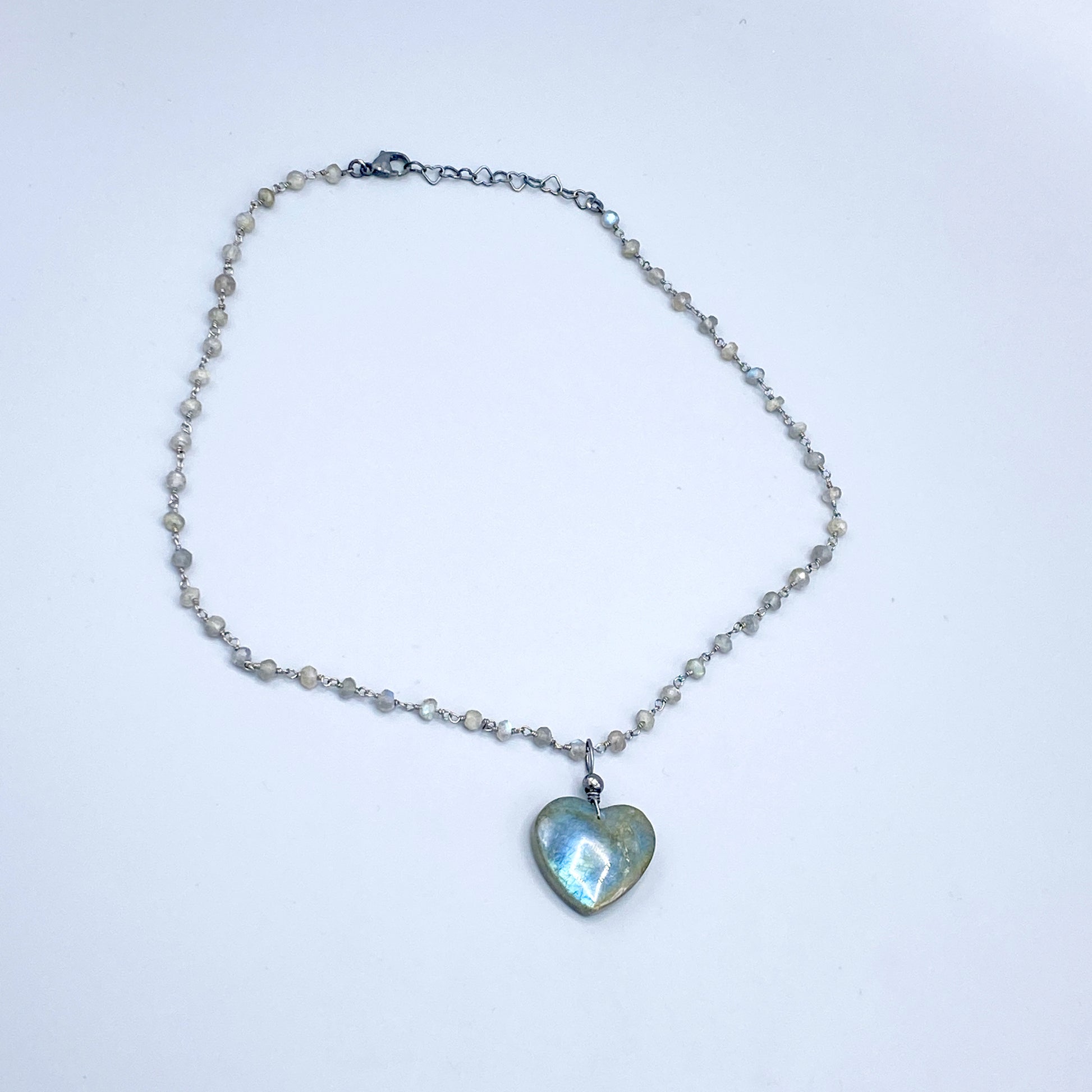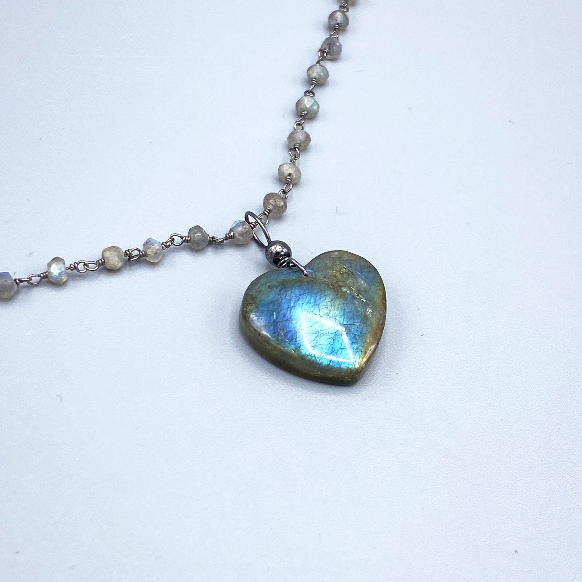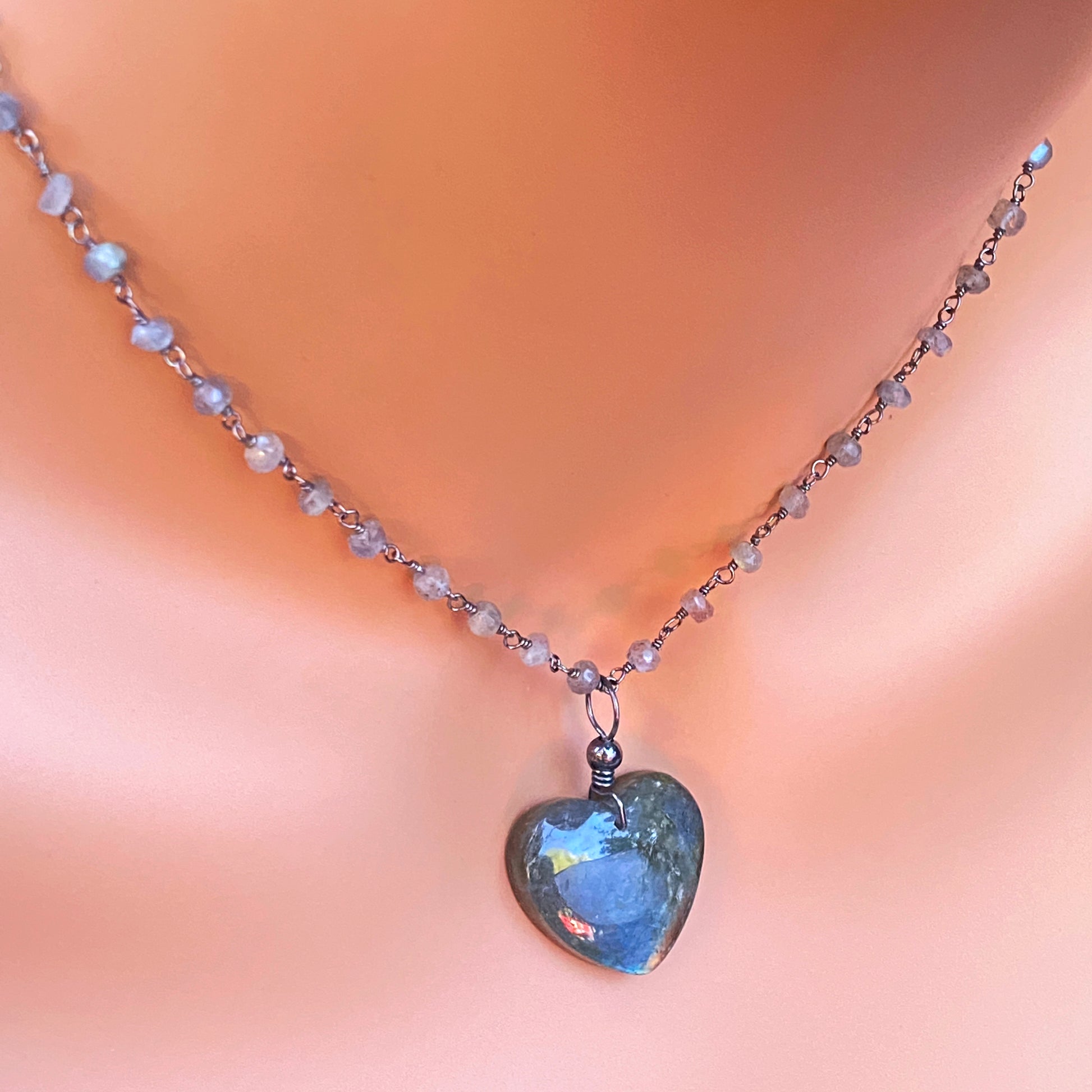 Blue Fire Labradorite Heart Pendant on Labradorite Wrapped w/ Oxidized Sterling Silver Chain necklace. 15.25" in length with a 1.5" extension, 16.75" total length.