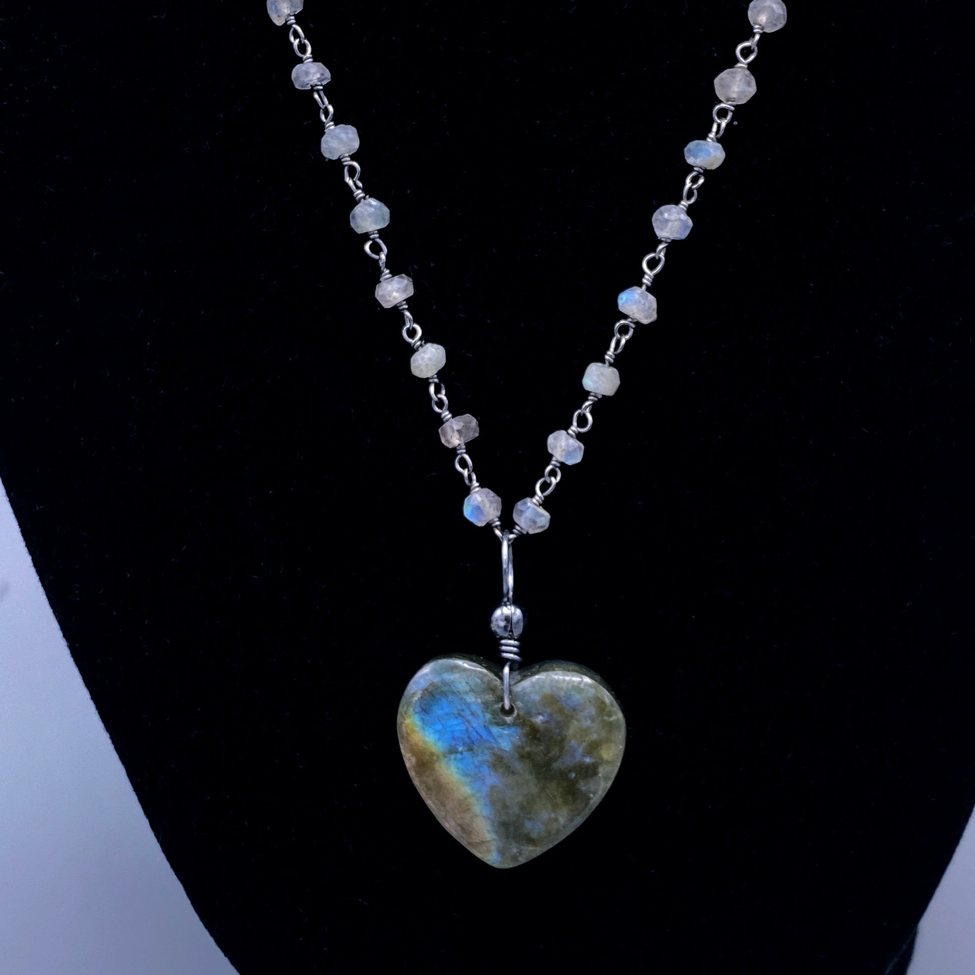 Blue Fire Labradorite Heart Pendant on Labradorite Wrapped Sterling Silver Chain
