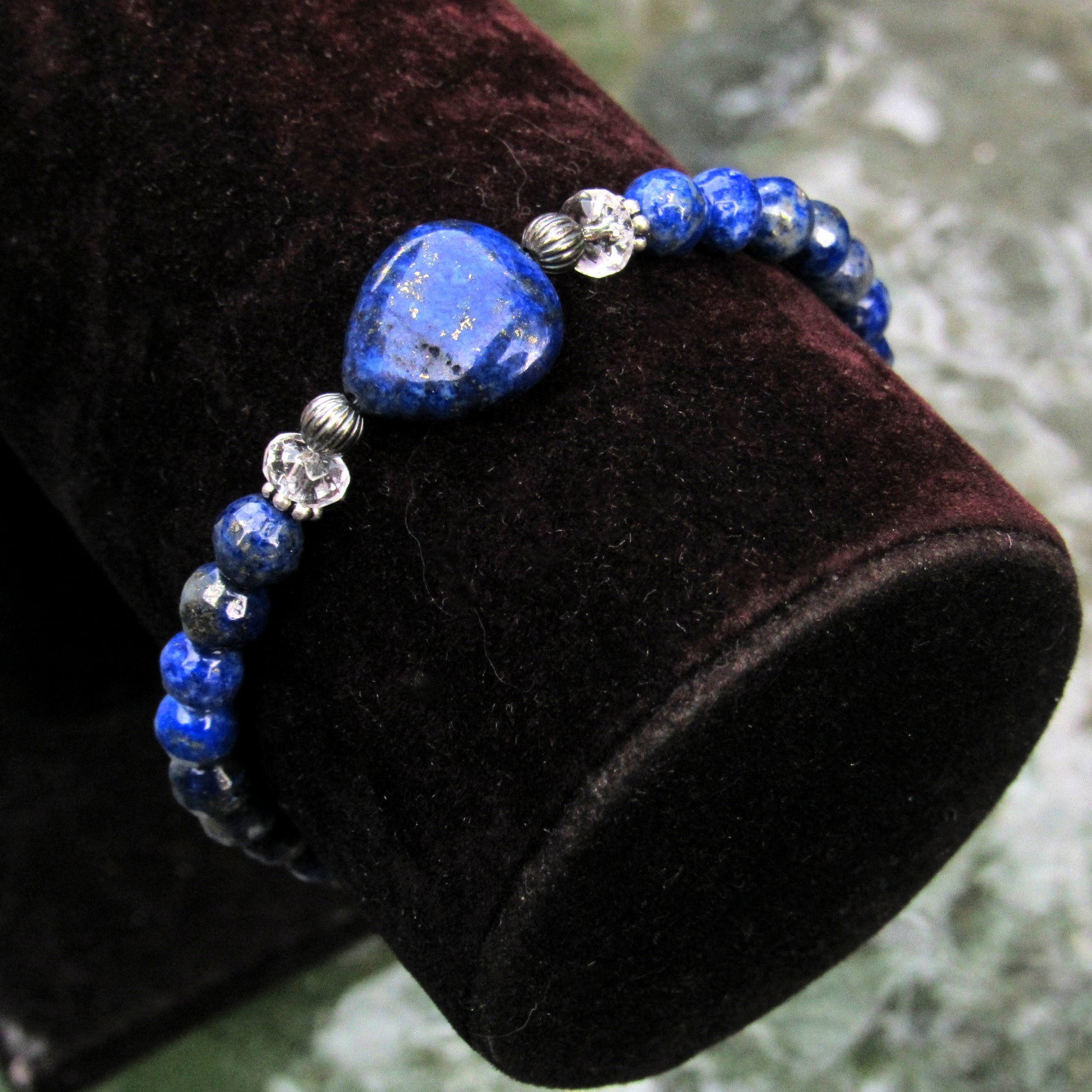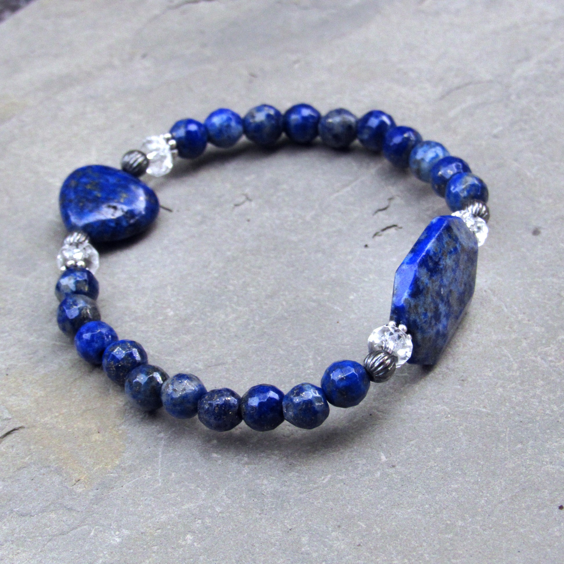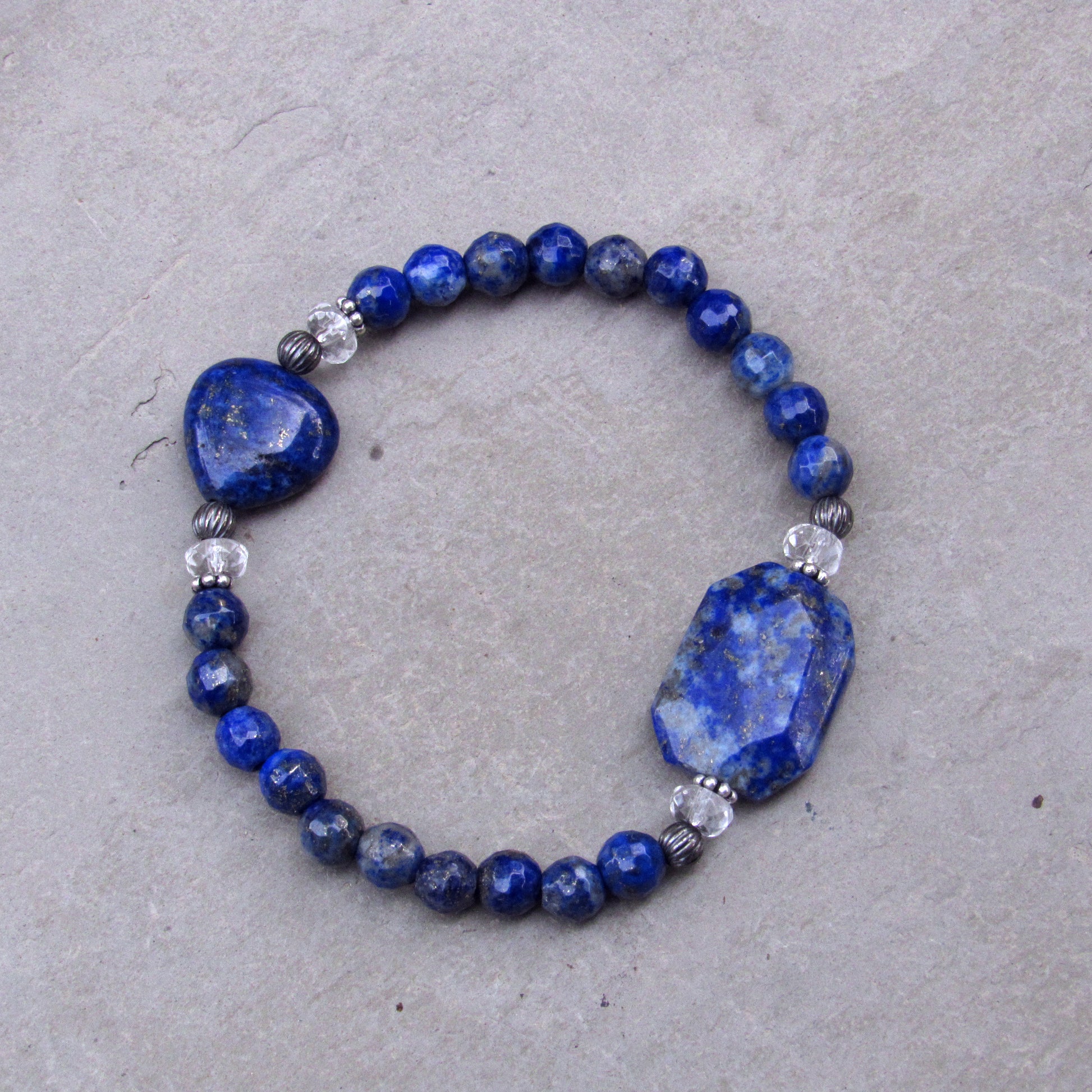 Lapis Lazuli, Clear Quartz, and Oxidized Sterling Silver Stretch Bracelet w/ Heart