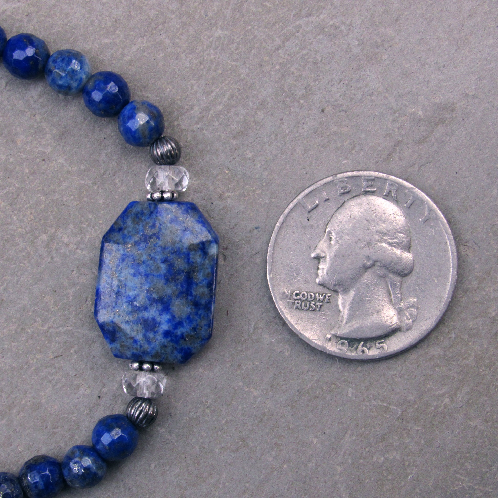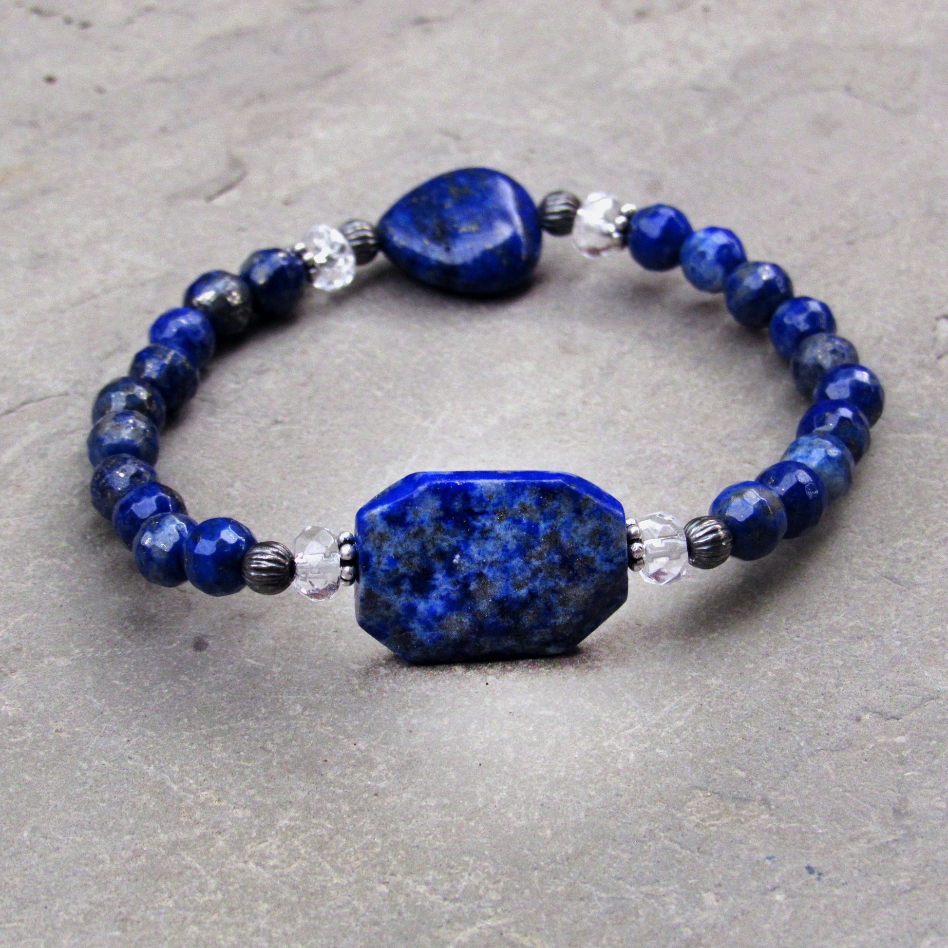 Lapis Lazuli gemstone, Clear Quartz, and Oxidized Sterling Silver Stretch Bracelet