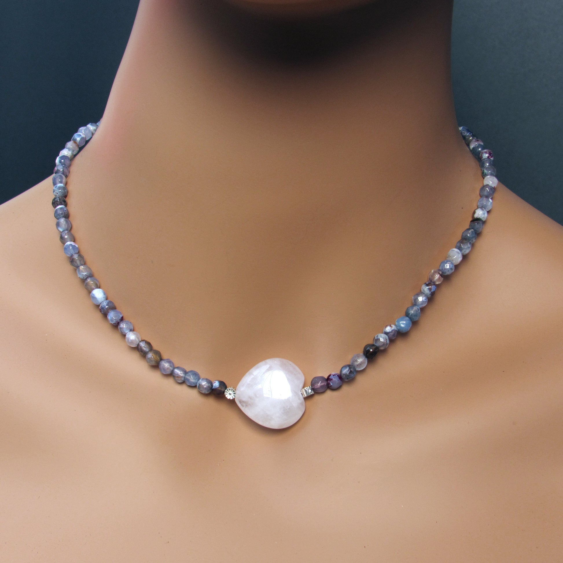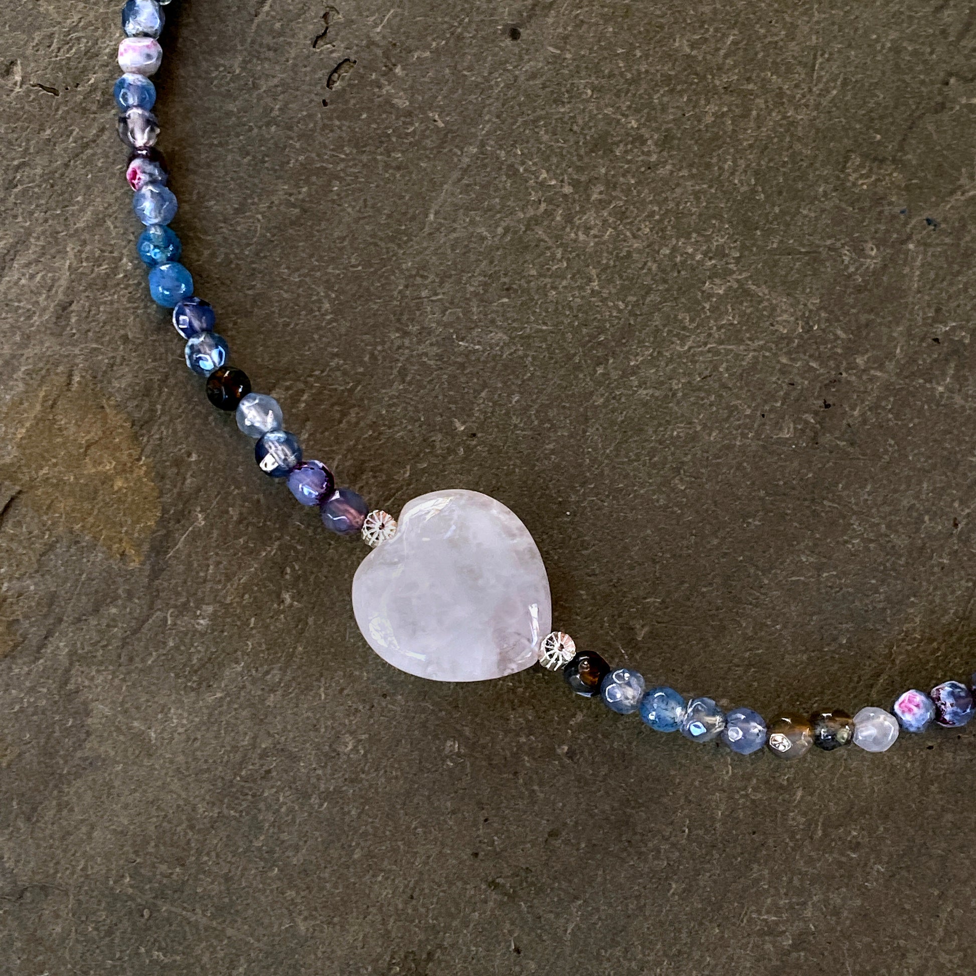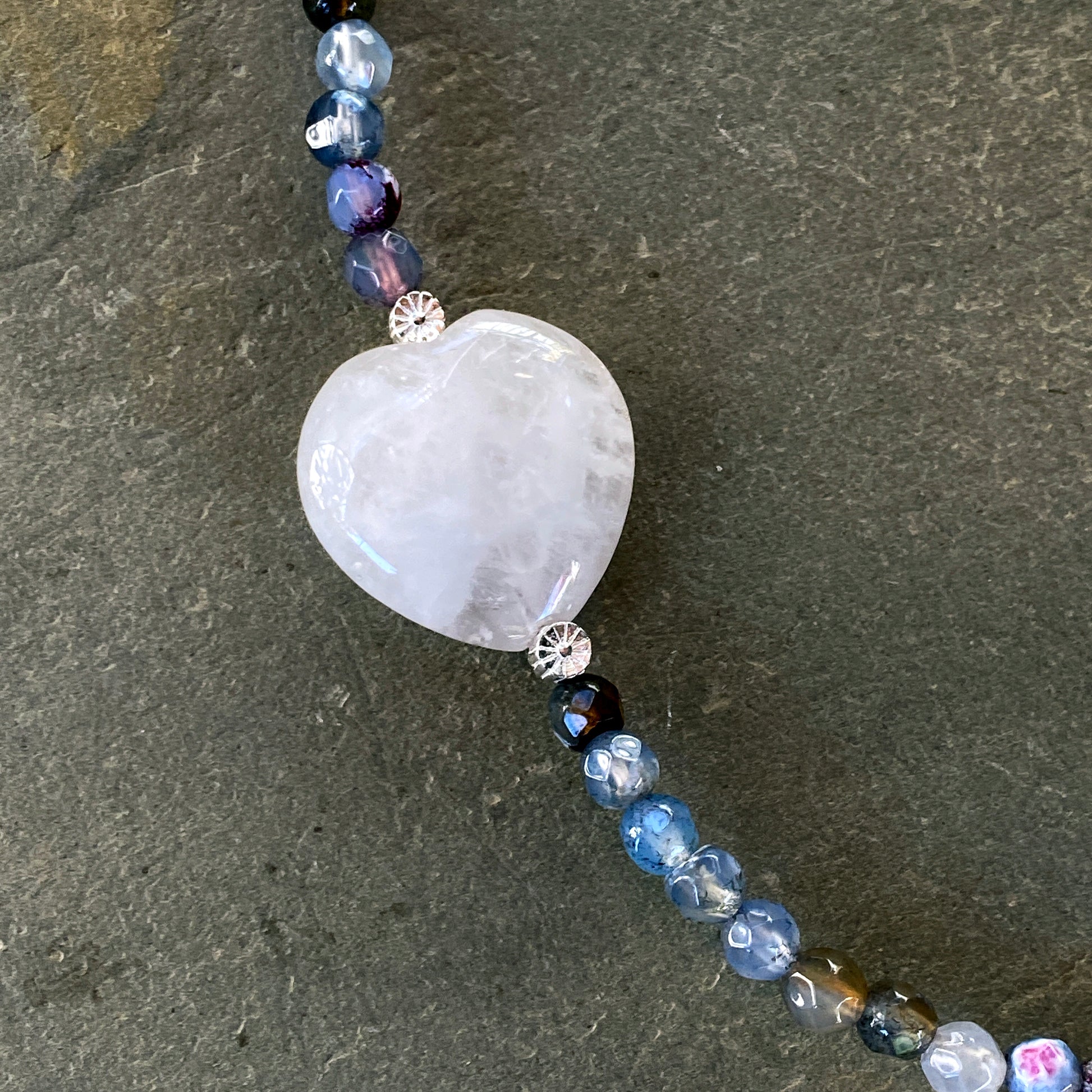 Mixed Agates, Rose Quartz heart, and Sterling Silver Flowers Necklace