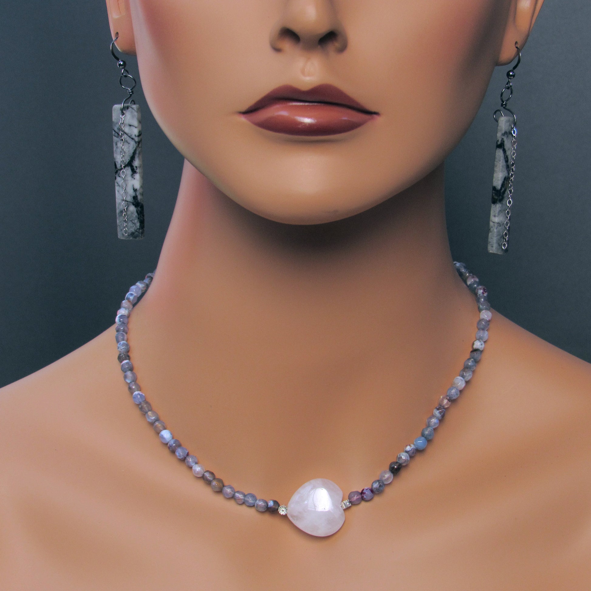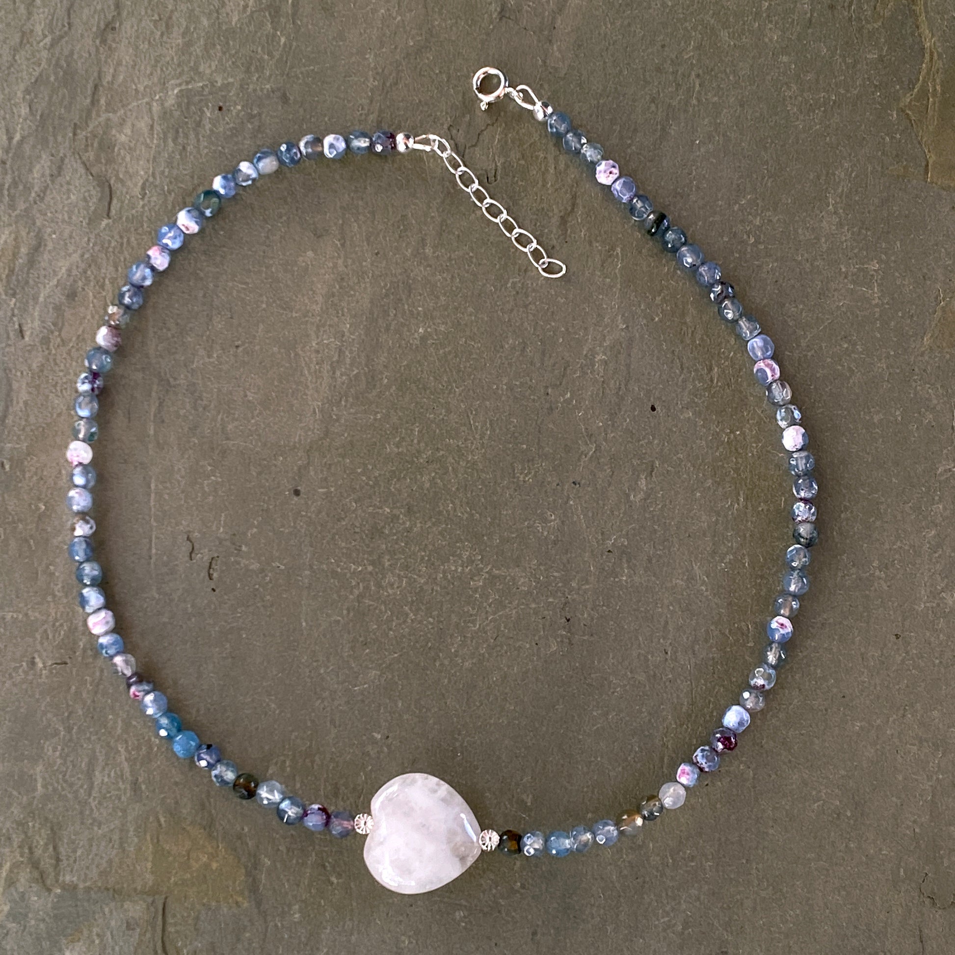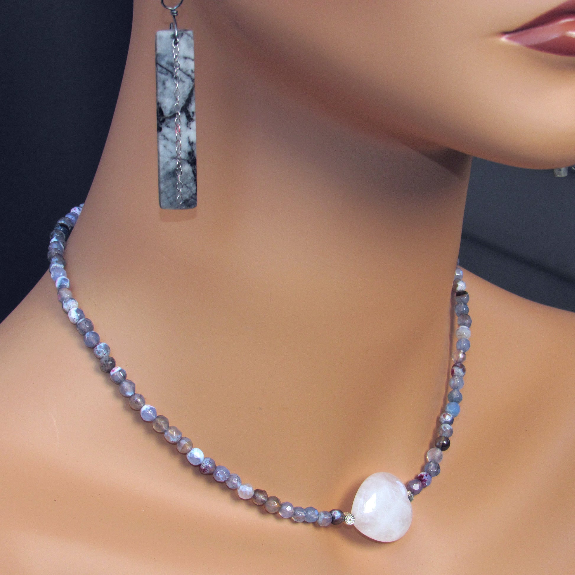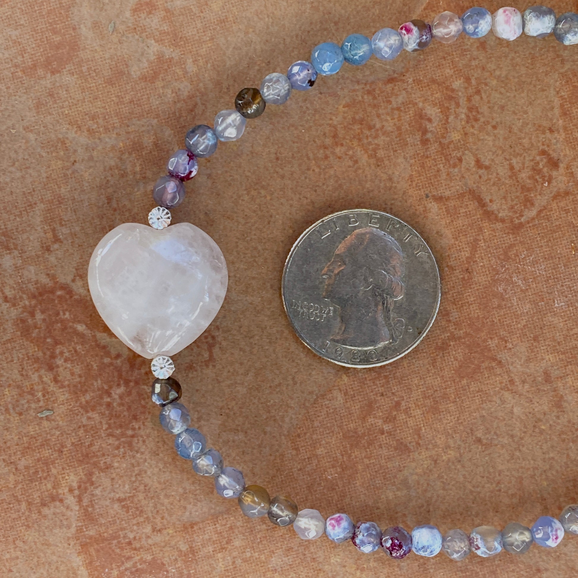 Mixed Agates, Rose Quartz heart, and Sterling Silver Flowers Necklace