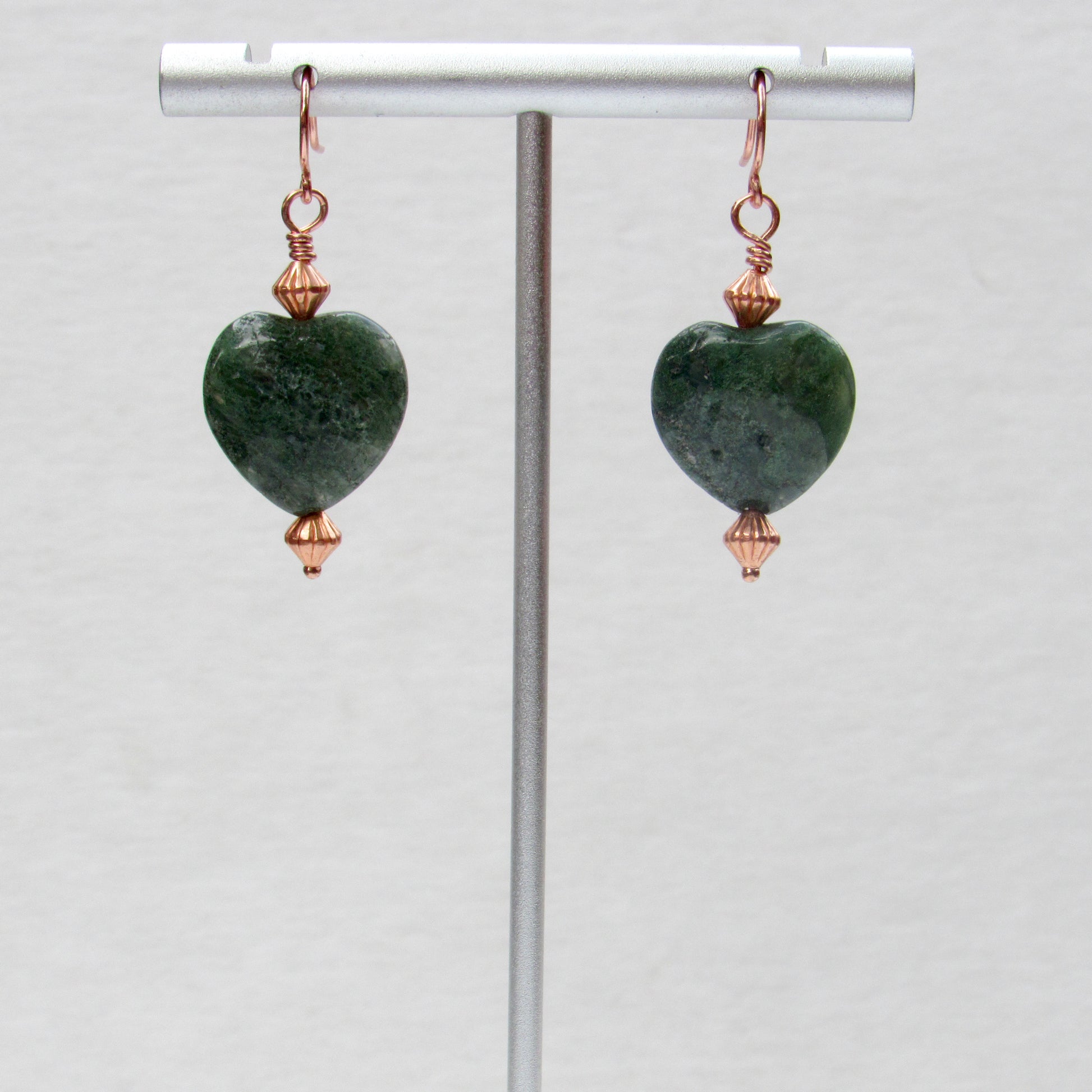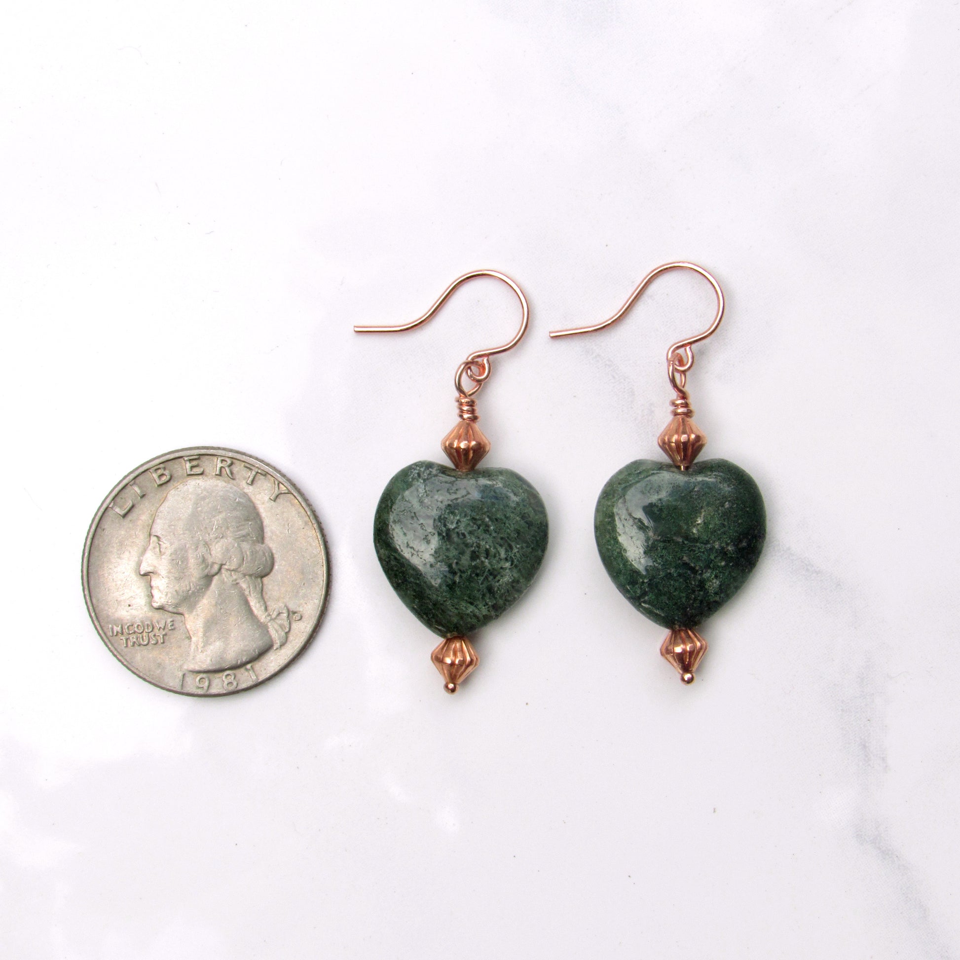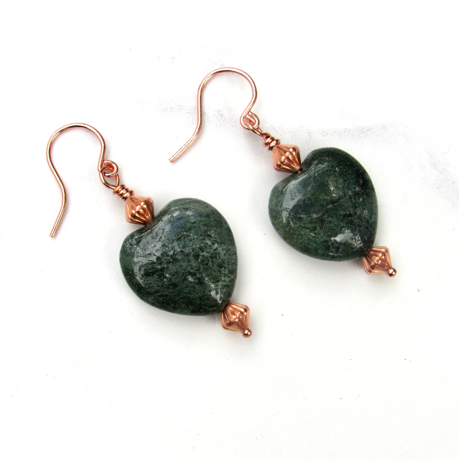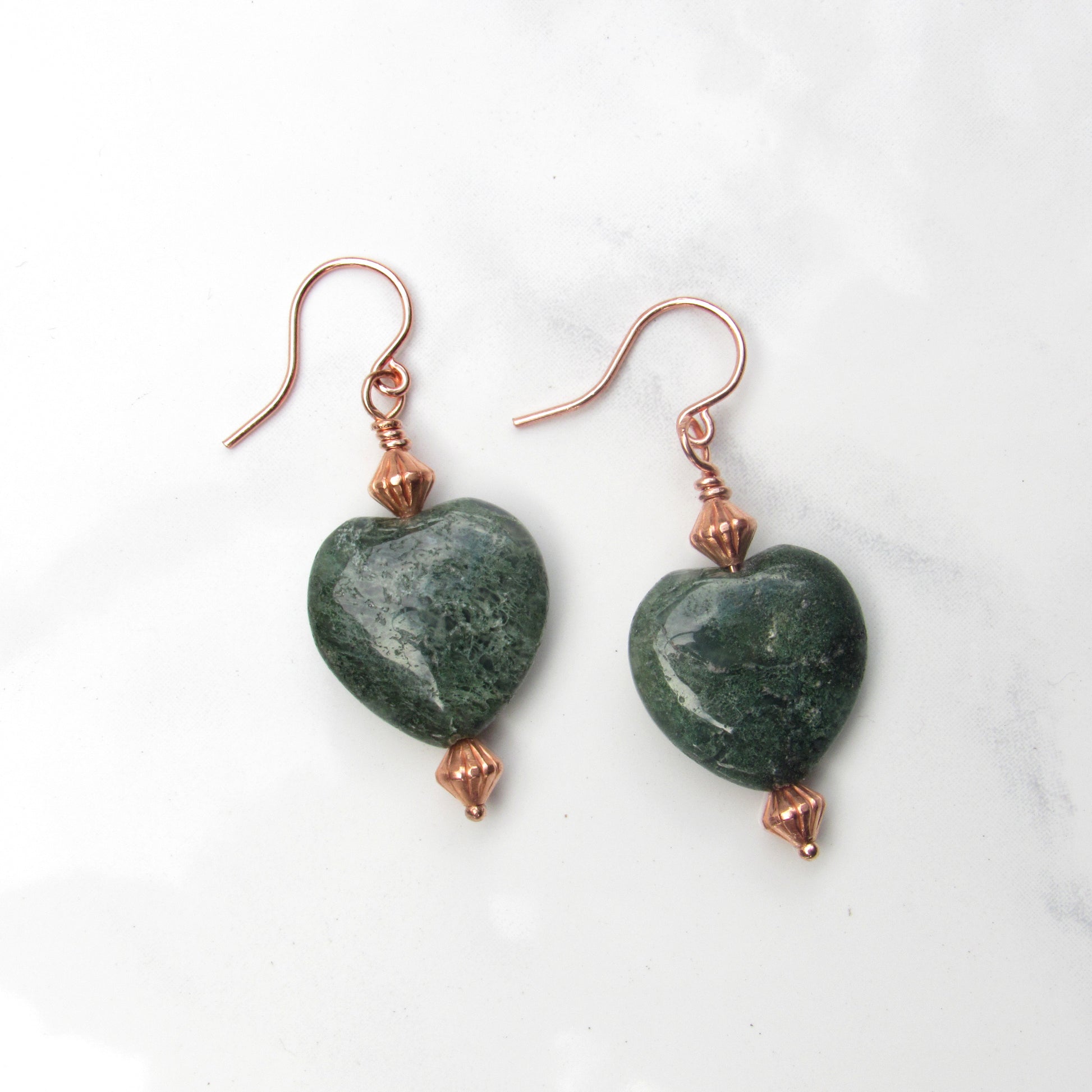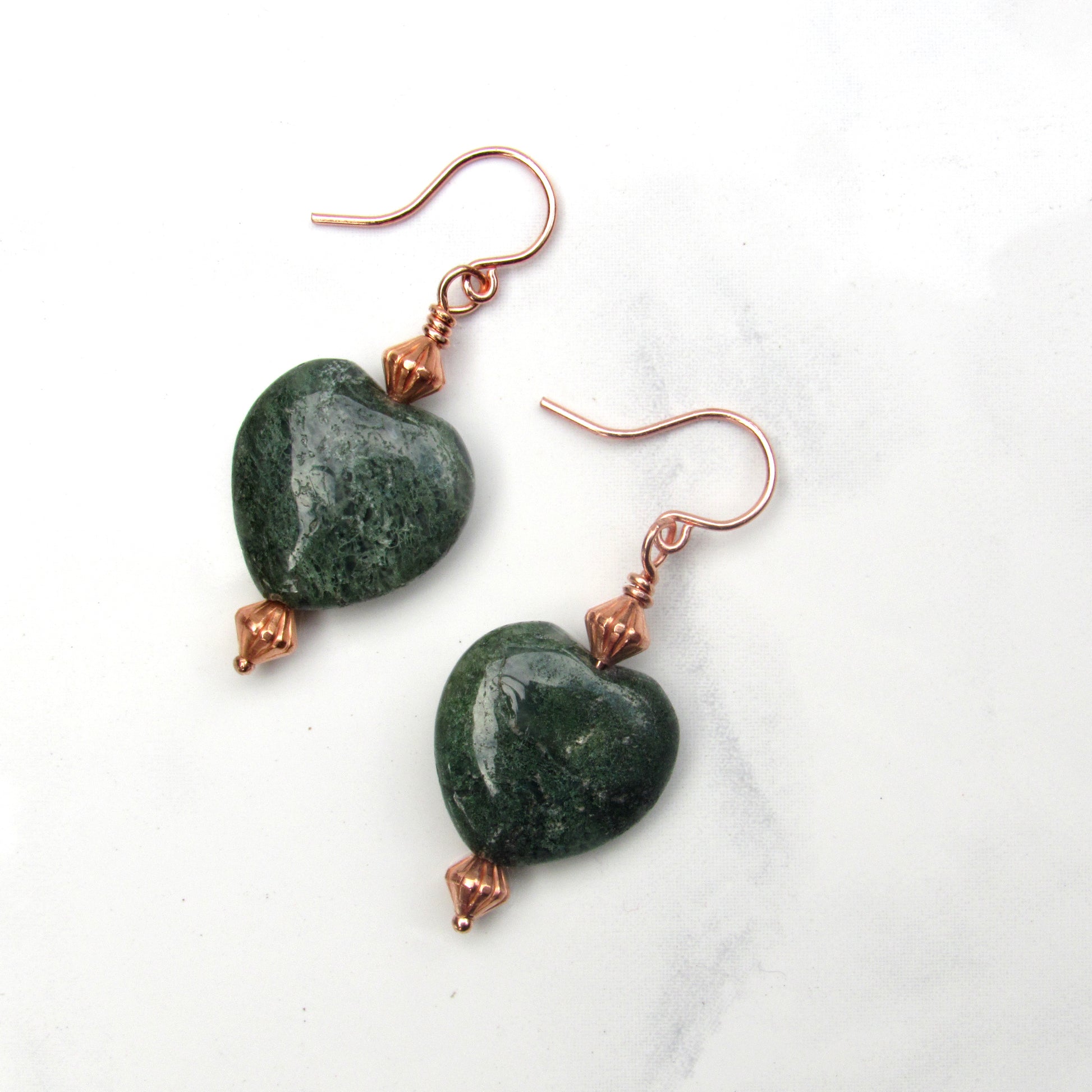 Moss Agate gemstone Heart on Copper ear wire Drop earrings