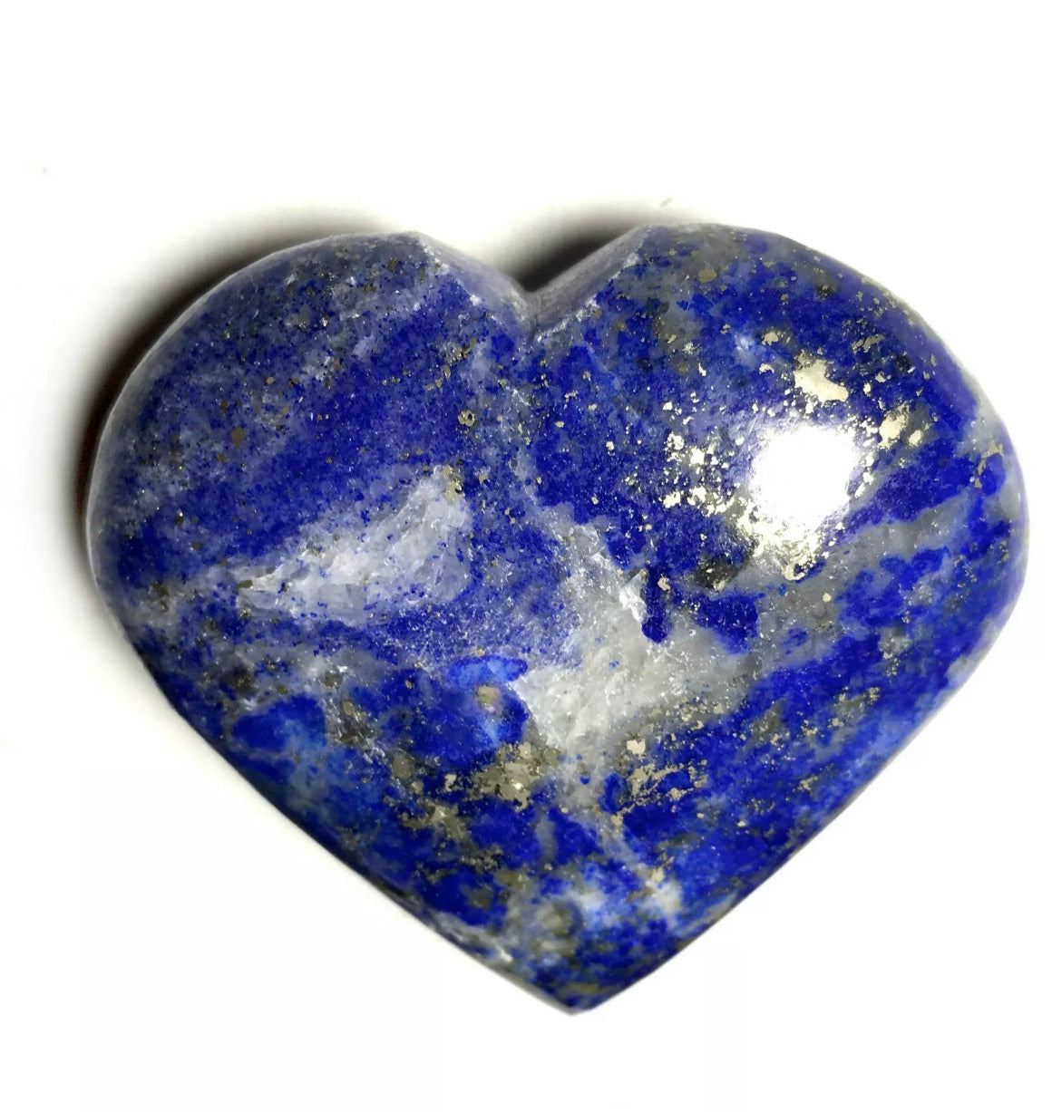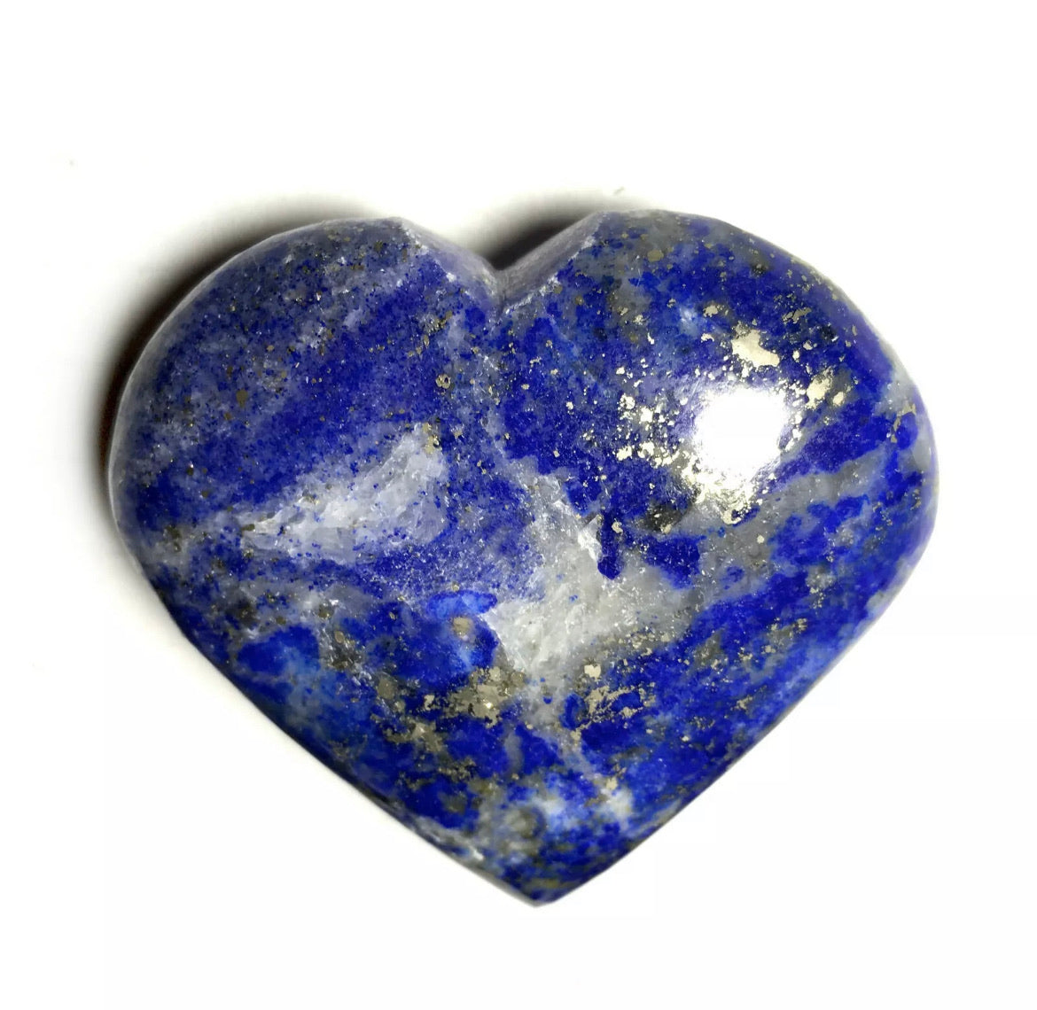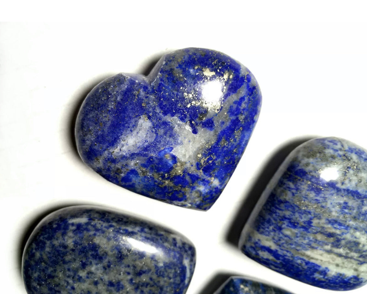 These puffy heart palm stones are hand polished, each lapis stone is unique, photos are examples of several puffy hearts however please look at all the pictures. Lapis lazuli does vary in shades of blue and some grey with inclusions of sparkly pyrite as well - the heart stone you receive will be very similar, but not the exact lapis lazuli stone pictured. Blue Lapis Lazuli puffy hearts are about 2"Wide by about 2"Tall.