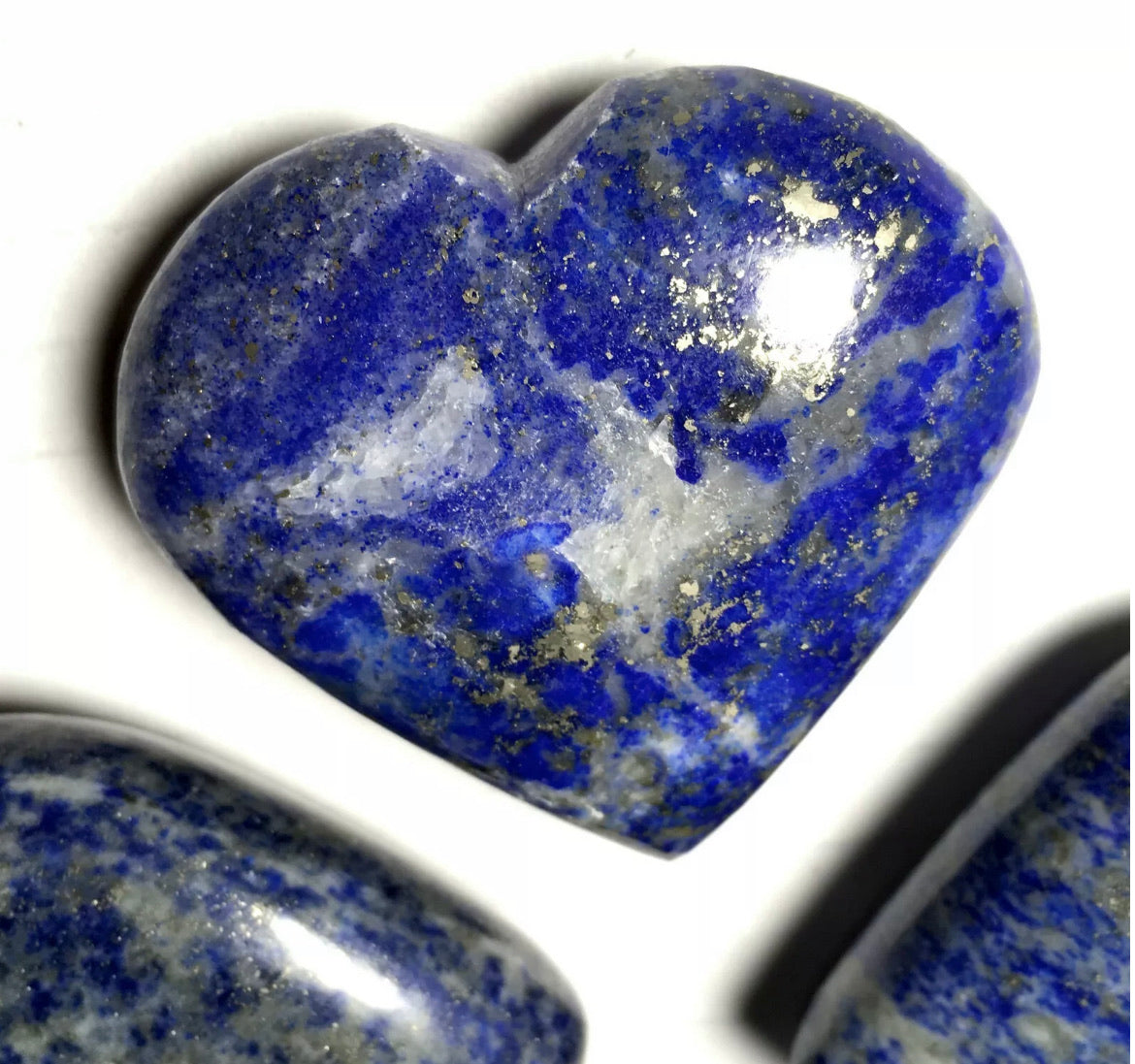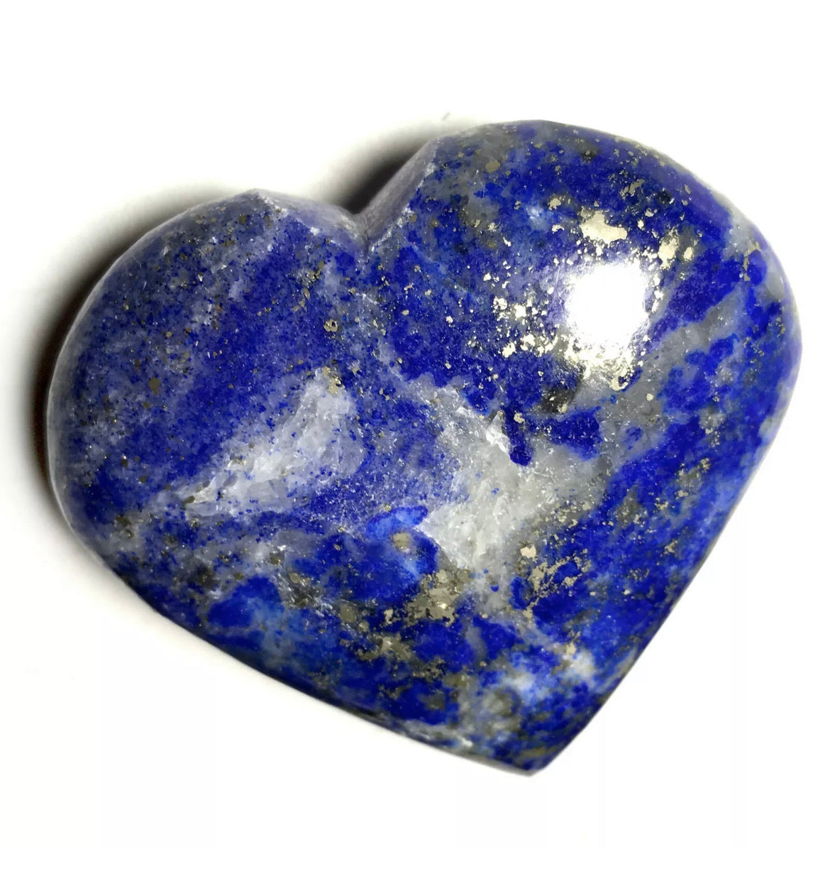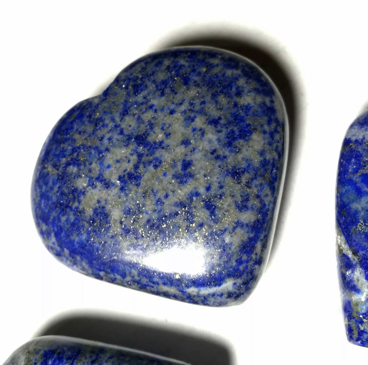 These puffy heart palm stones are hand polished, each lapis stone is unique, photos are examples of several puffy hearts however please look at all the pictures. Lapis lazuli does vary in shades of blue and some grey with inclusions of sparkly pyrite as well - the heart stone you receive will be very similar, but not the exact lapis lazuli stone pictured. Blue Lapis Lazuli puffy hearts are about 2"Wide by about 2"Tall.