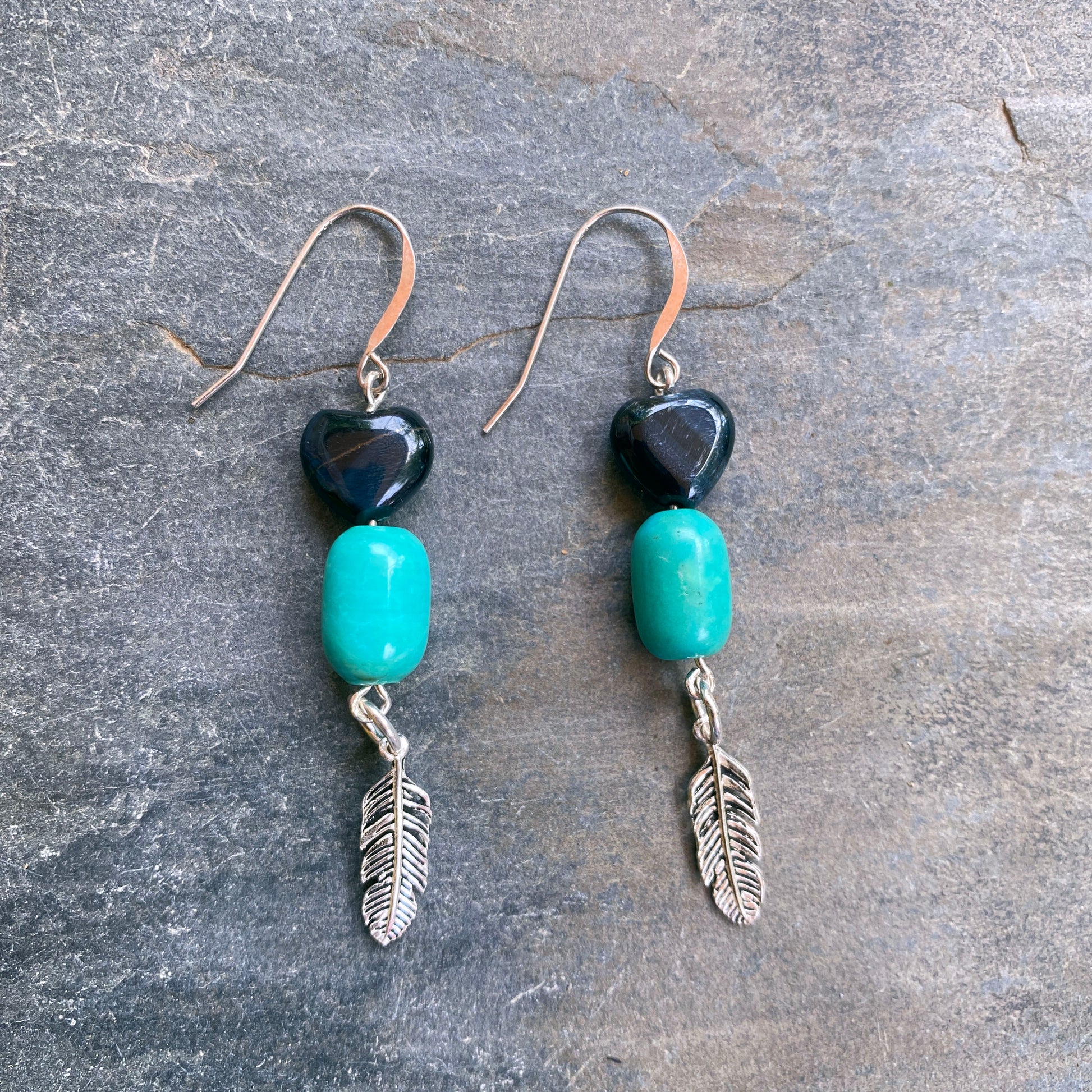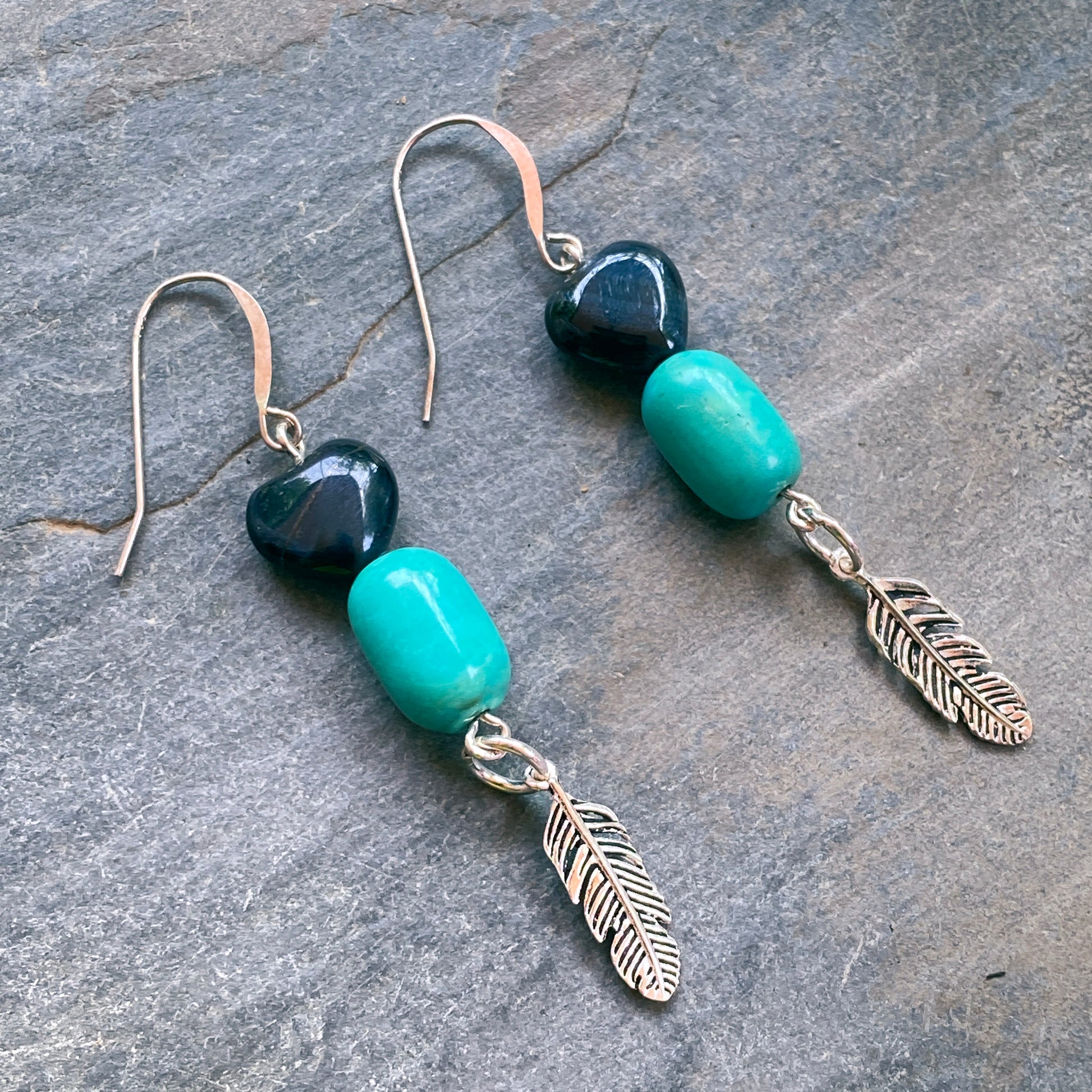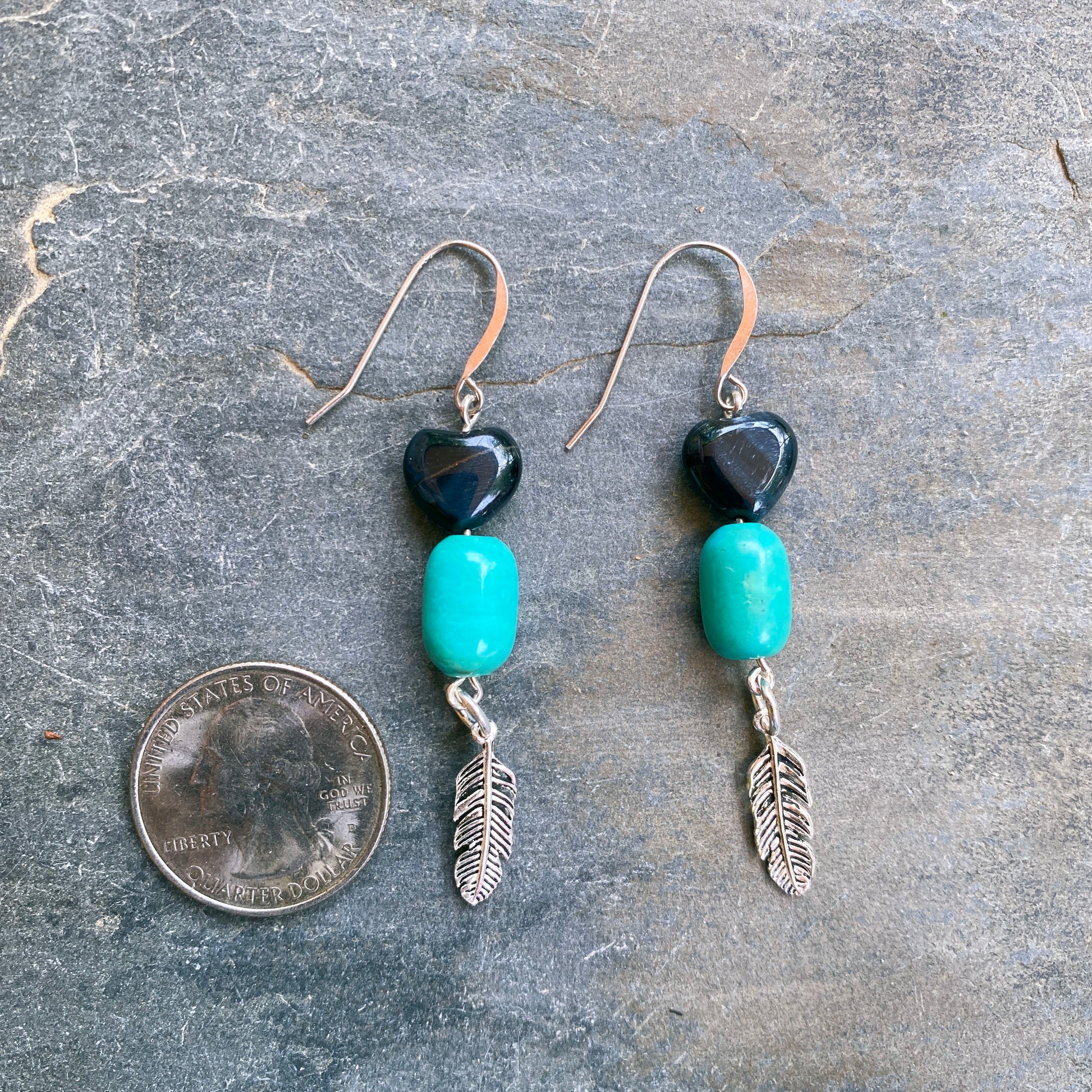 Blue TigerEye Heart and Turquoise Gemstone with Silver Feather drop Earrings