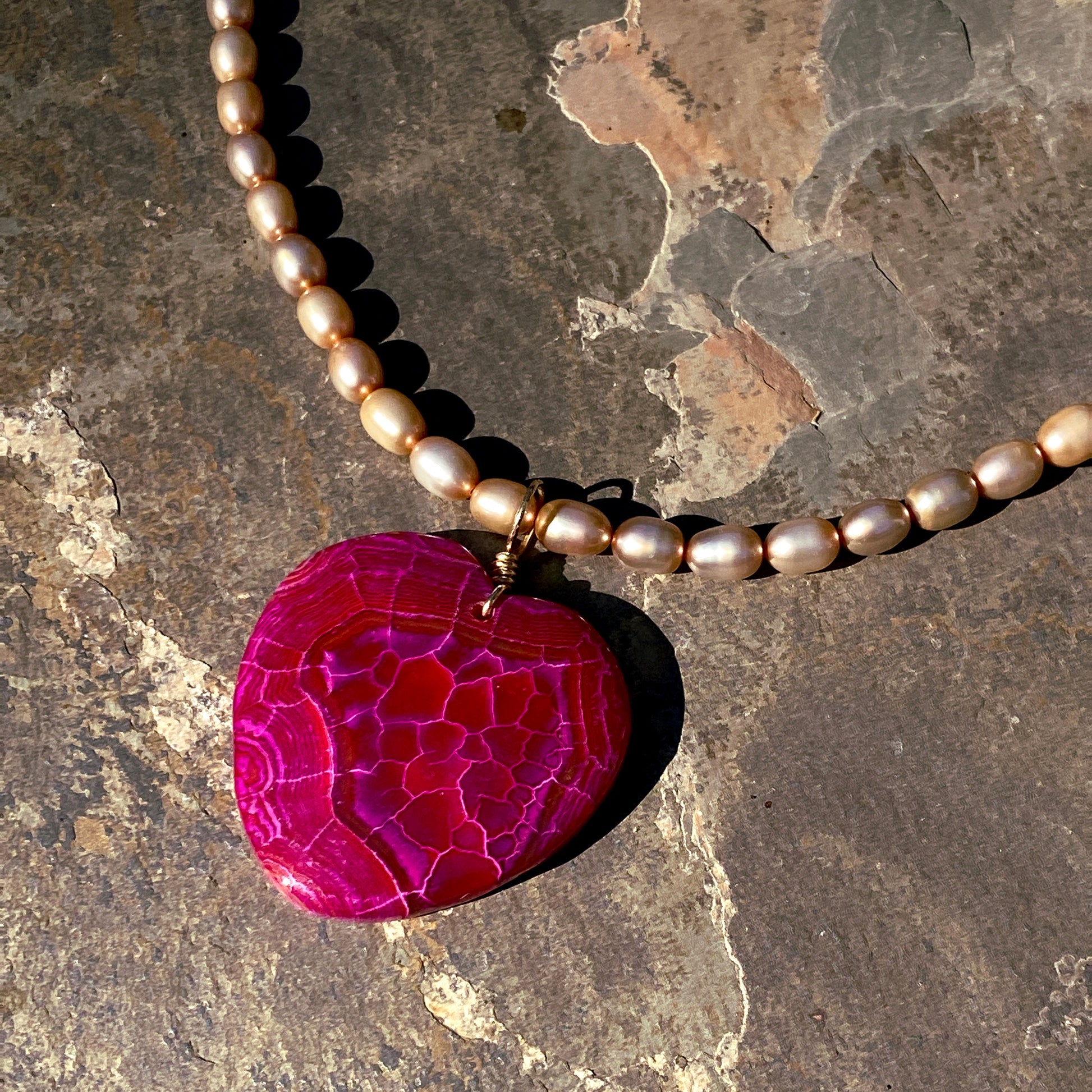 Pearl Necklace W/ Dragons Vein Agate Gemstone Heart