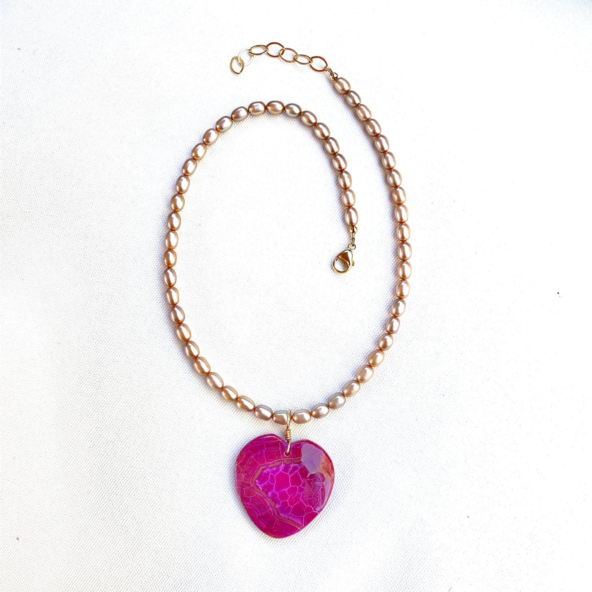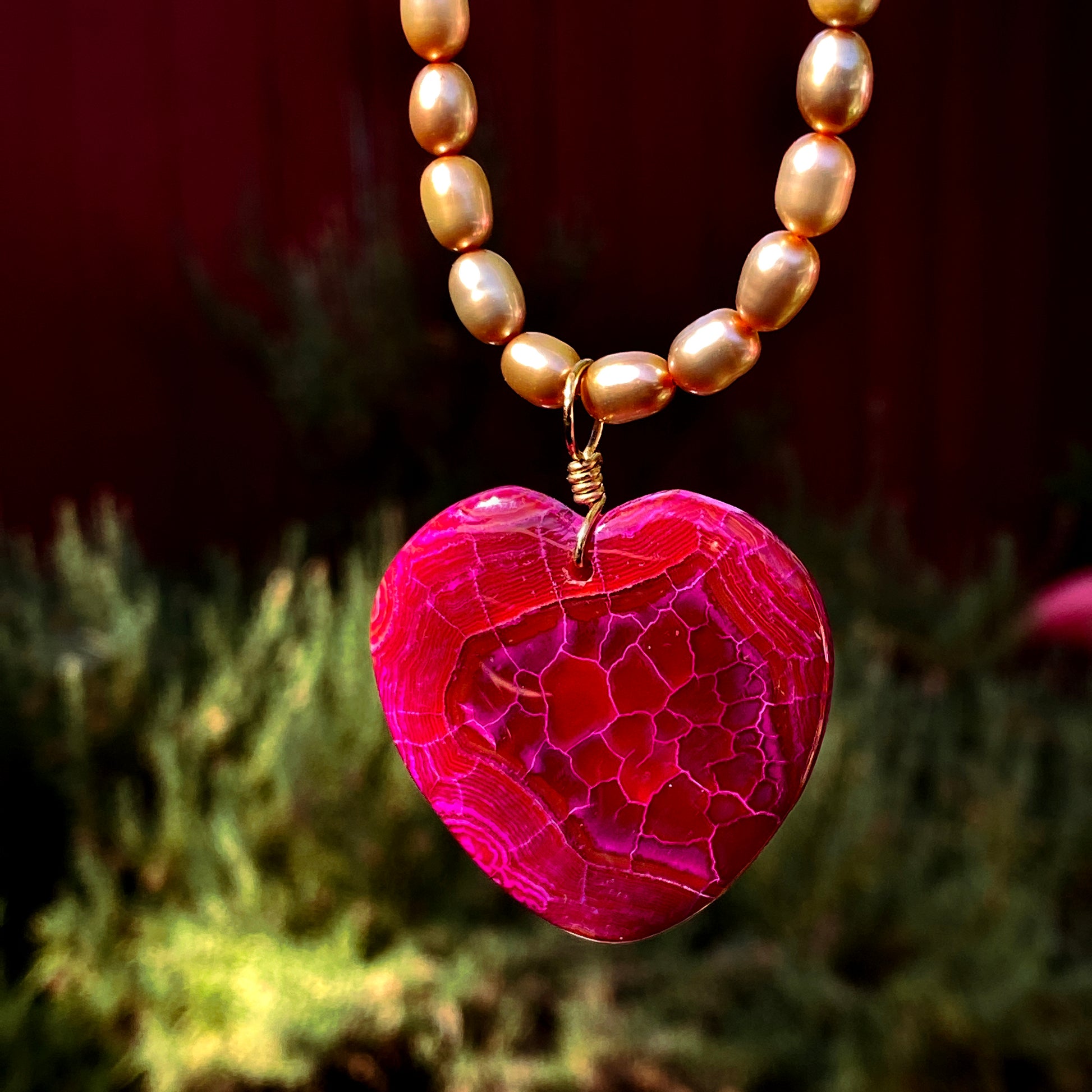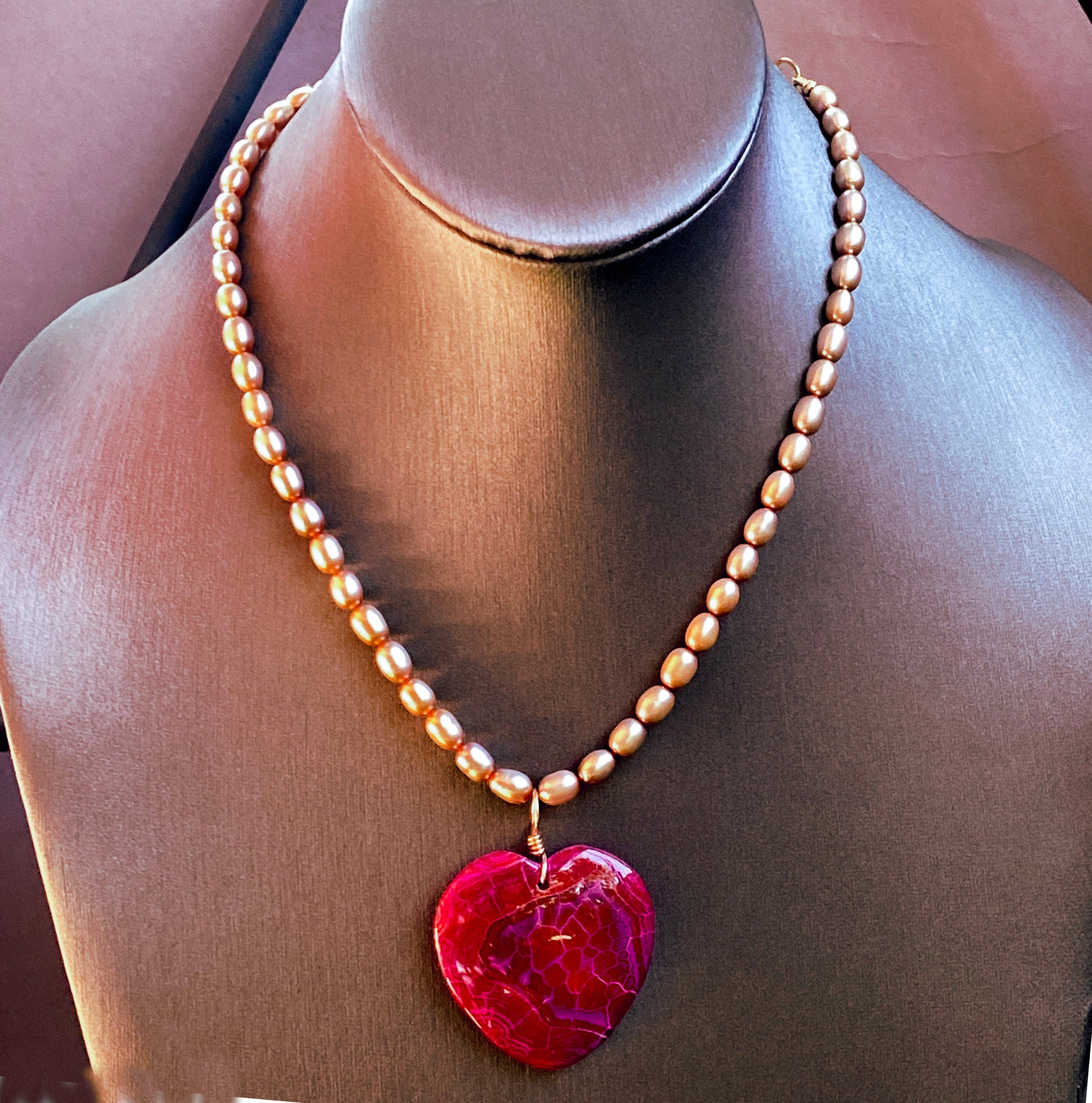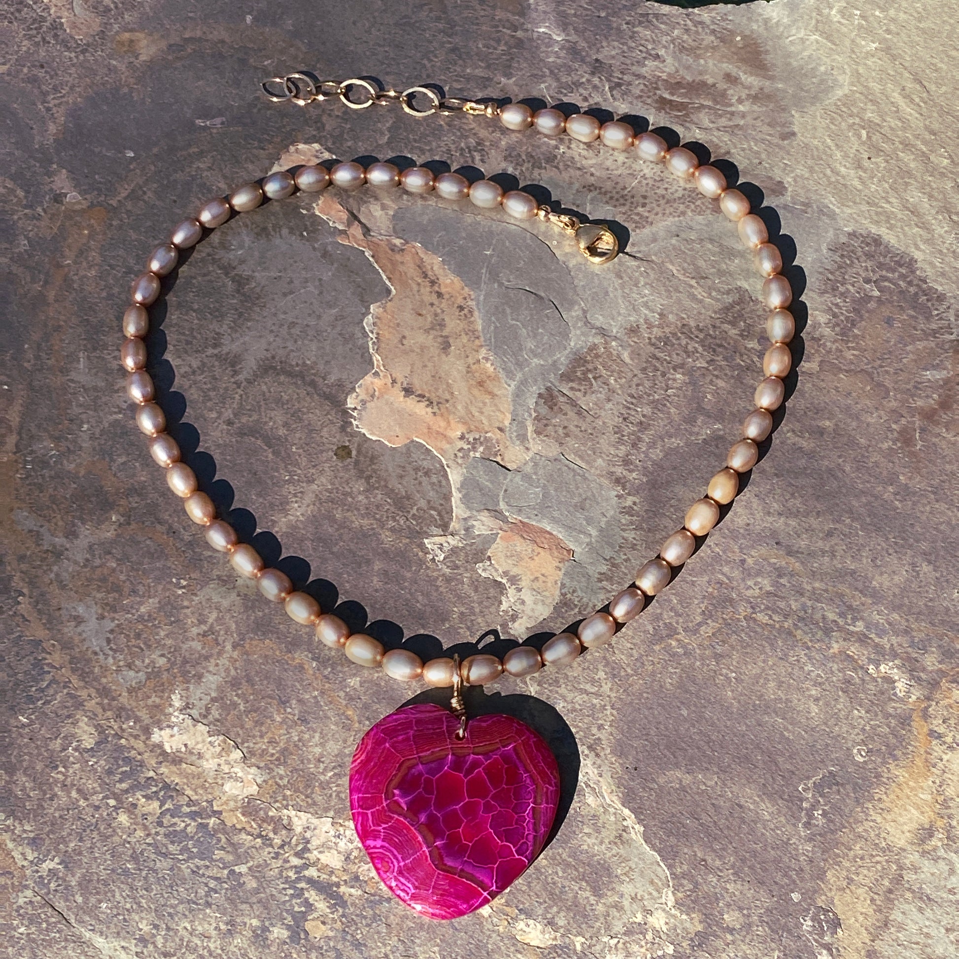Authentic Freshwater Pearl Necklace with Dragons Vein heart and 14 kt Gold Filled Metal components.