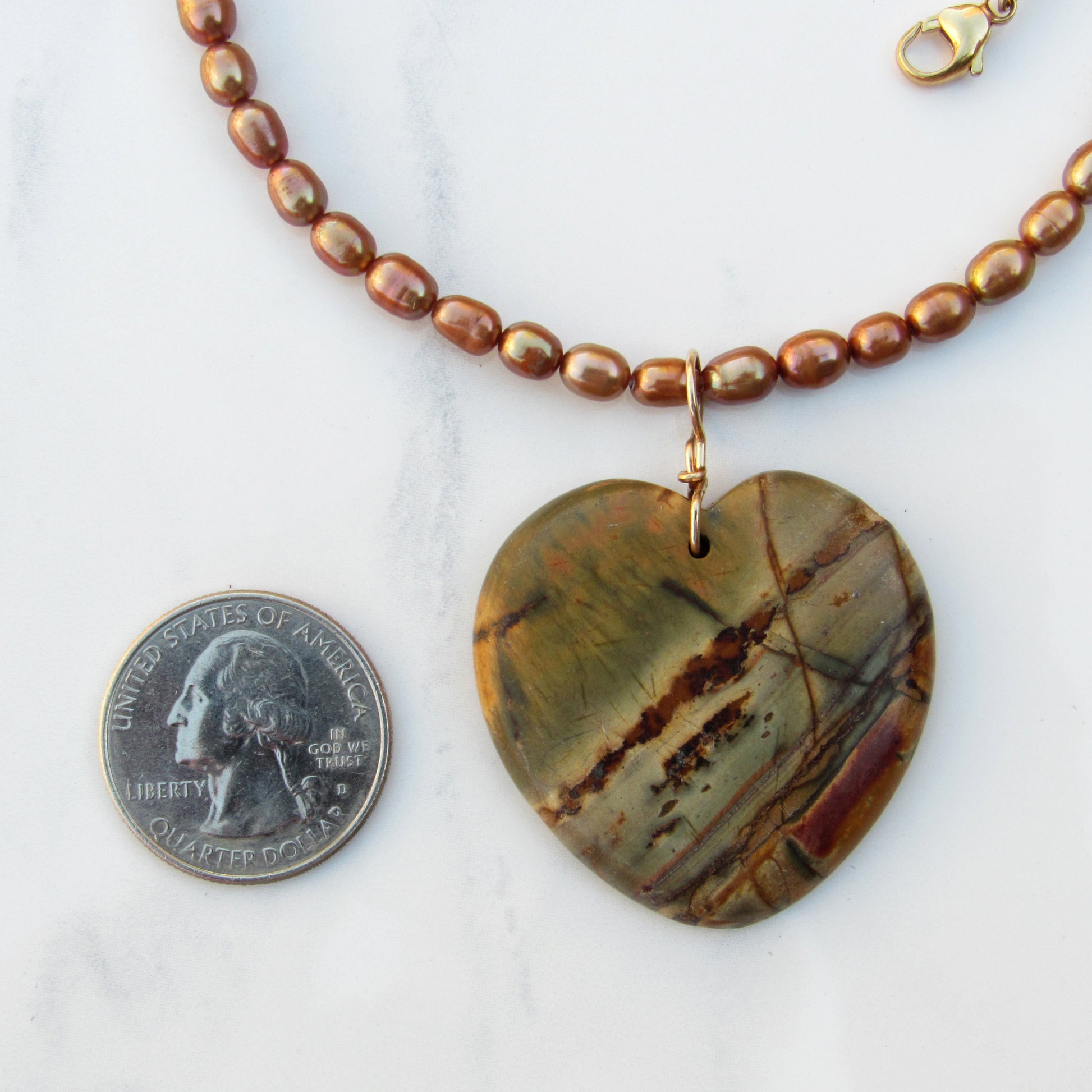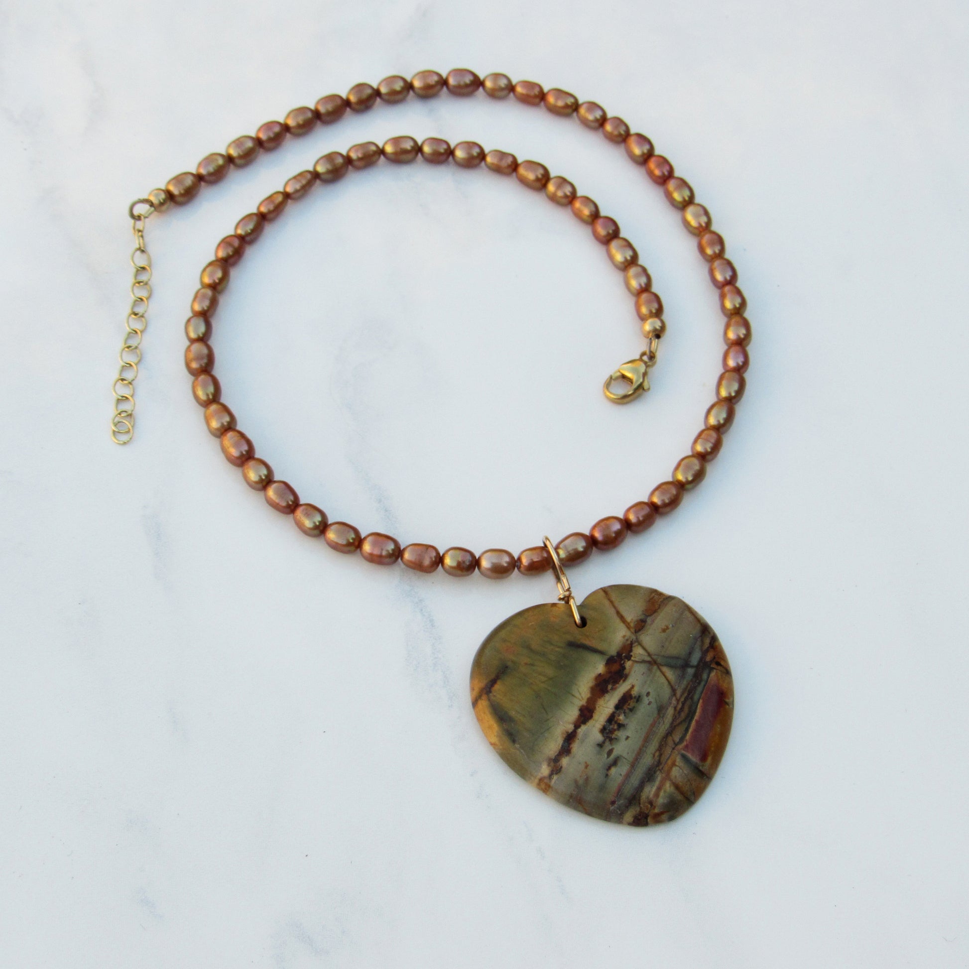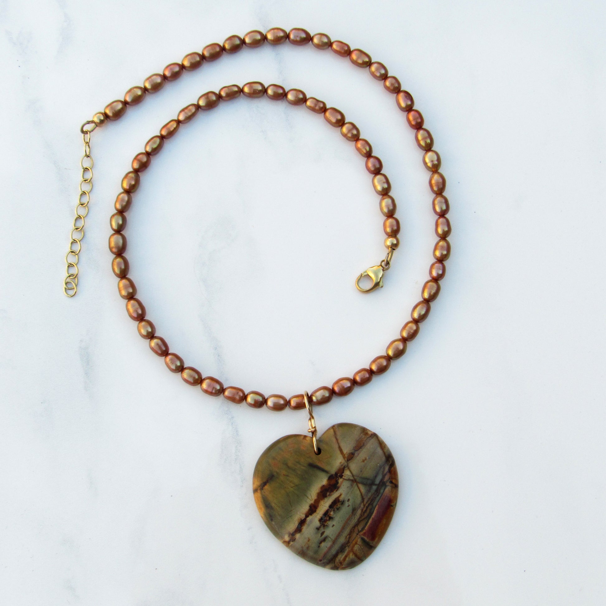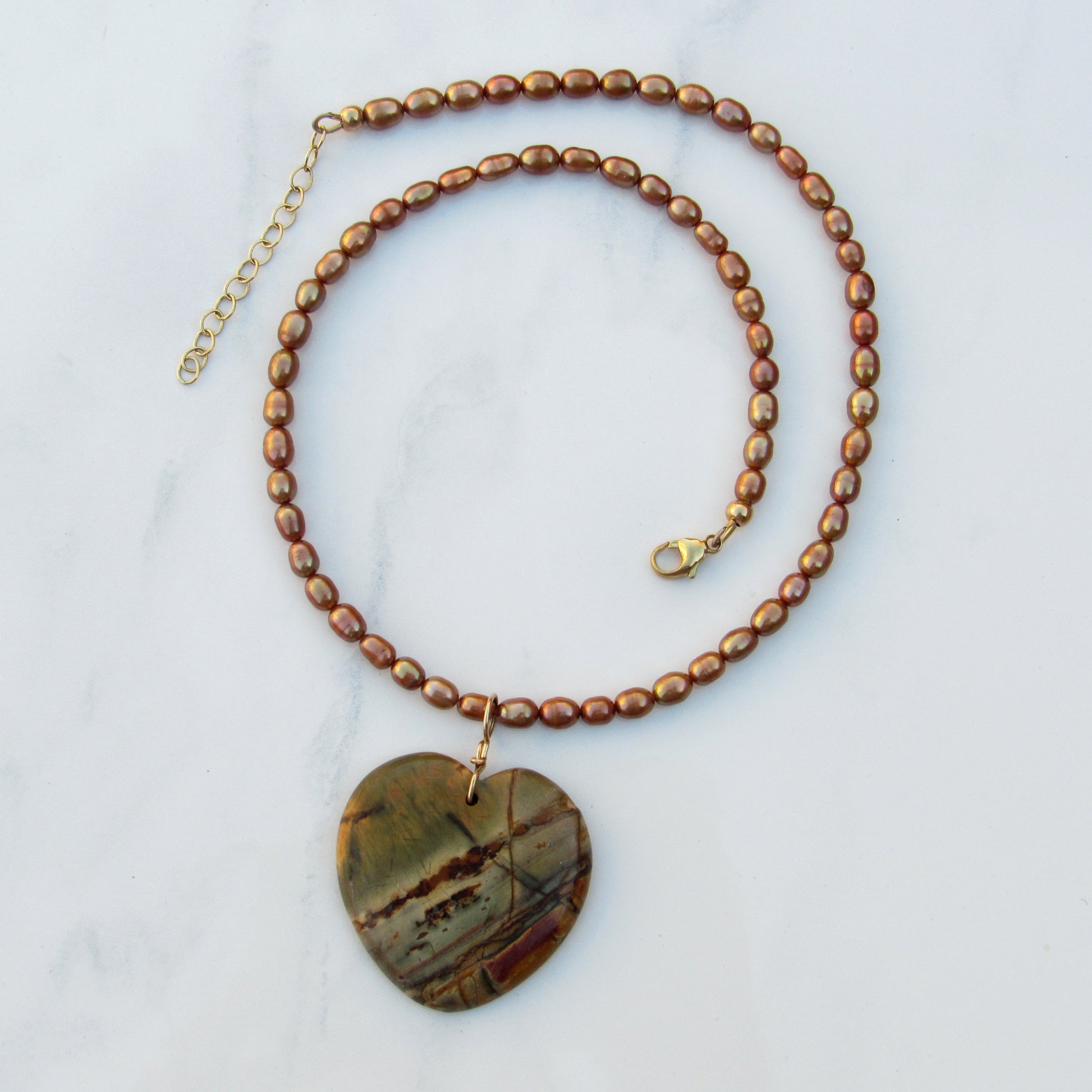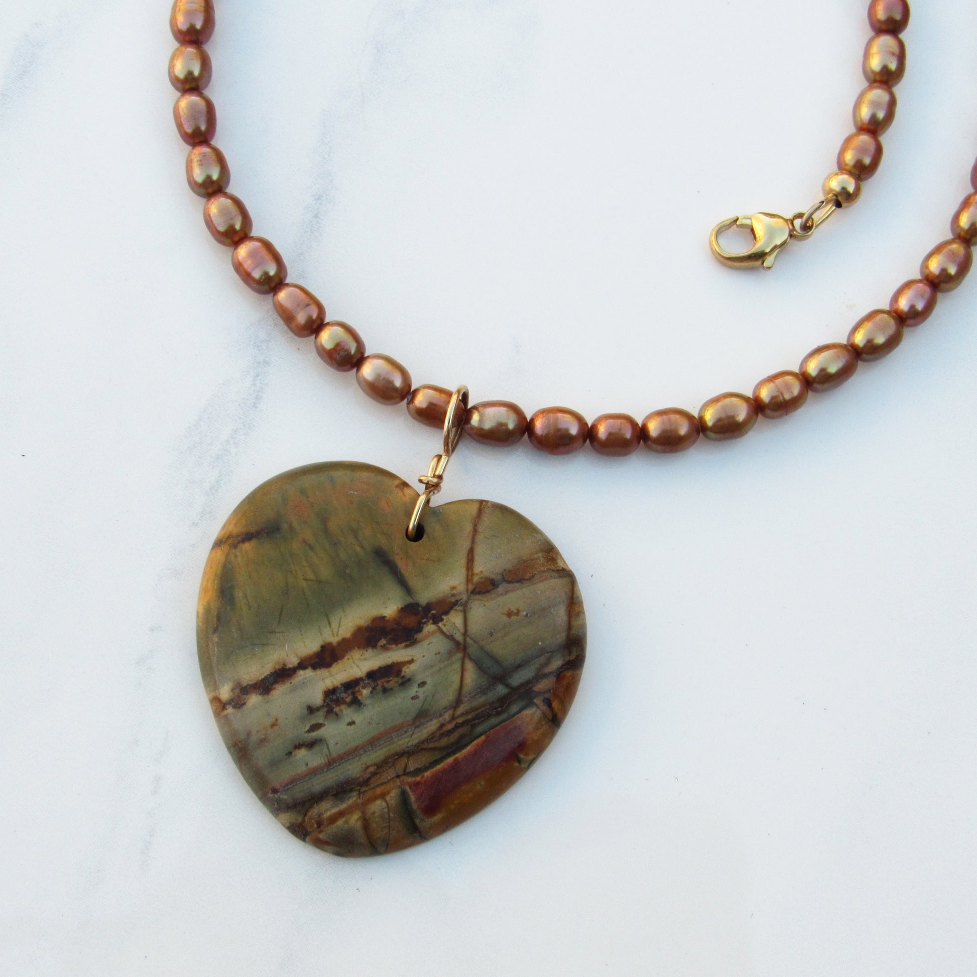 genuine freshwater pearls with genuine Picasso Jasper gemstone heart with 14 kt gold fill.