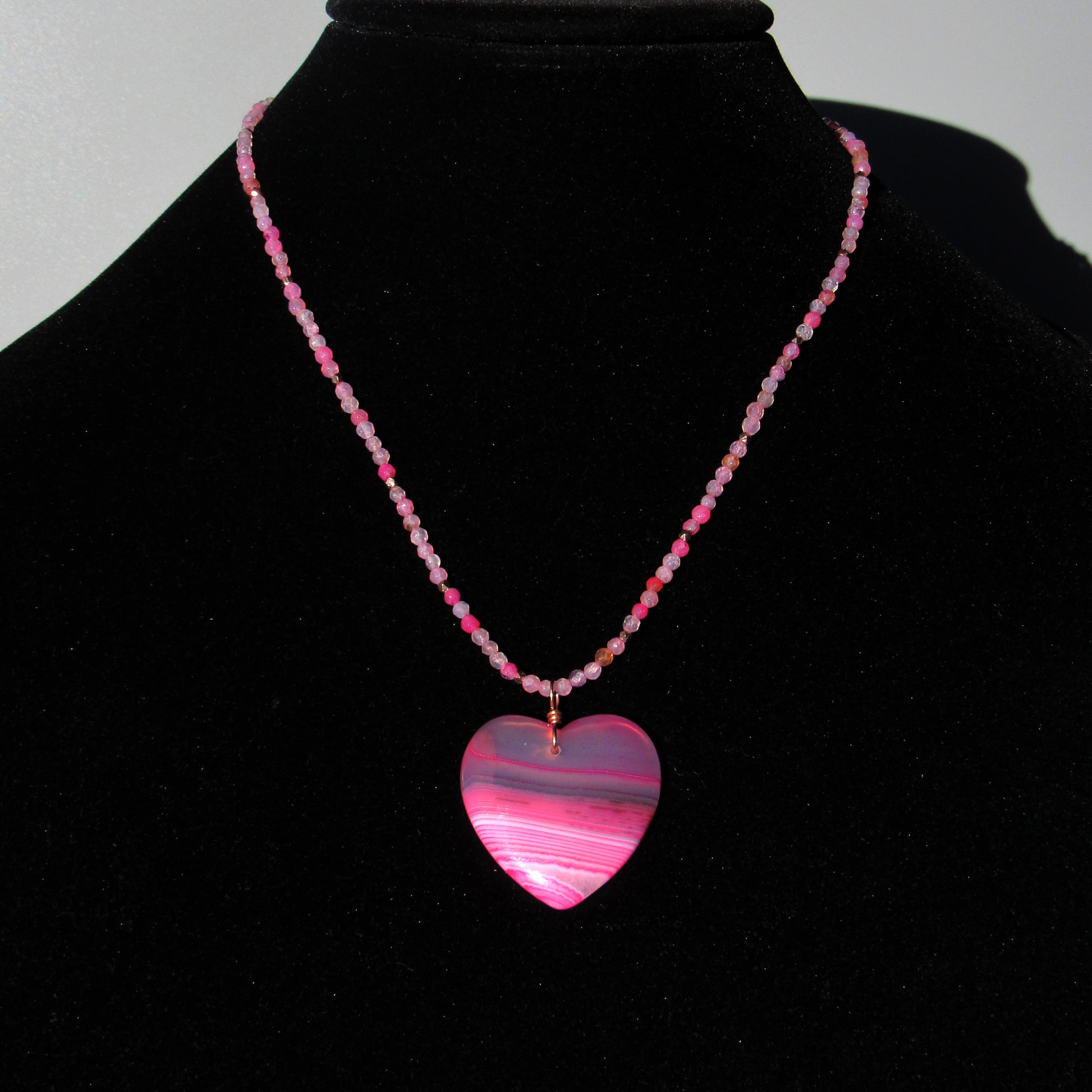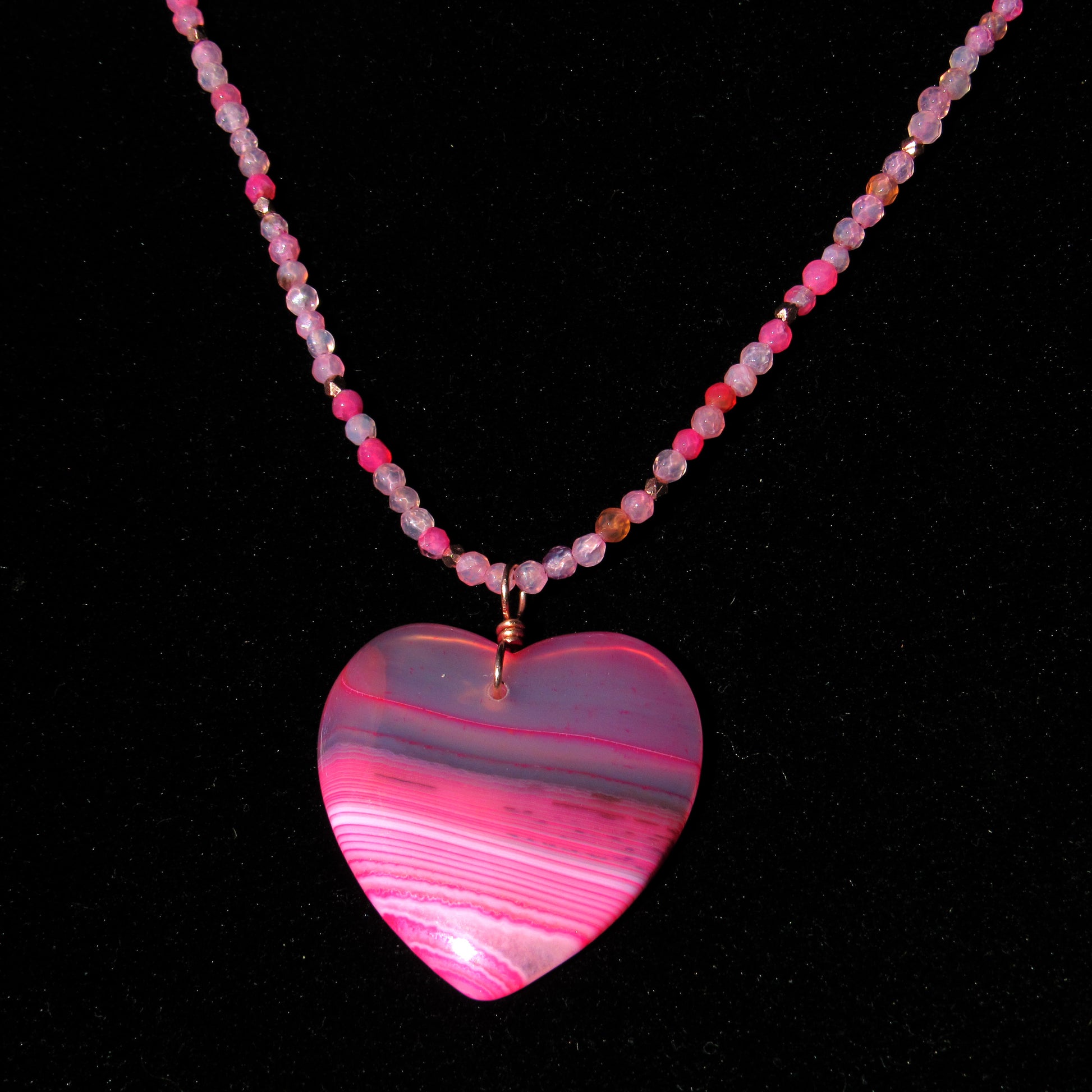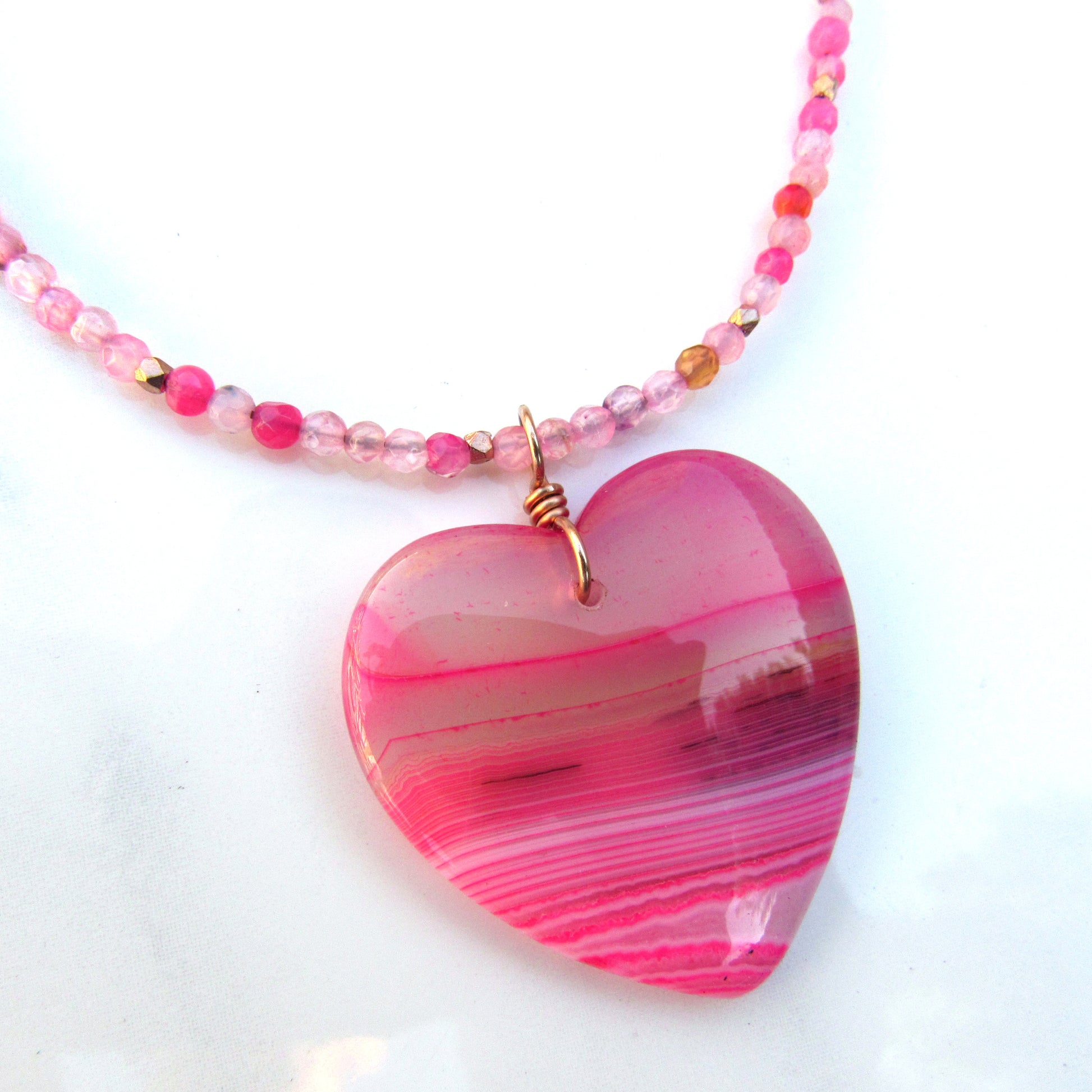 Pink Banded Agate gemstone Heart on pink agate necklace