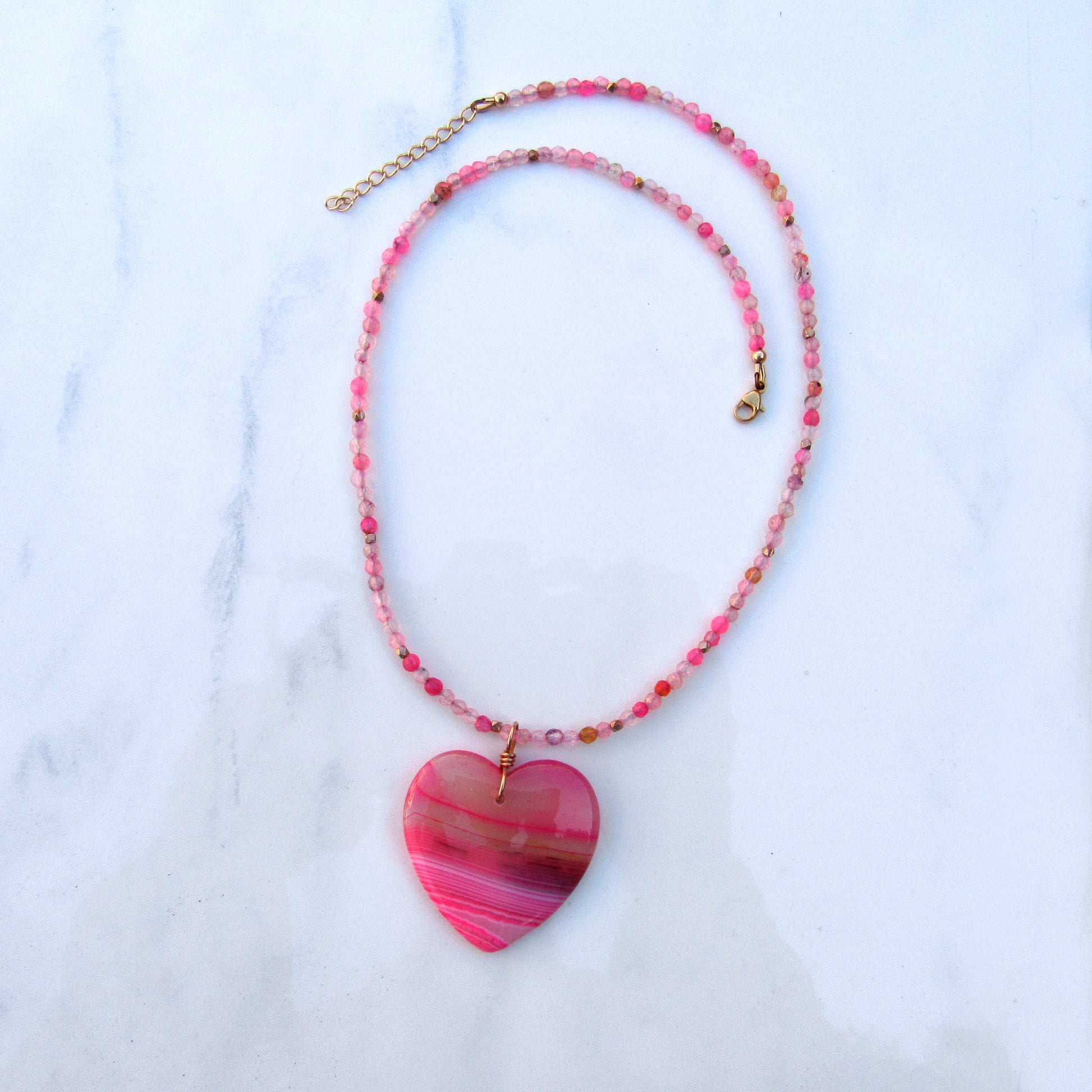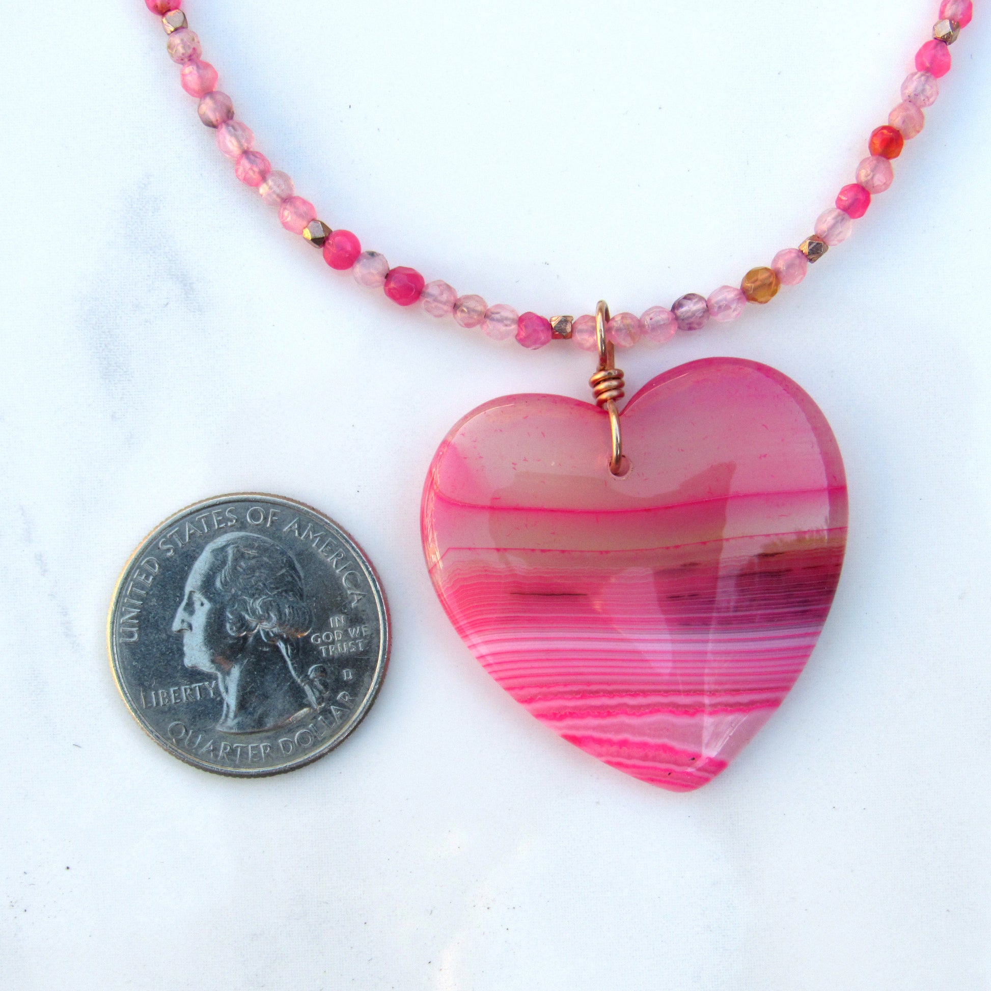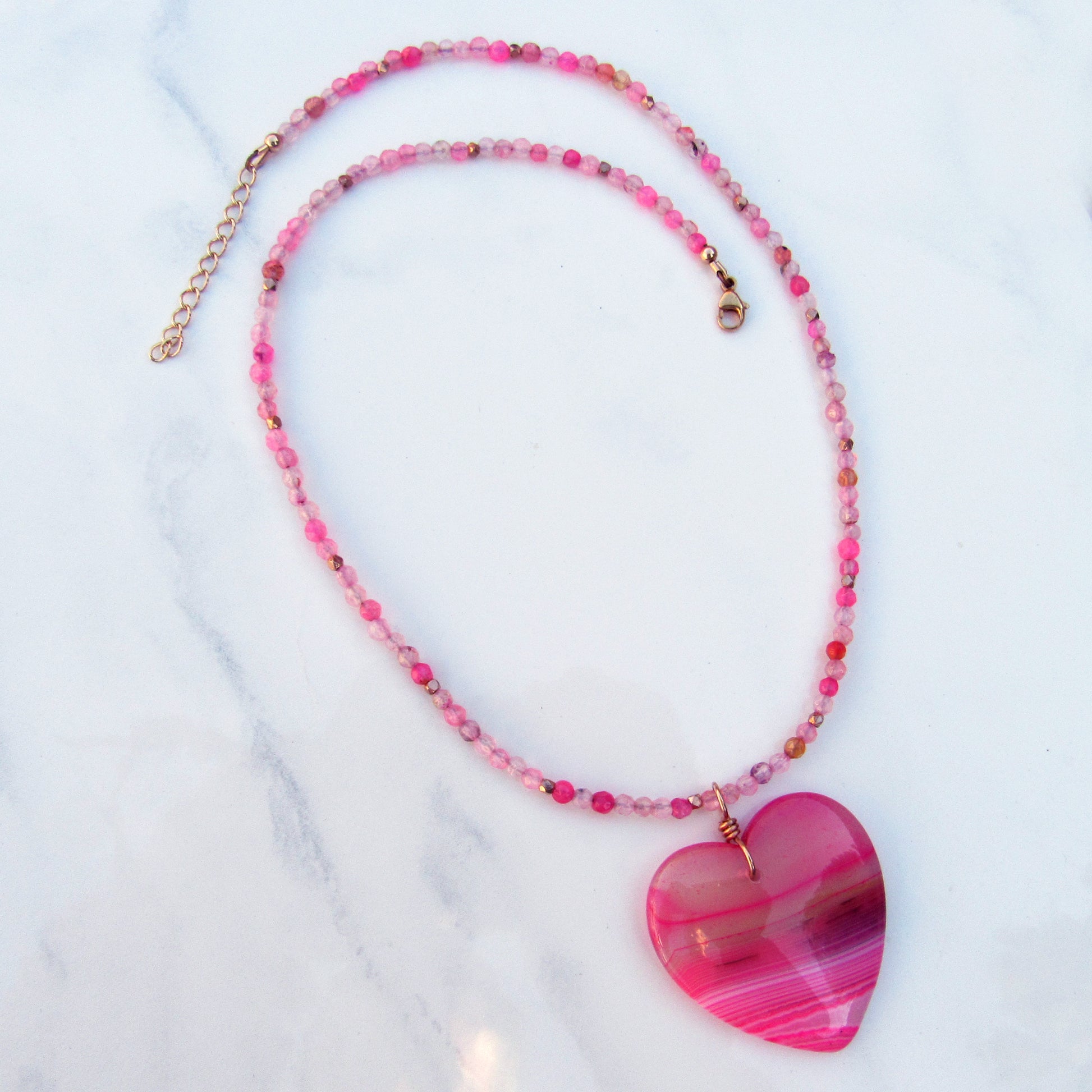 Pink Banded Agate gemstone Heart on pink agate necklace