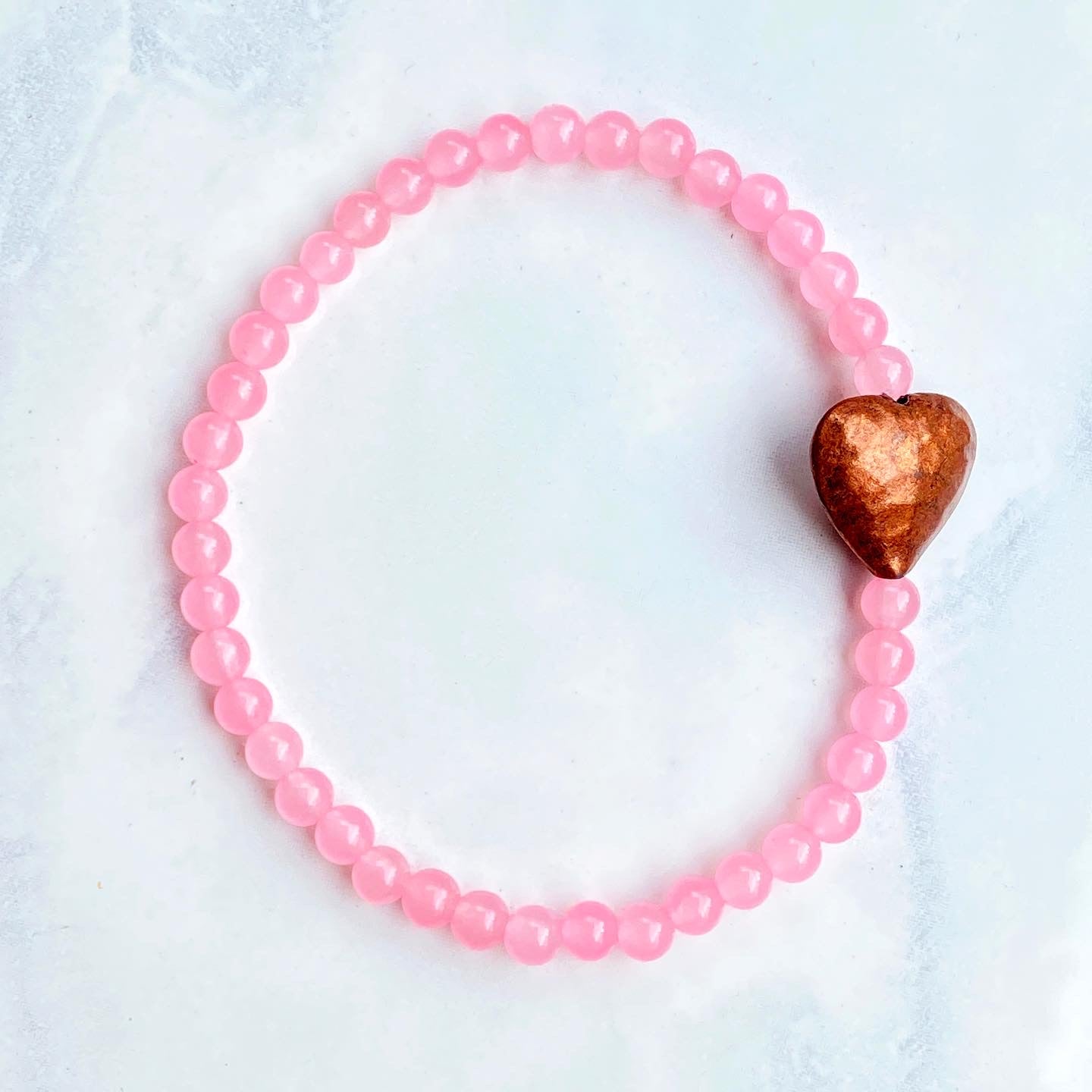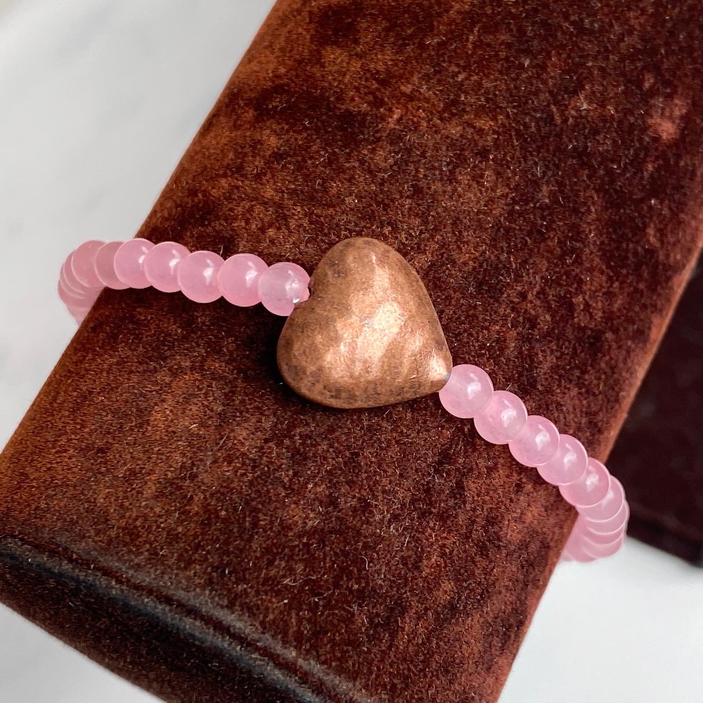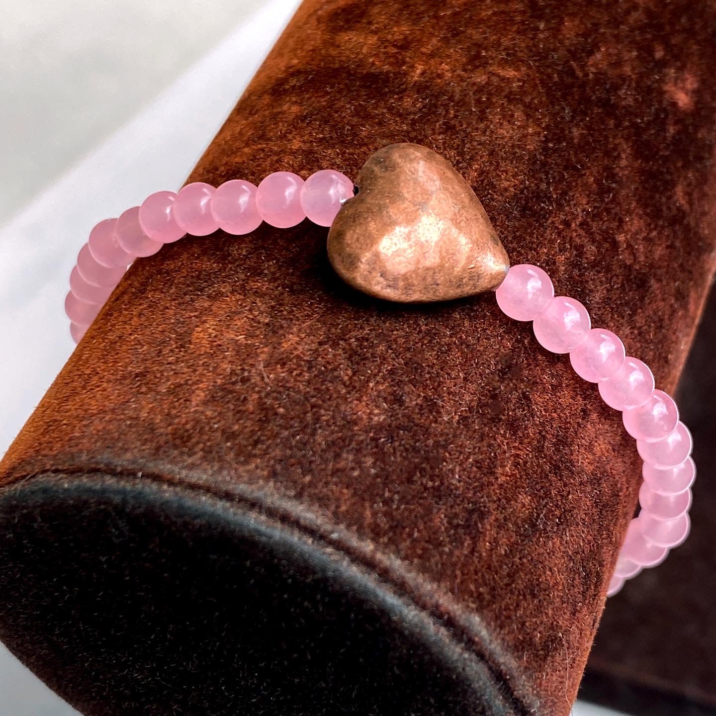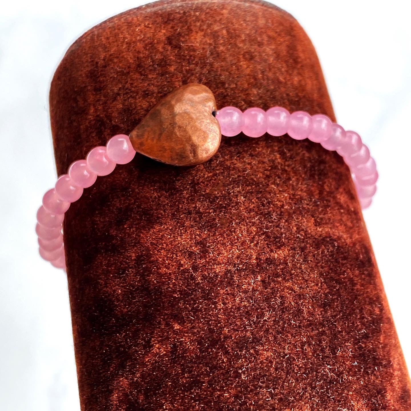Chose from Rose Quartz or Pink Agate gemstones with genuine copper heart 7" stretch bracelet