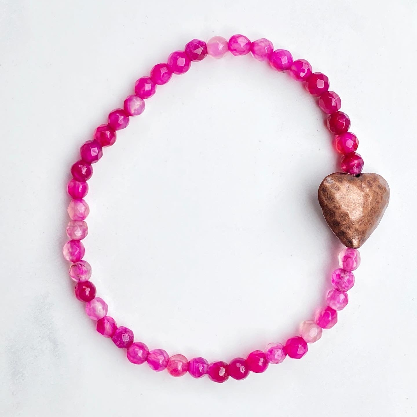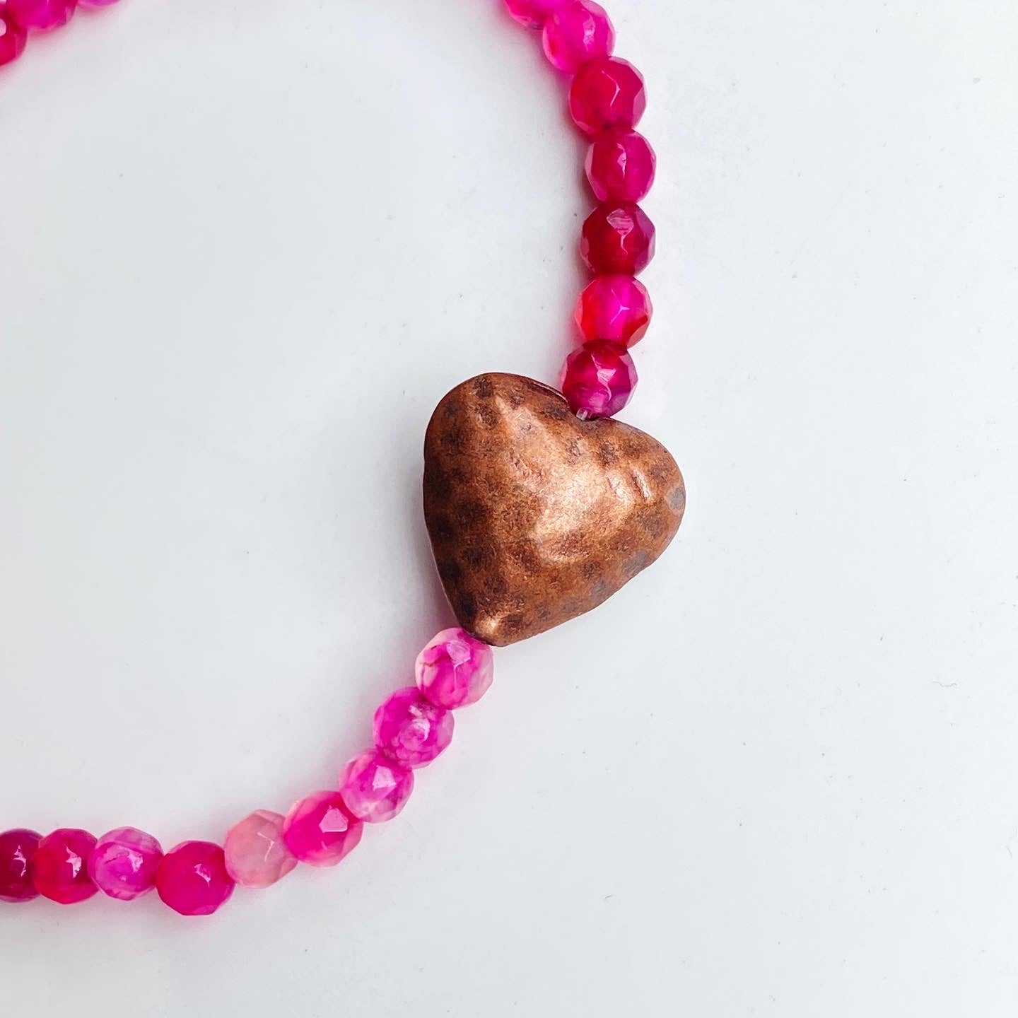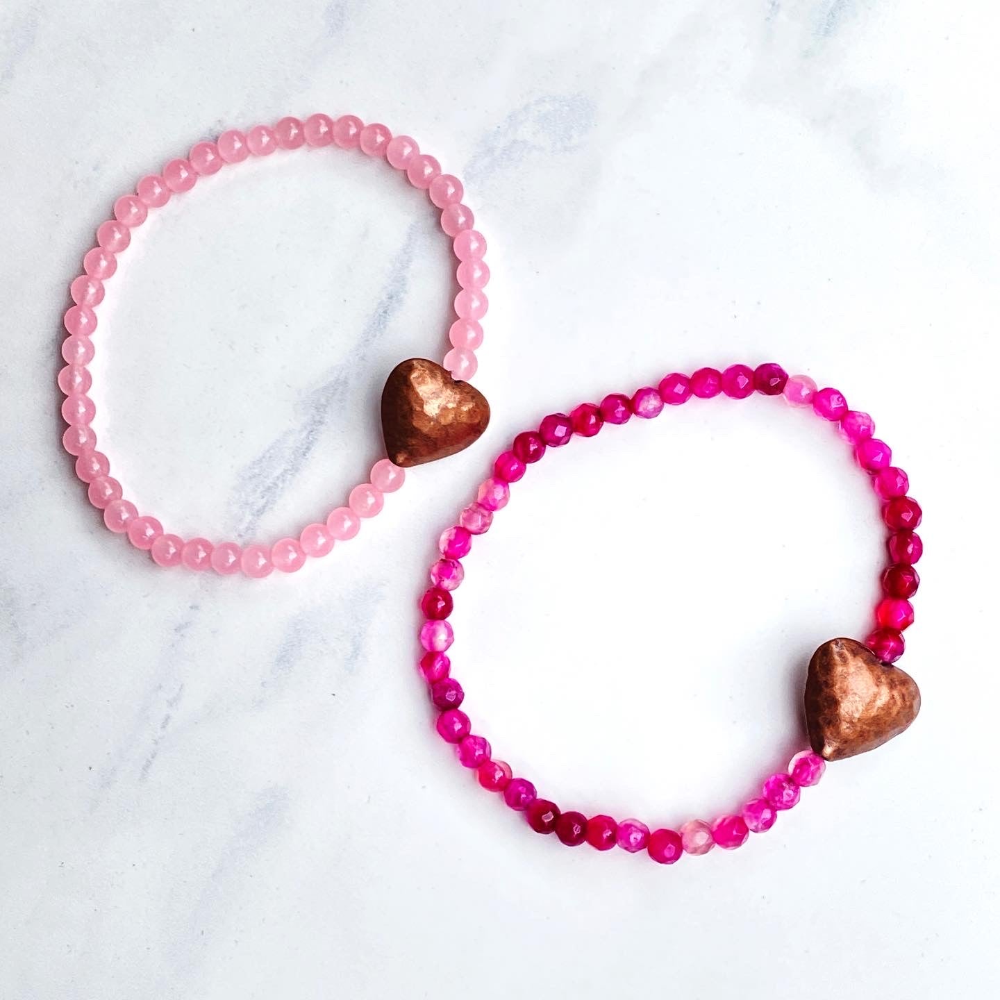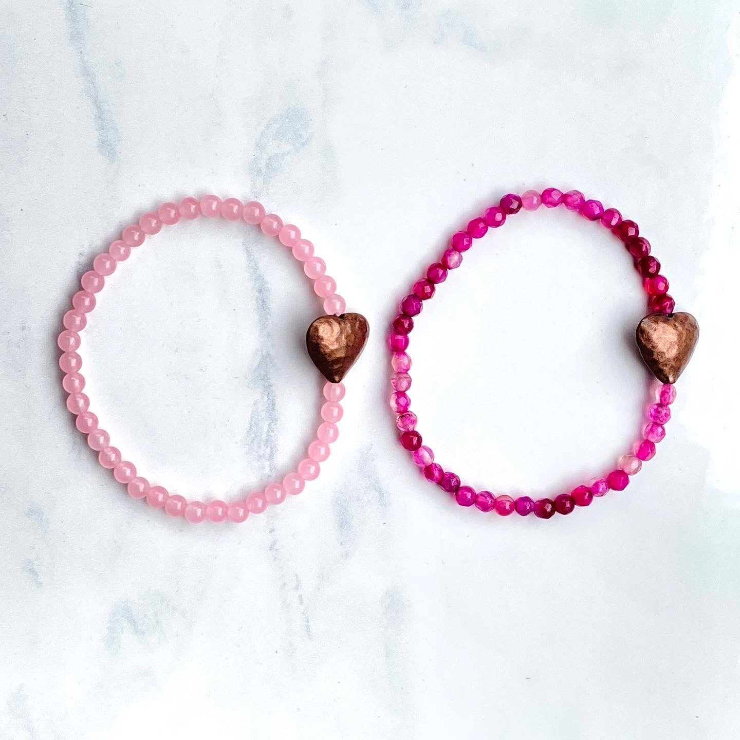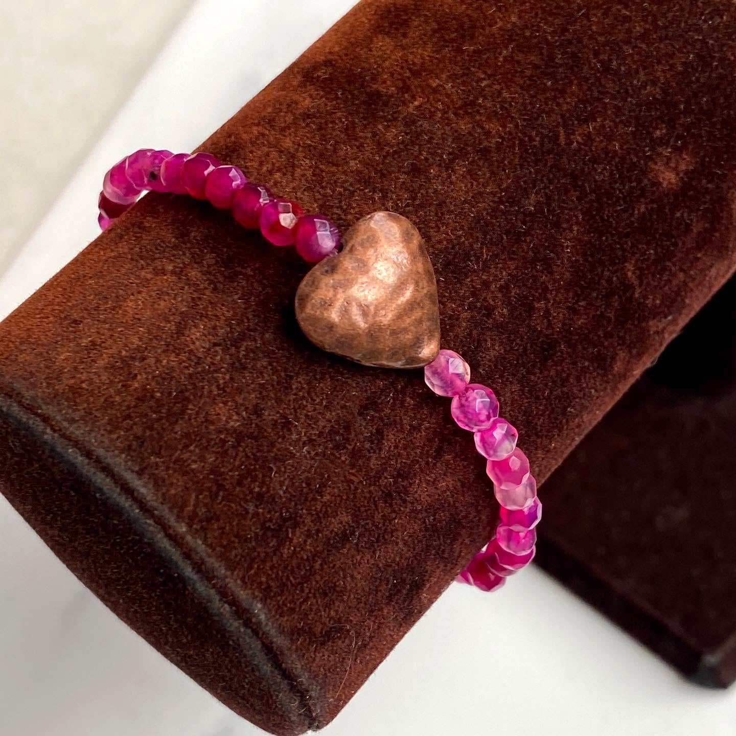 Chose from Rose Quartz or Pink Agate gemstones with genuine copper heart 7" stretch bracelet
