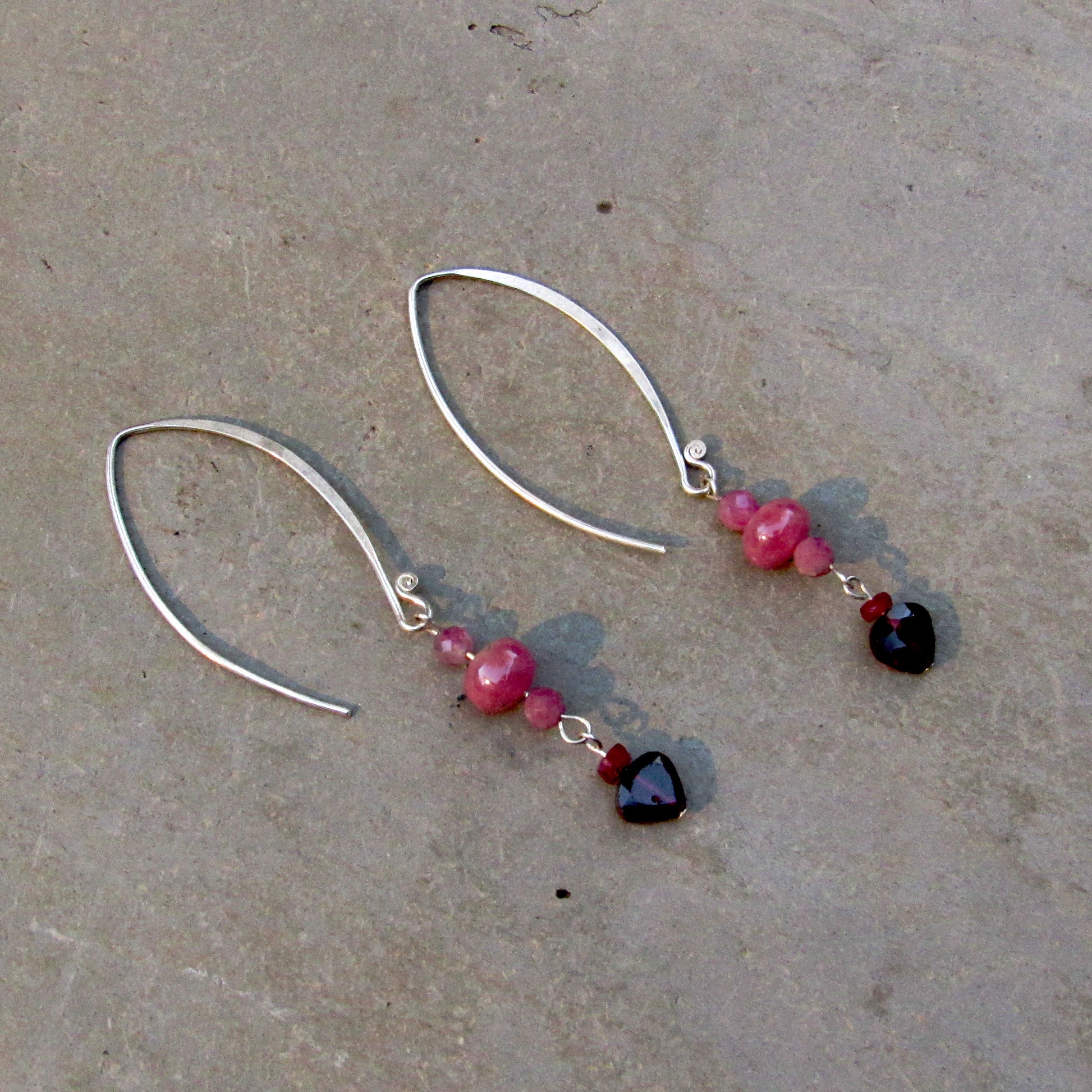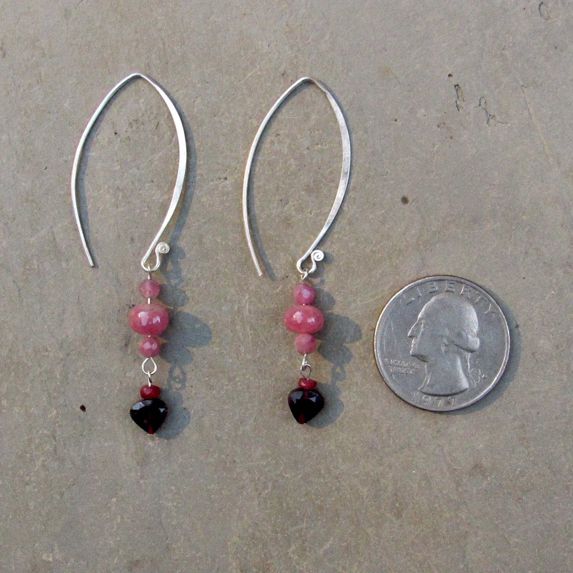 Pink Sapphires, Pink Tourmaline, Red Rubies, and Garnet Hearts w/ Sterling Silver Drop Earrings 1.6 inches long with a 1.1 inch drop