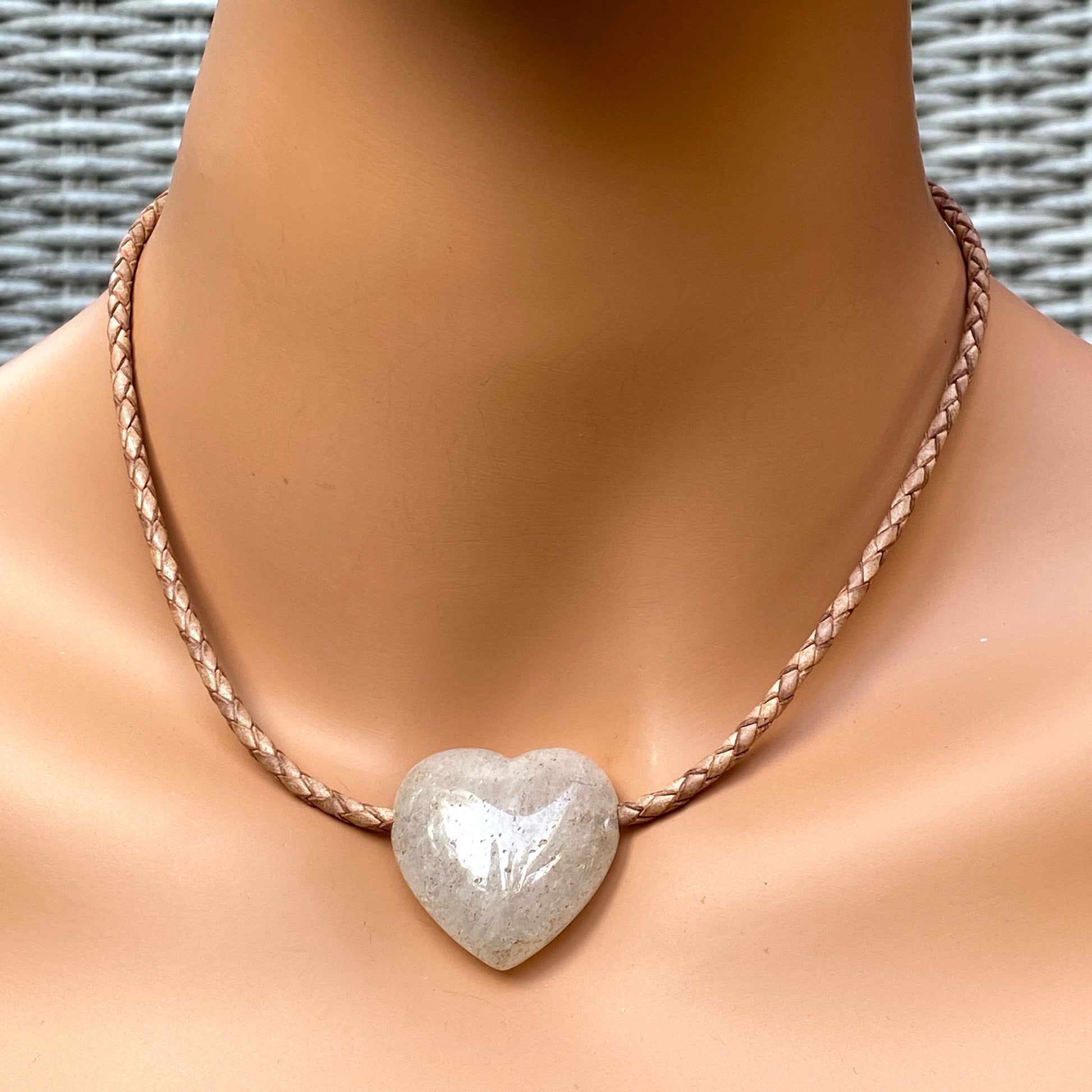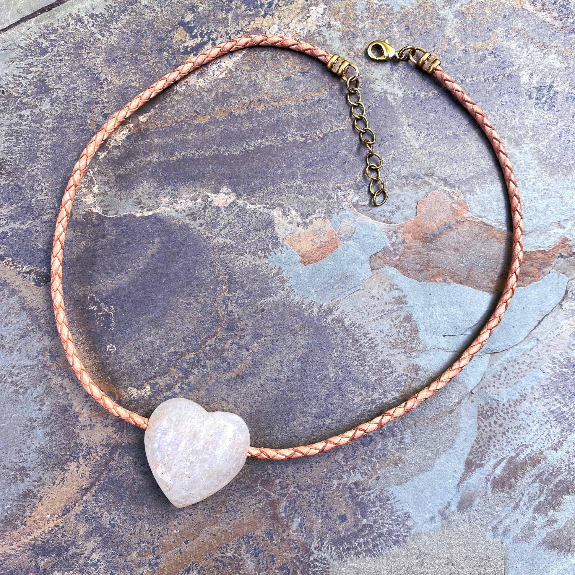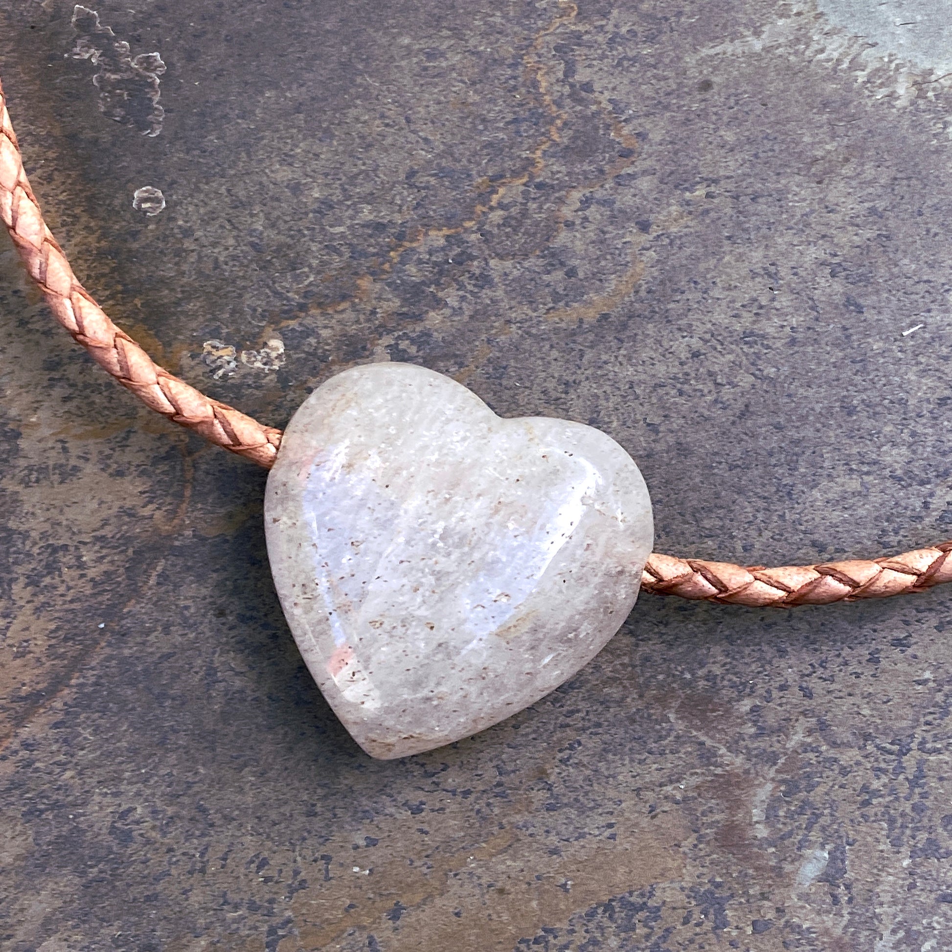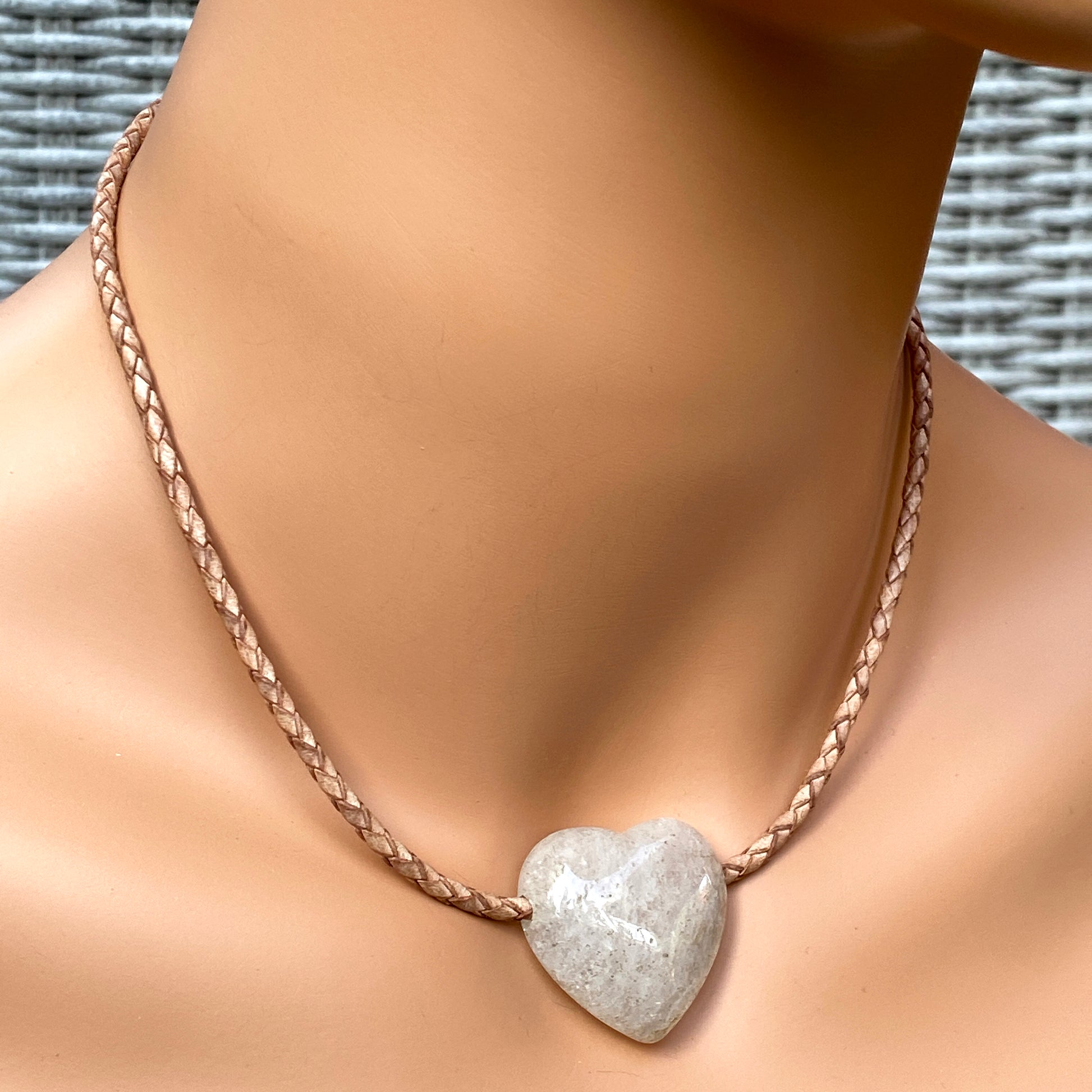 Quartz gemstone Heart on Braided Leather with Brass Clasp and Chain