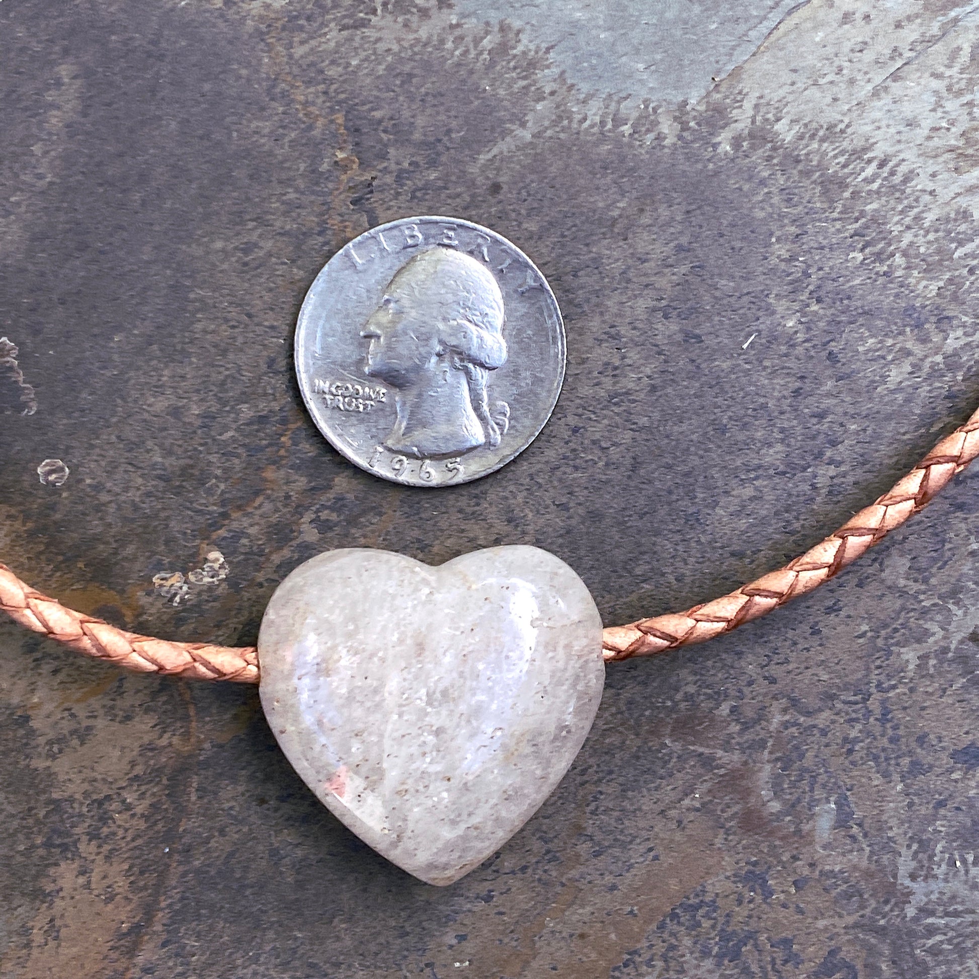 Quartz Gemstone Heart on Braided Leather with Brass Clasp and 1.5" Chain 18" total length