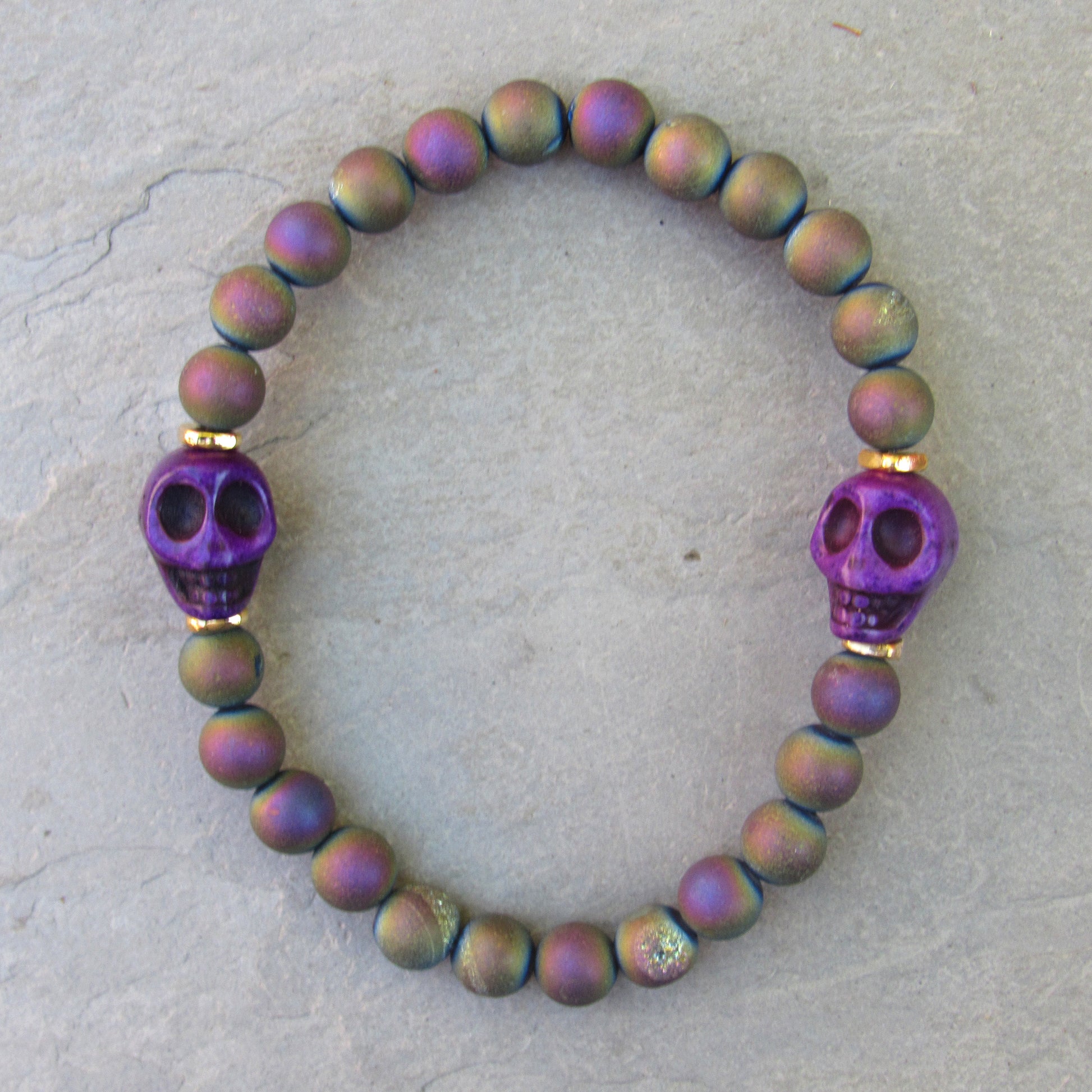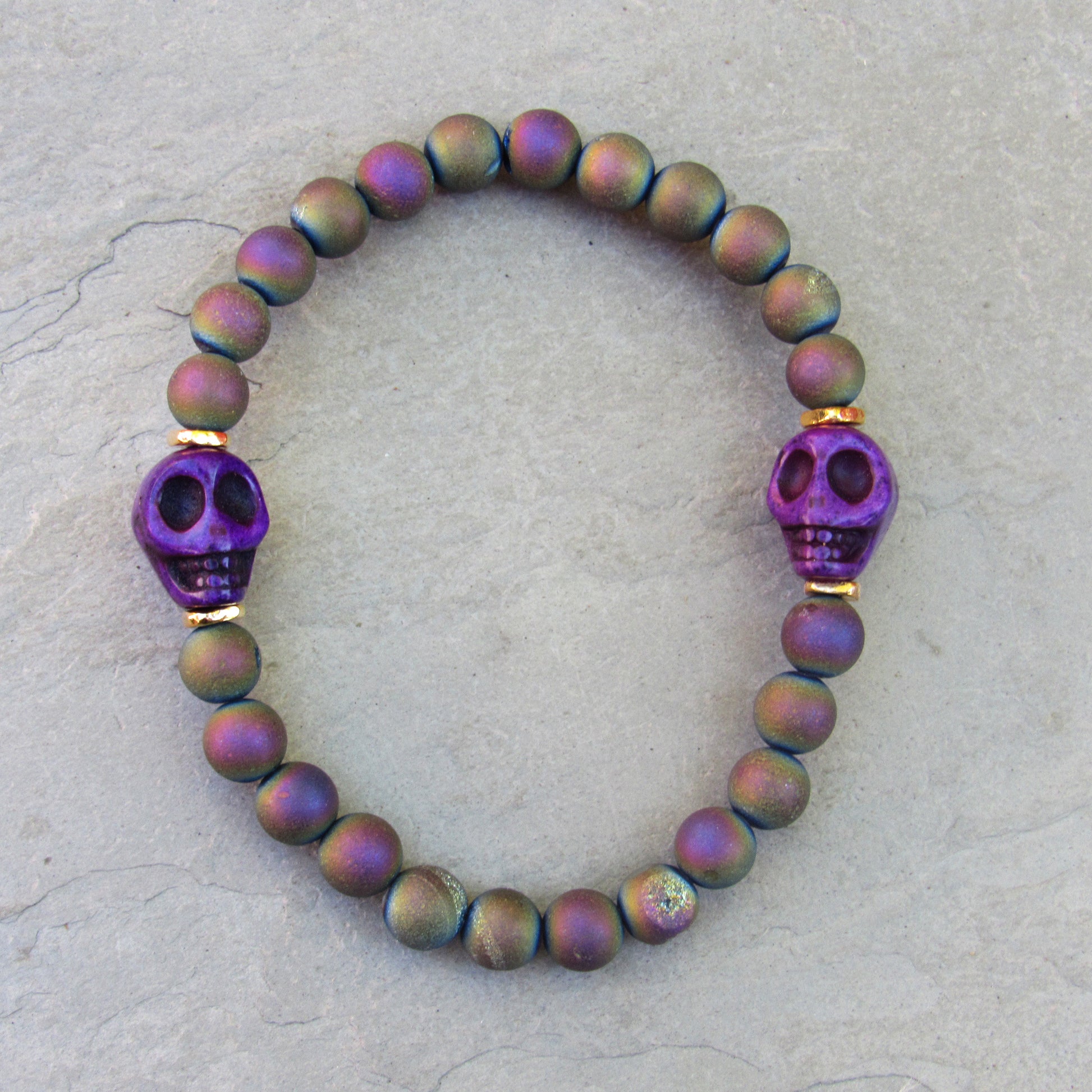 Rainbow Druzy Agate gemstones, Howlite Skulls, 24 Kt Gold Vermeil over Sterling Silver Women’s Stretch Bracelet