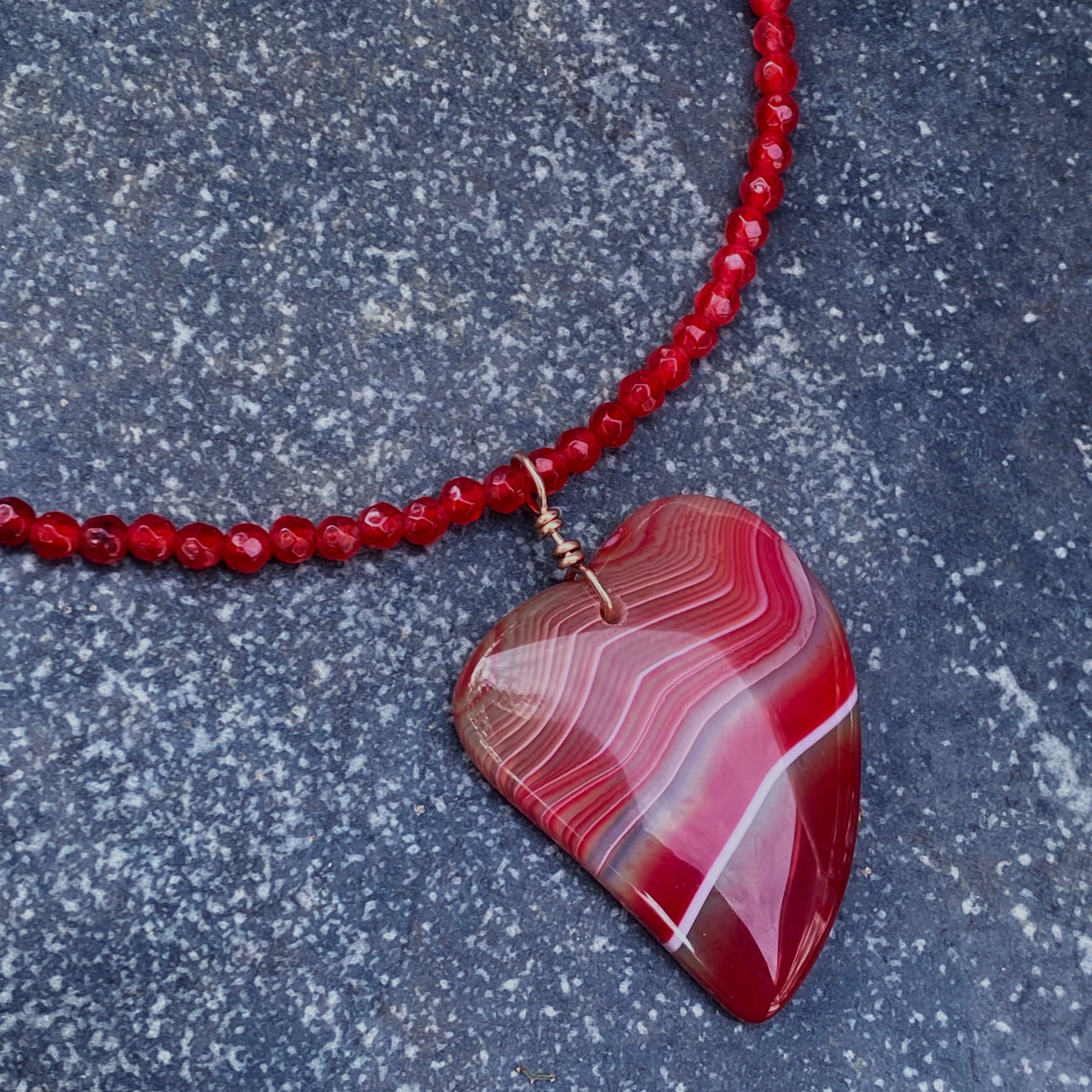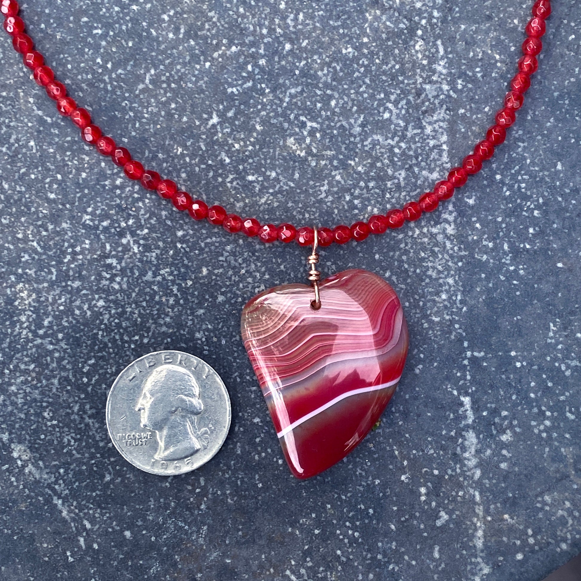 Red Banded Agate Heart Pendant on Beaded Red Agate Necklace with 14 Kt Rose GF Hand Wrap