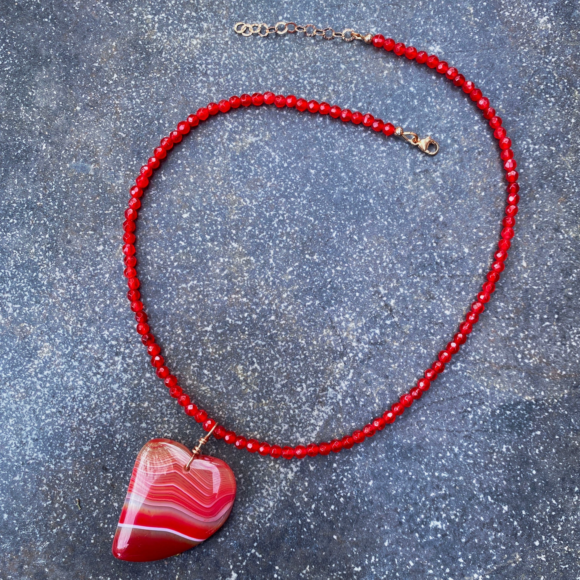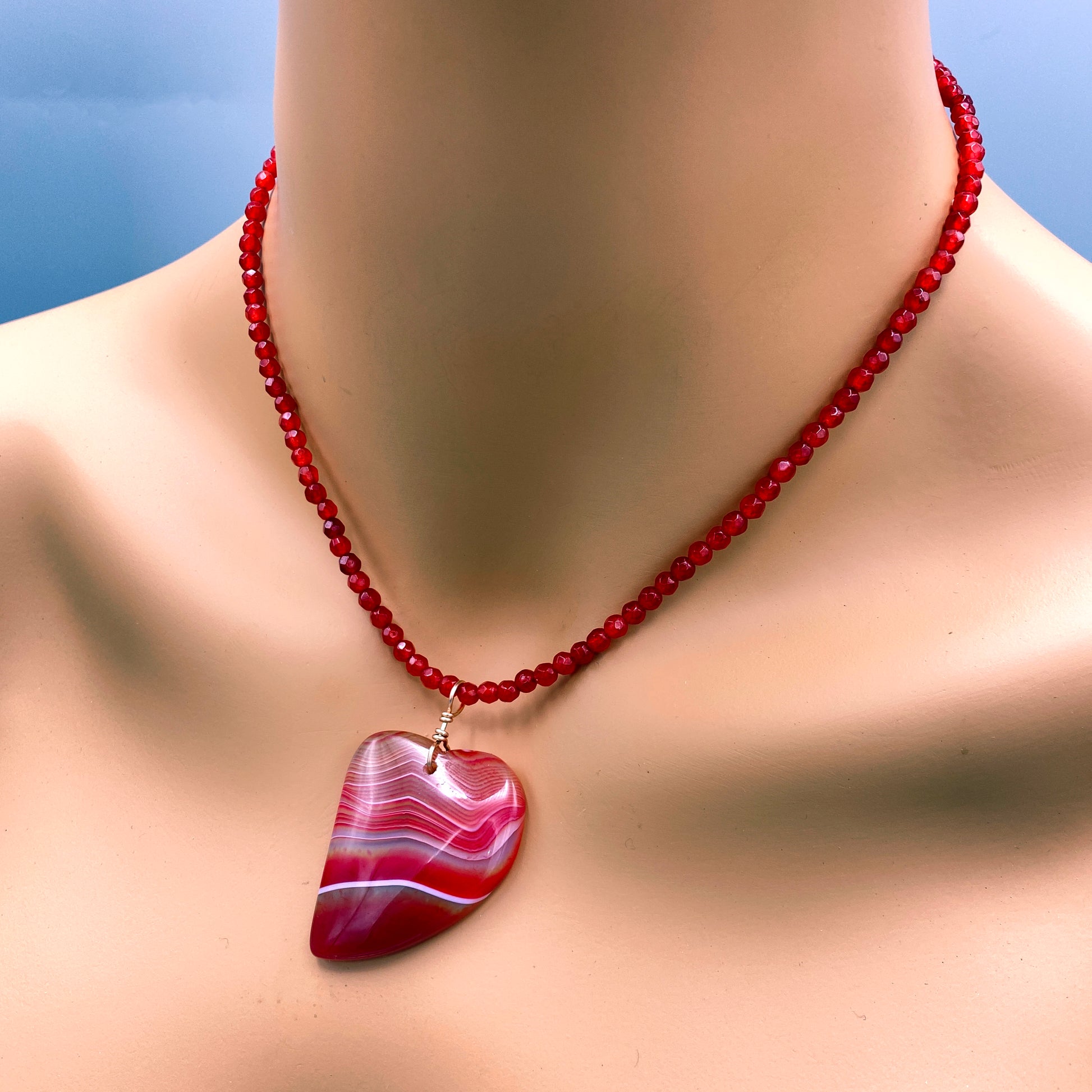 Red Banded Agate Gemstone Heart Pendant on Beaded Red Agate Necklace with 14 Kt Rose Gold Fill Hand Wrap 15.5" in length with a 1.5" chain. 17" total length