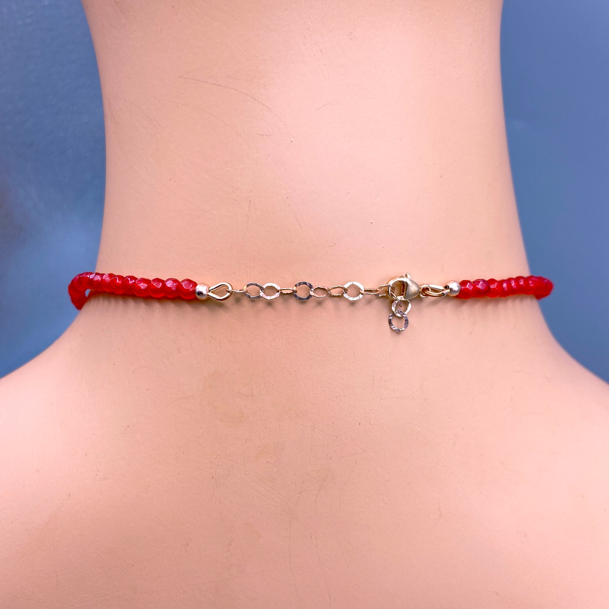 I am the queen of color, but red is one of my favs. This is a red banded onyx agate hand wrapped with 14 kt rose gold fill on a beaded red faceted agate.