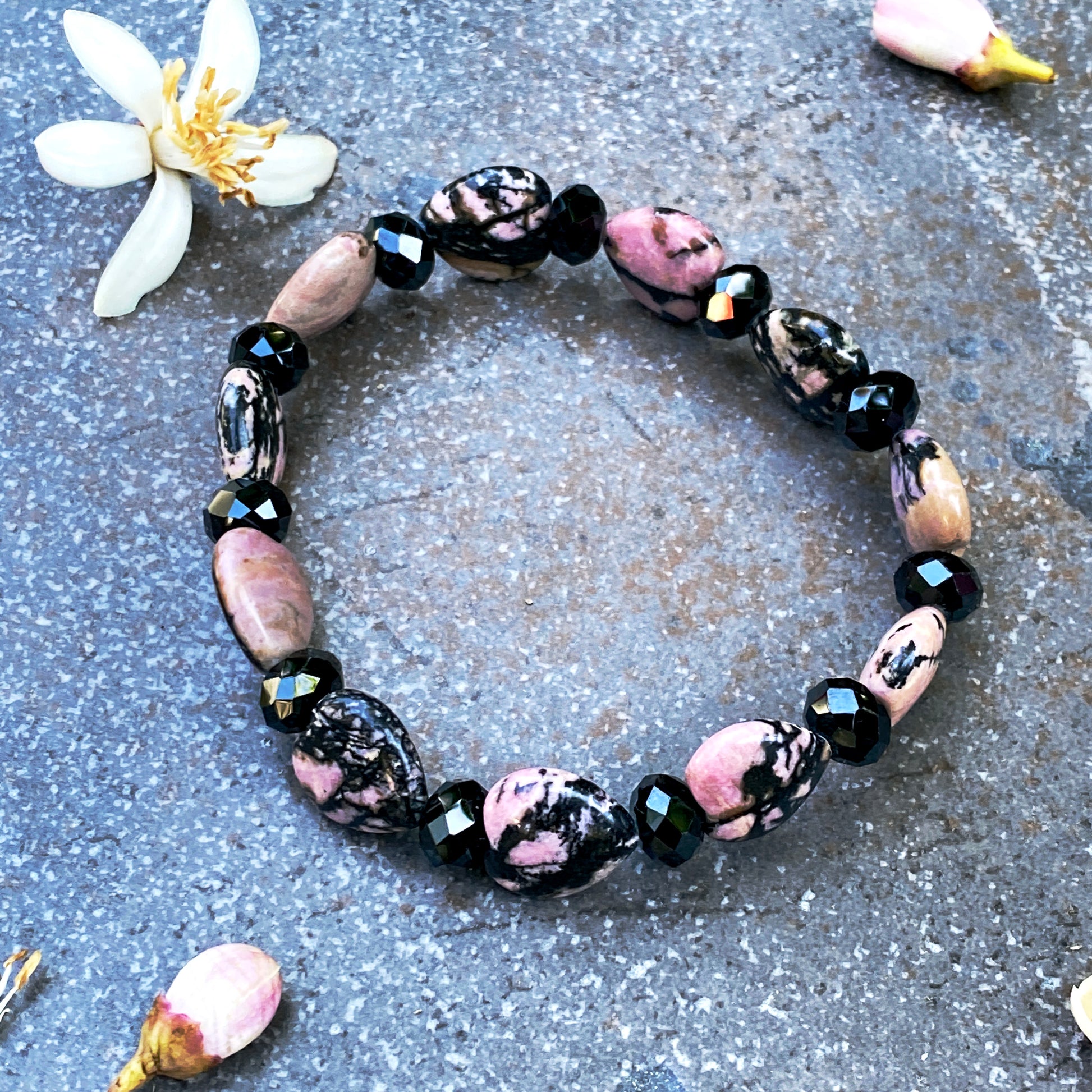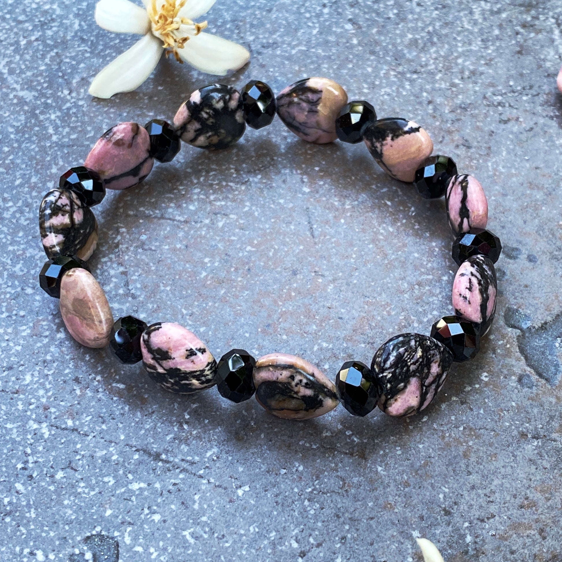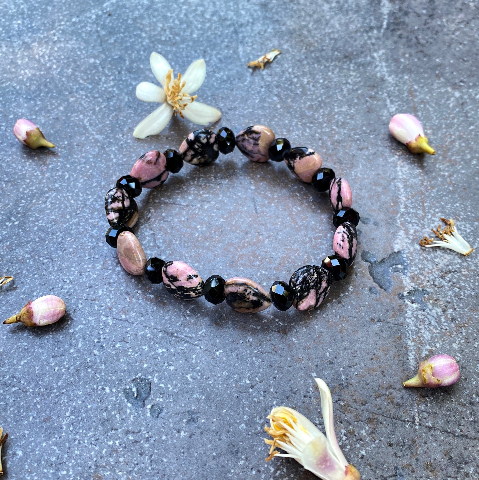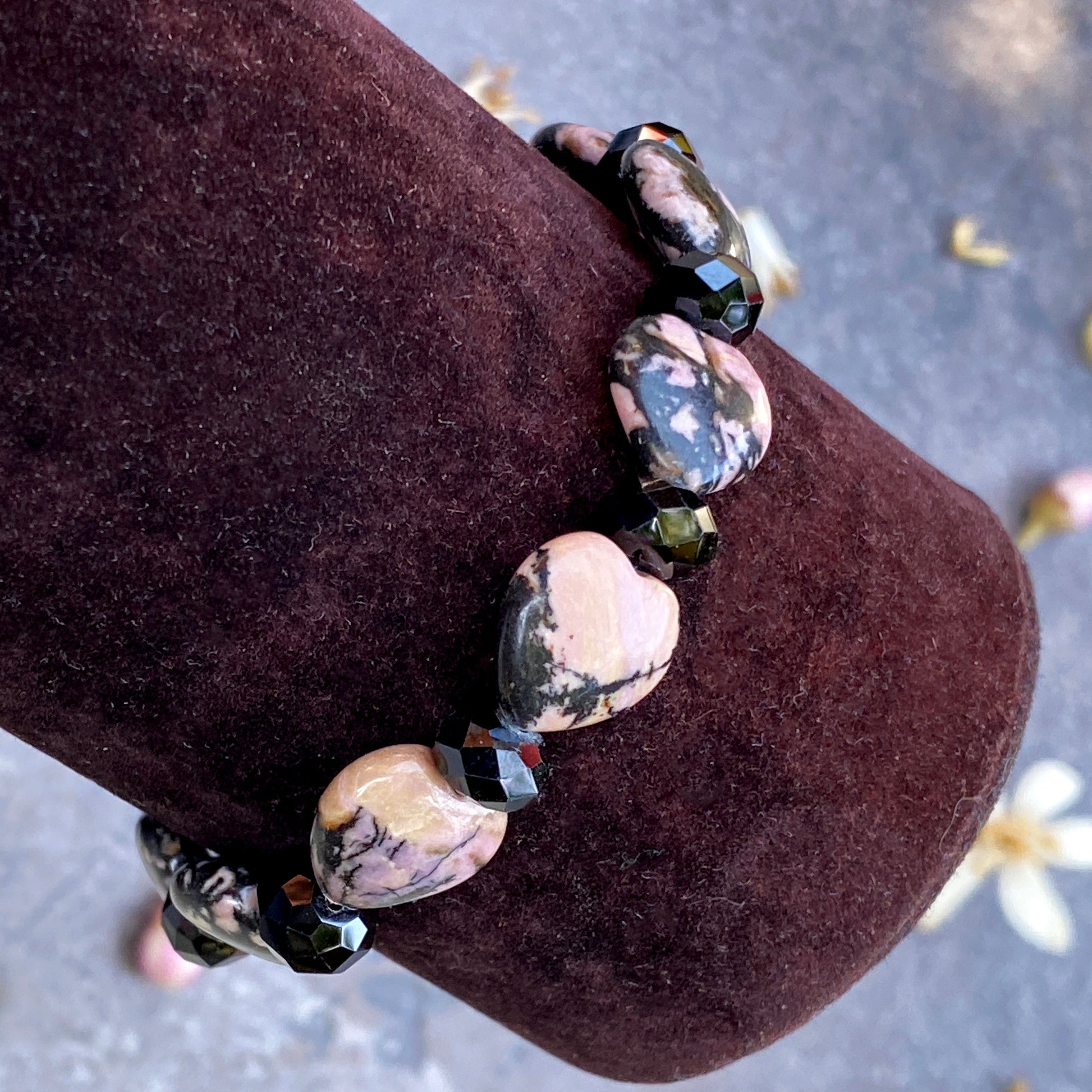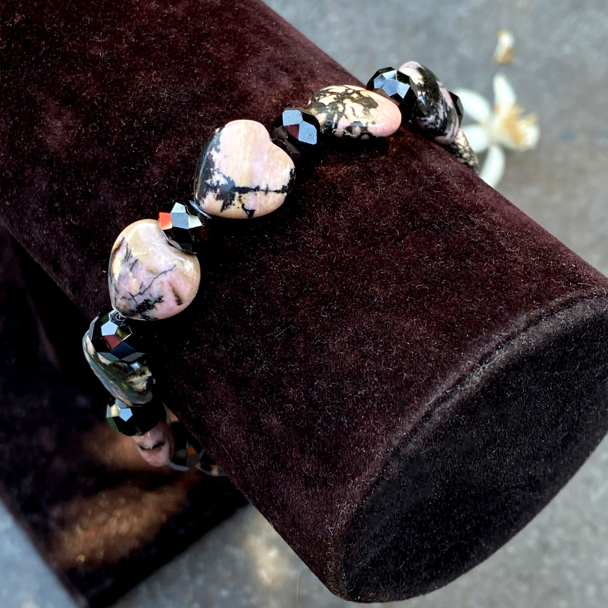 Rhodonite Gemstone Hearts and black Spinel Bracelet
